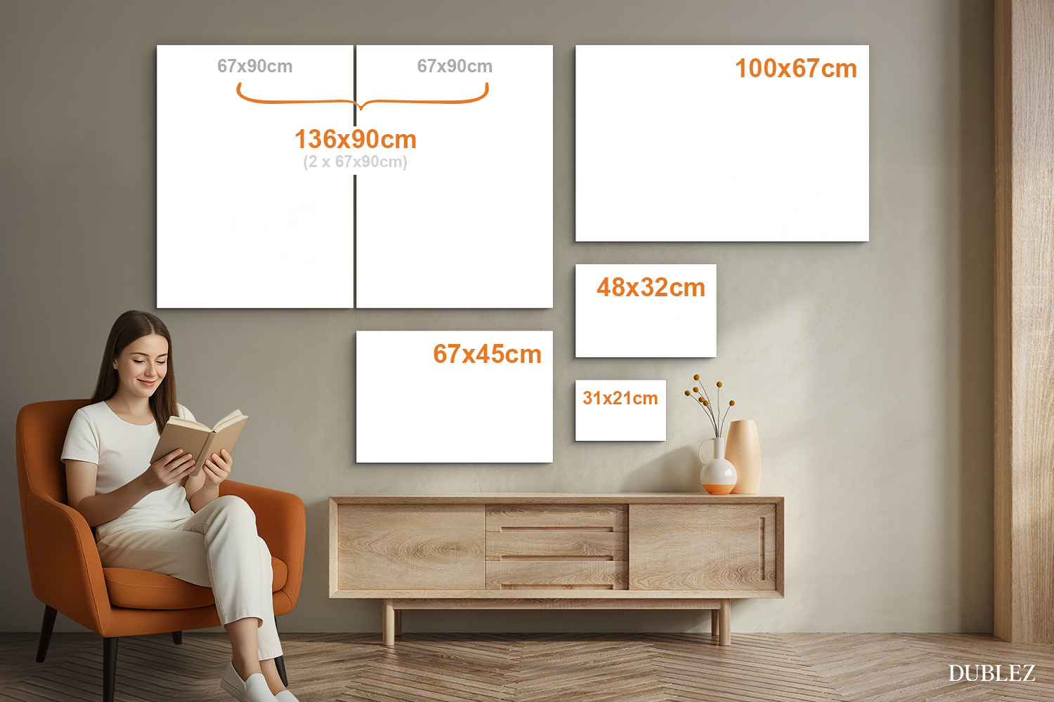 - 136x90 cm - Obraz je rozdelený na 2 časti (rozmer jednej časti je 67x90 cm - viď galéria produktu). Rozmer 136x90 cm je rozmer po zavesení na stenu s 2 cm medzerou medzi jednotlivými dielmi. Medzery medzi jednotlivými dielmi je možné ľubovoľne nastaviť a tým dosiahnuť aj väčšiu veľkosť.