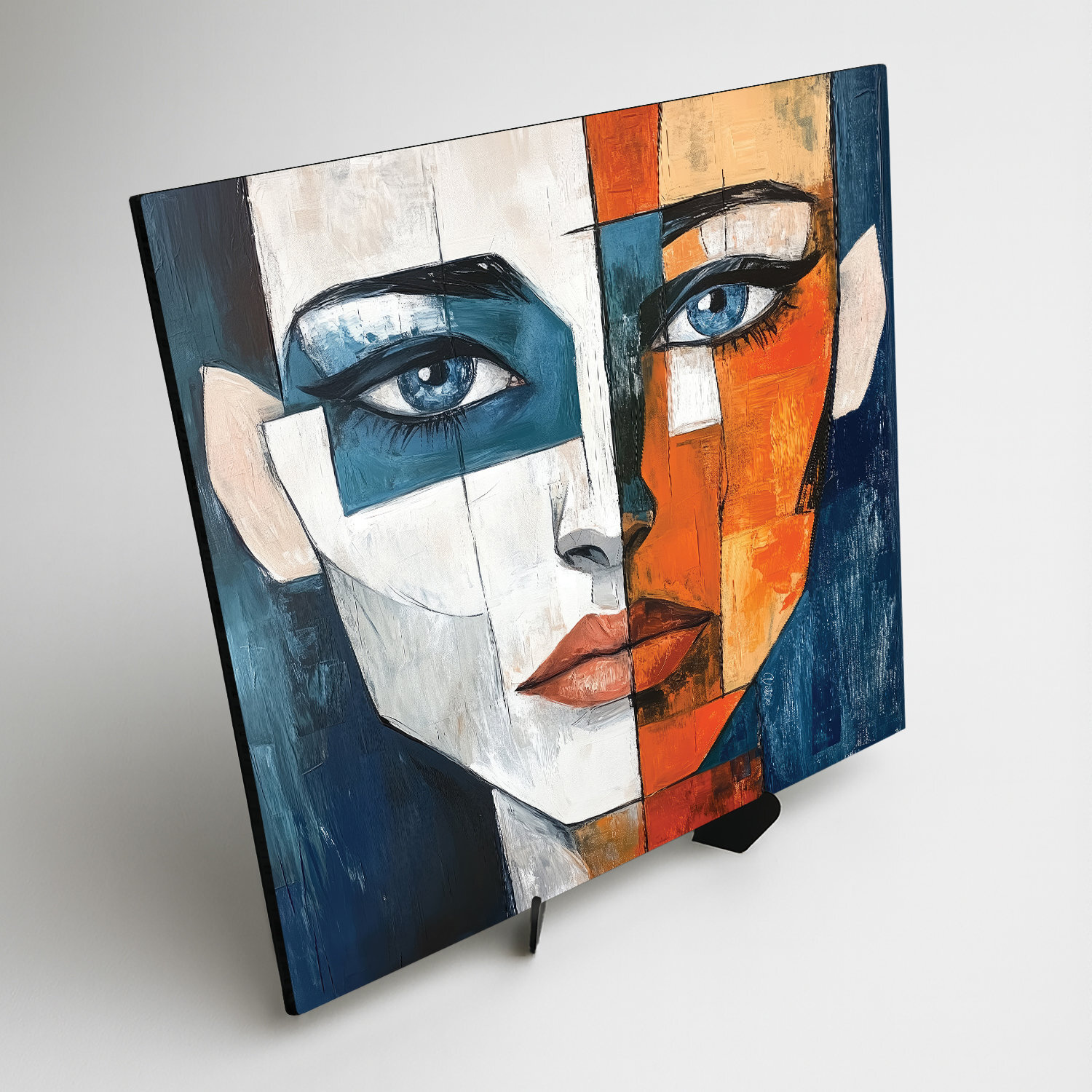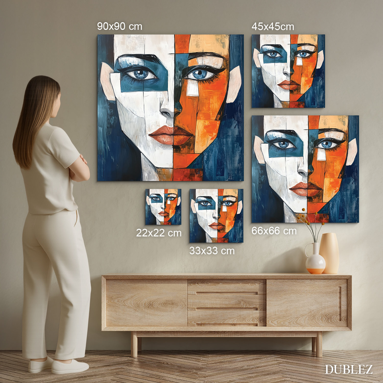 Drevený obraz abstraktnej tváre ženy zaujme svojím výrazným geometrickým štýlom. Tvár je rozdelená na rôzne farebné bloky v modrej, oranžovej a bielej, čo dodáva obrazu originálny štýl. Výrazné oči a pohľad ženy sú stredobodom celého umeleckého diela. Skvele vynikne v modernej obývačke, spálni alebo na chodbe.