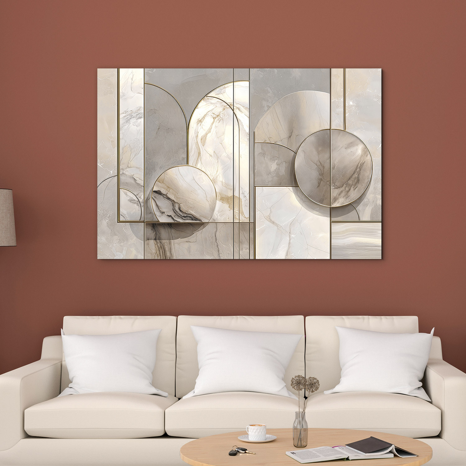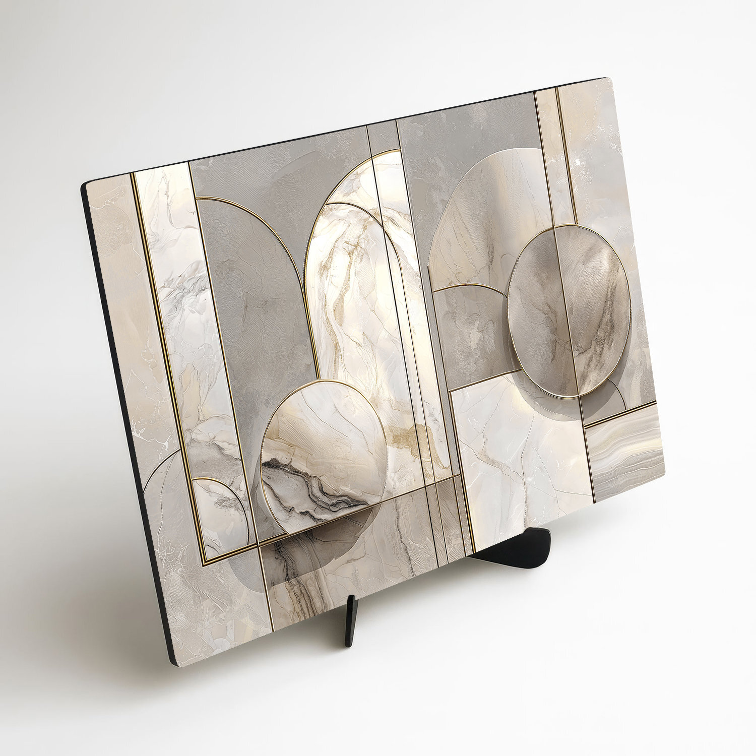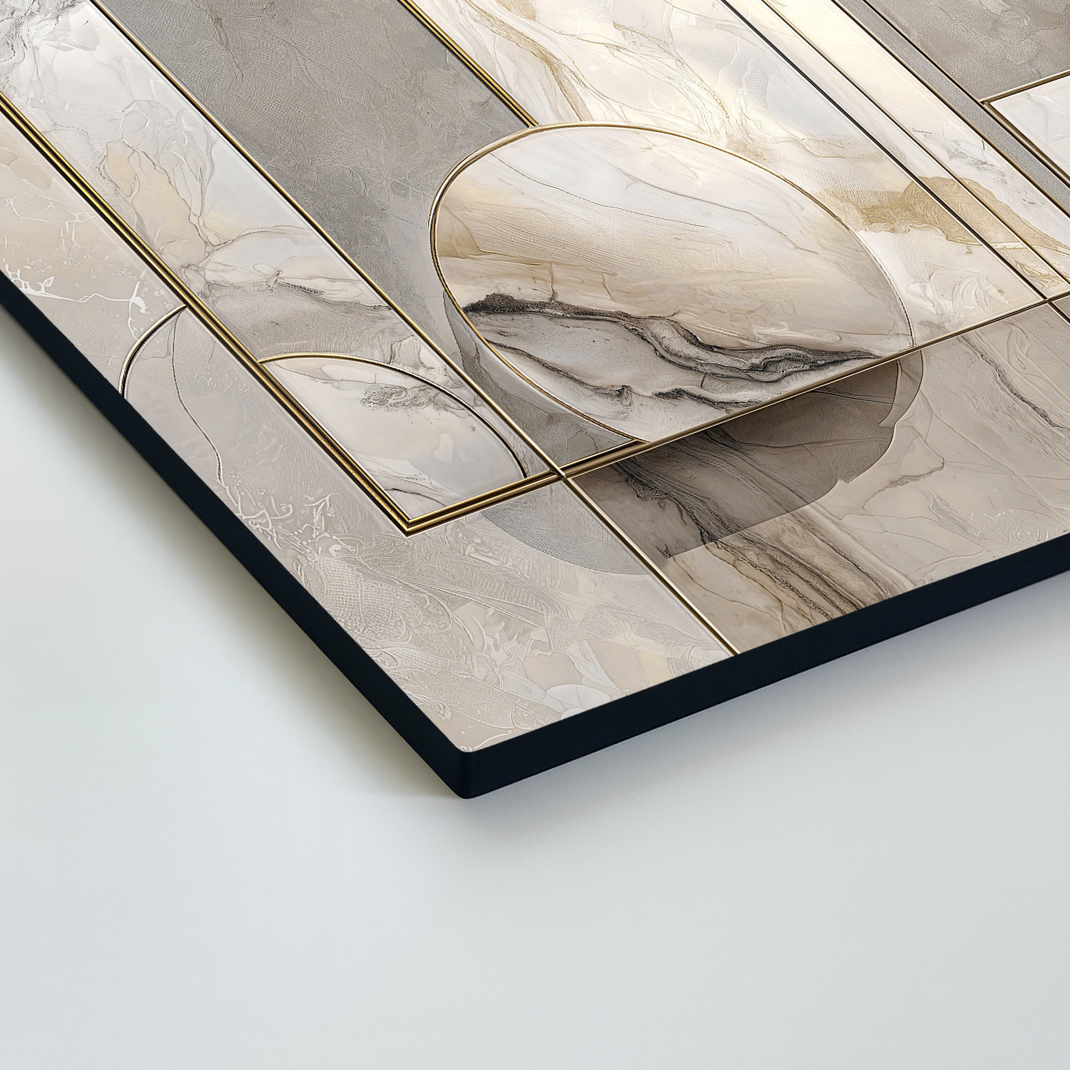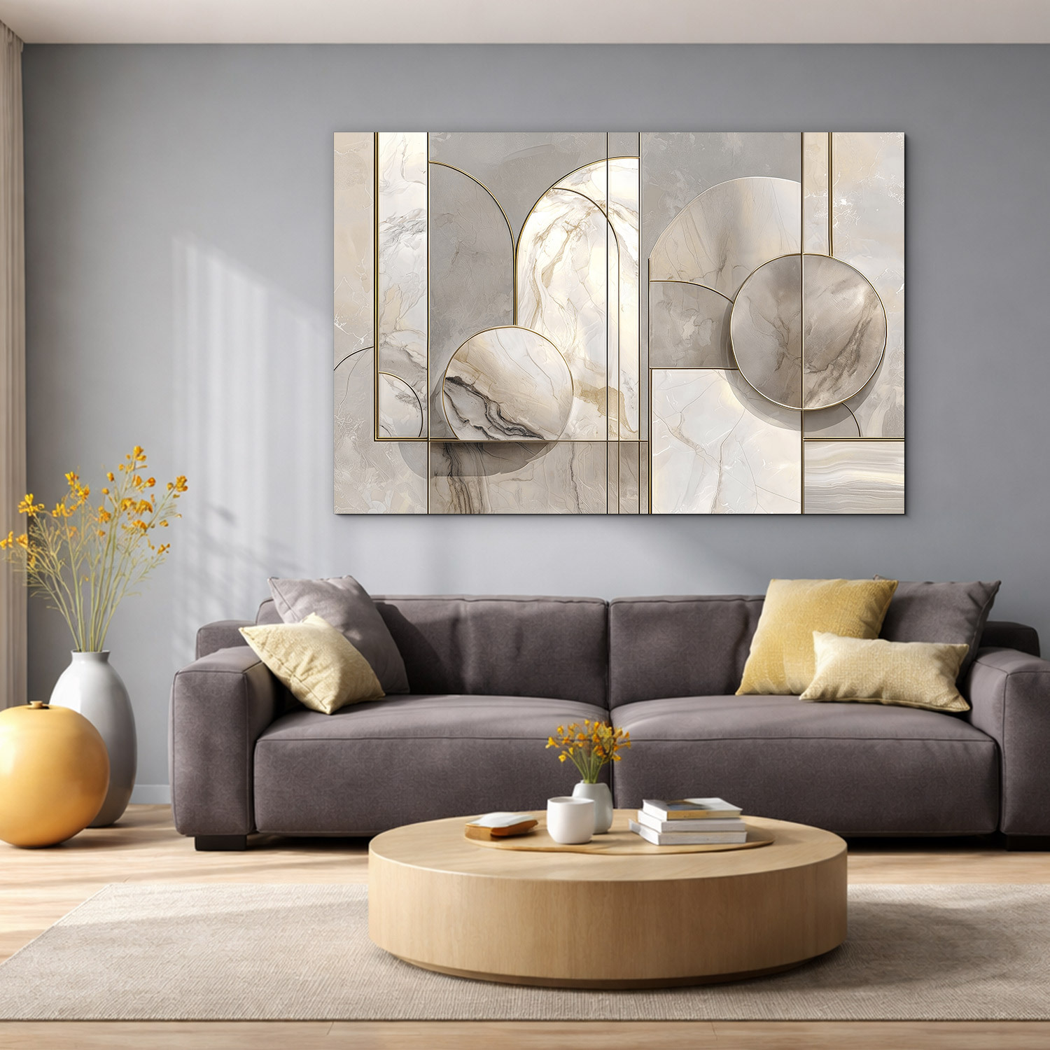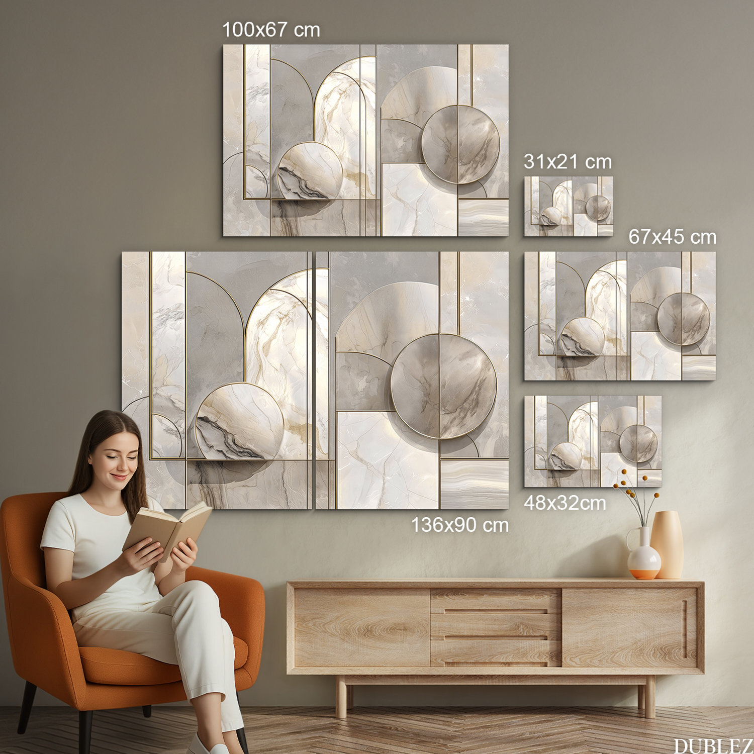 Moderný obraz s jemným mramorovým efektom a precízne vedenými zlatými líniami vytvára harmonickú kompozíciu kruhov a oblúkov. Neutrálne béžové a krémové farby pôsobia elegantne a nadčasovo, vďaka čomu sa obraz prirodzene vynikne v modernom interiéri. Ideálny bytový doplnok do obývačky nad sedačku alebo do reprezentatívnej kancelárie. Ak hľadáte dizajnový obraz, ktorý prepojí luxus s útulnosťou, tento abstraktný motív je nadčasovou investíciou do interiéru.