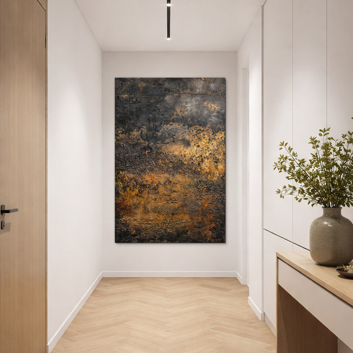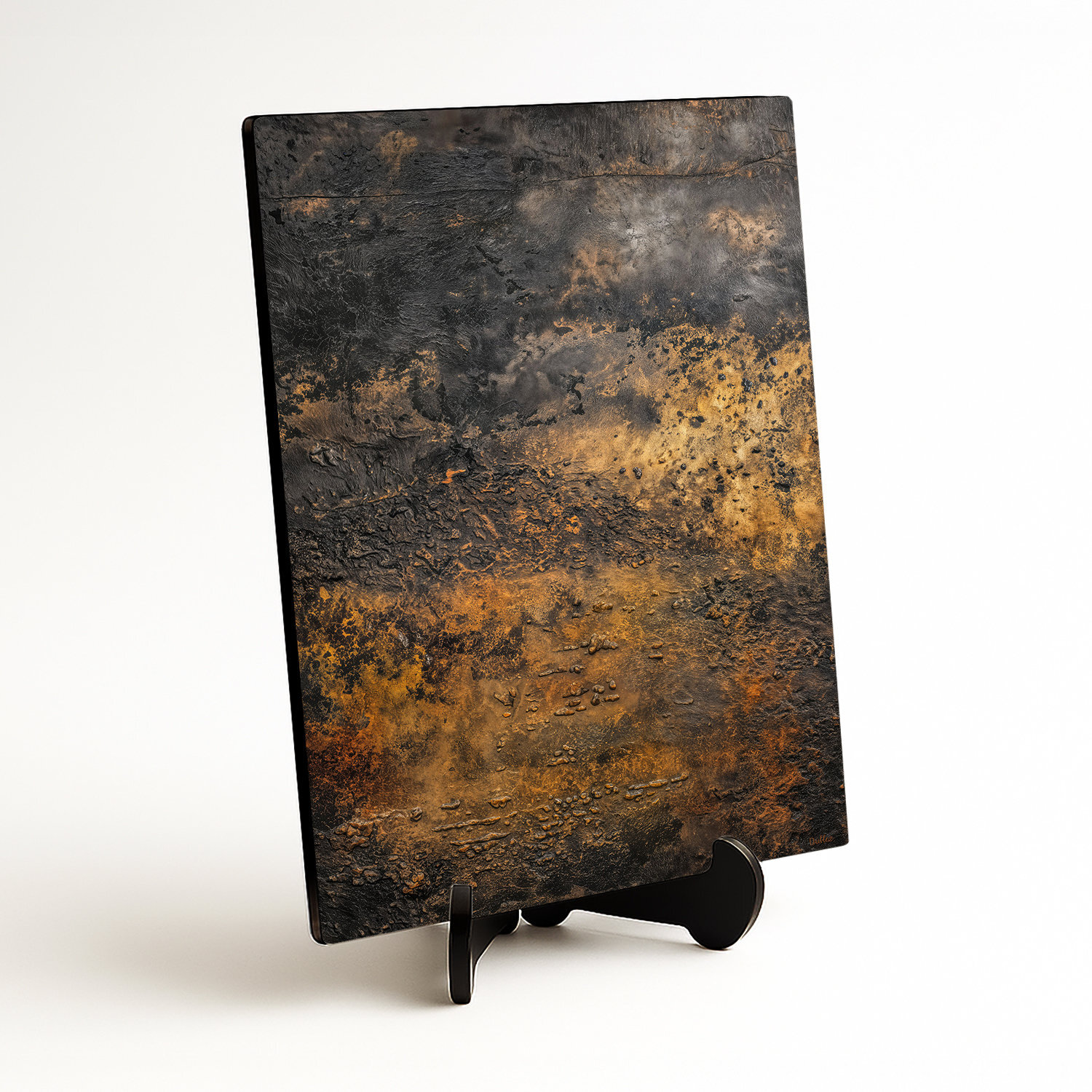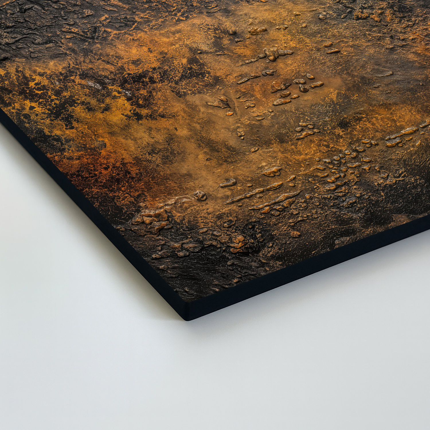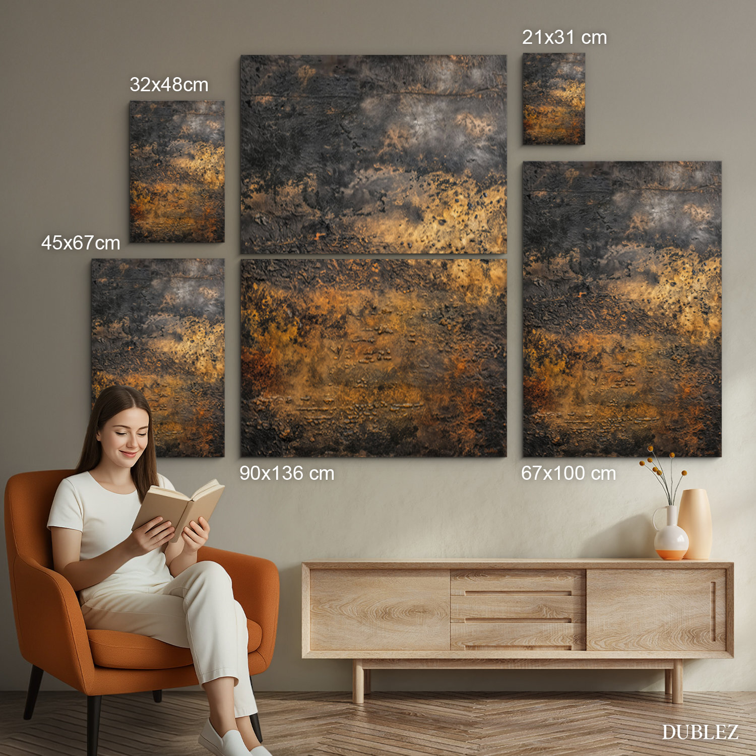 Drevený obraz na stenu s motívom surovej metalickej abstrakcie vnesie do interiéru industriálnu eleganciu a modernú sofistikovanosť. Obrat s hrdzavými a zlatými vrstvami vytvára na stene exkluzívny dizajn. Precízna tlač na dreve zvýrazňuje kontrast medzi tmavými, zlatými a medenými odtieňmi, čím dodáva interiéru surovú silu. Dizajnérsky obraz najlepšie vynikne v modernom lofte, minimalistickej obývačke alebo reprezentatívnej chodbe.