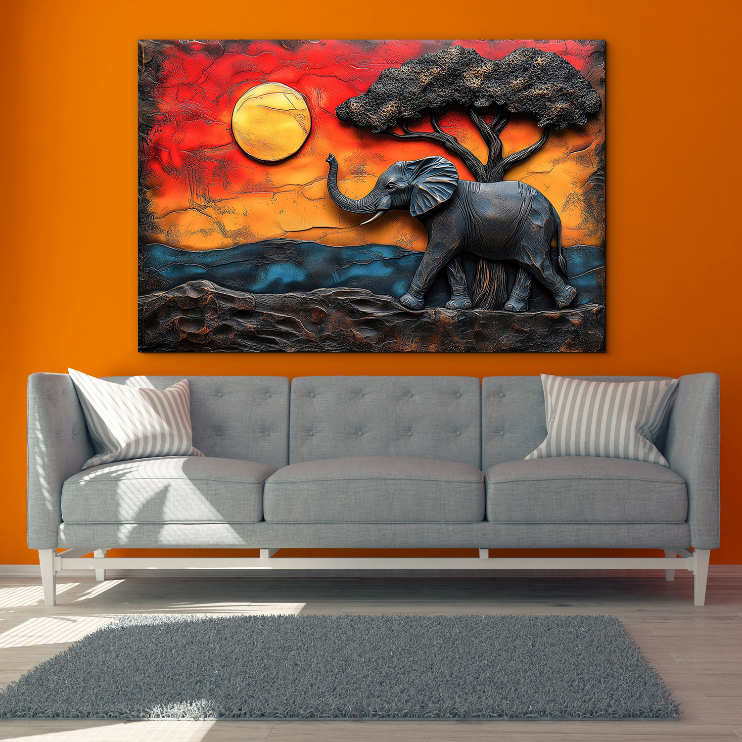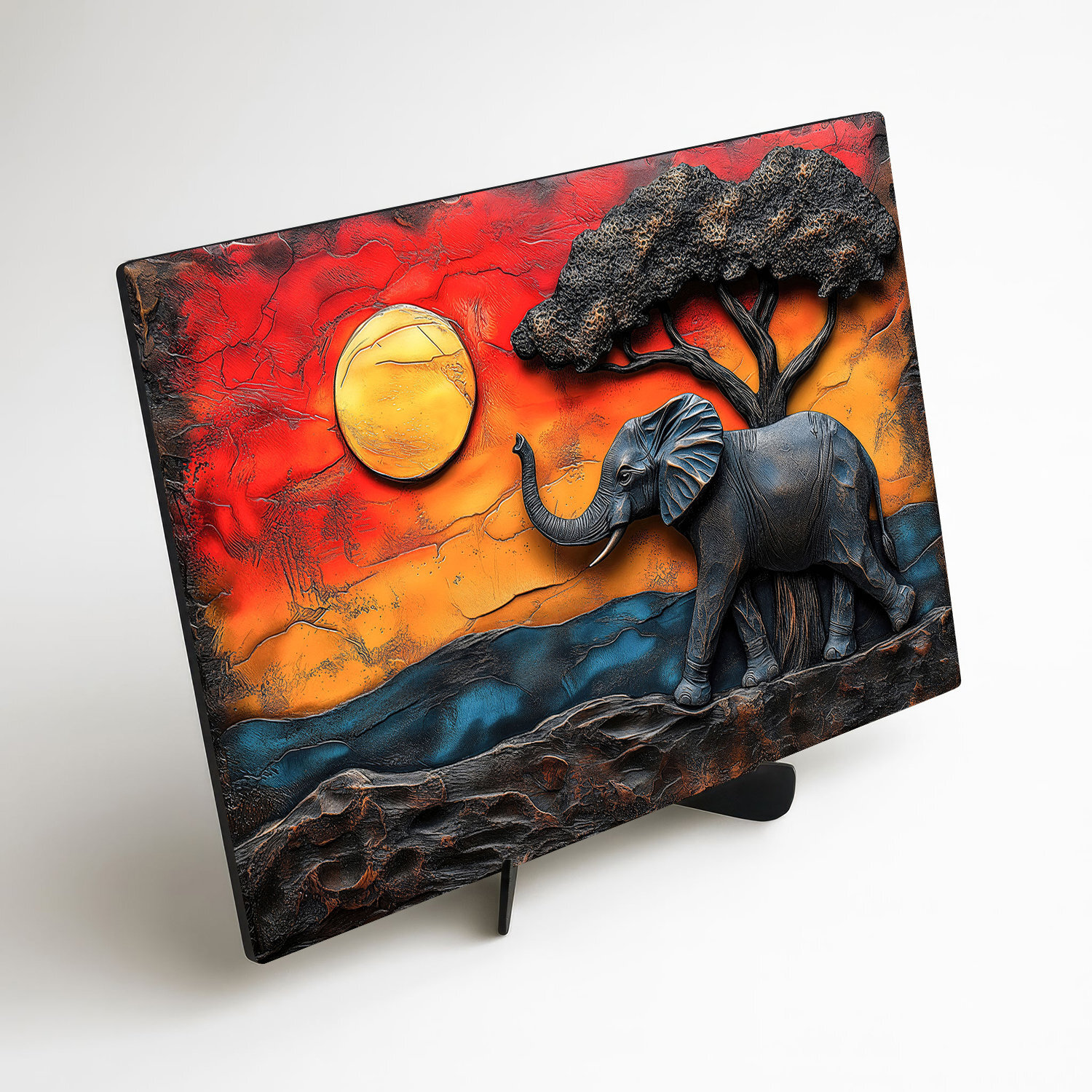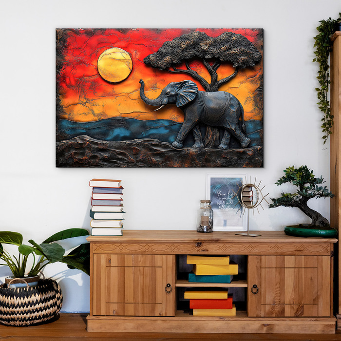 Drevený obraz zachytáva majestátneho slona kráčajúceho africkou krajinou pod korunou akácie v momente, kedy sa obloha sfarbuje do dramatických odtieňov zapadajúceho slnka. Teplé odtiene červenej, oranžovej a zlatej v kontraste s tmavými siluetami vytvárajú silnú atmosféru divokej prírody a slobody. Obraz slona sa perfektne hodí do obývačky aj chodby. Vďaka kvalitnej UV tlači priamo na drevo pôsobia farby prirodzene a luxusne zároveň.