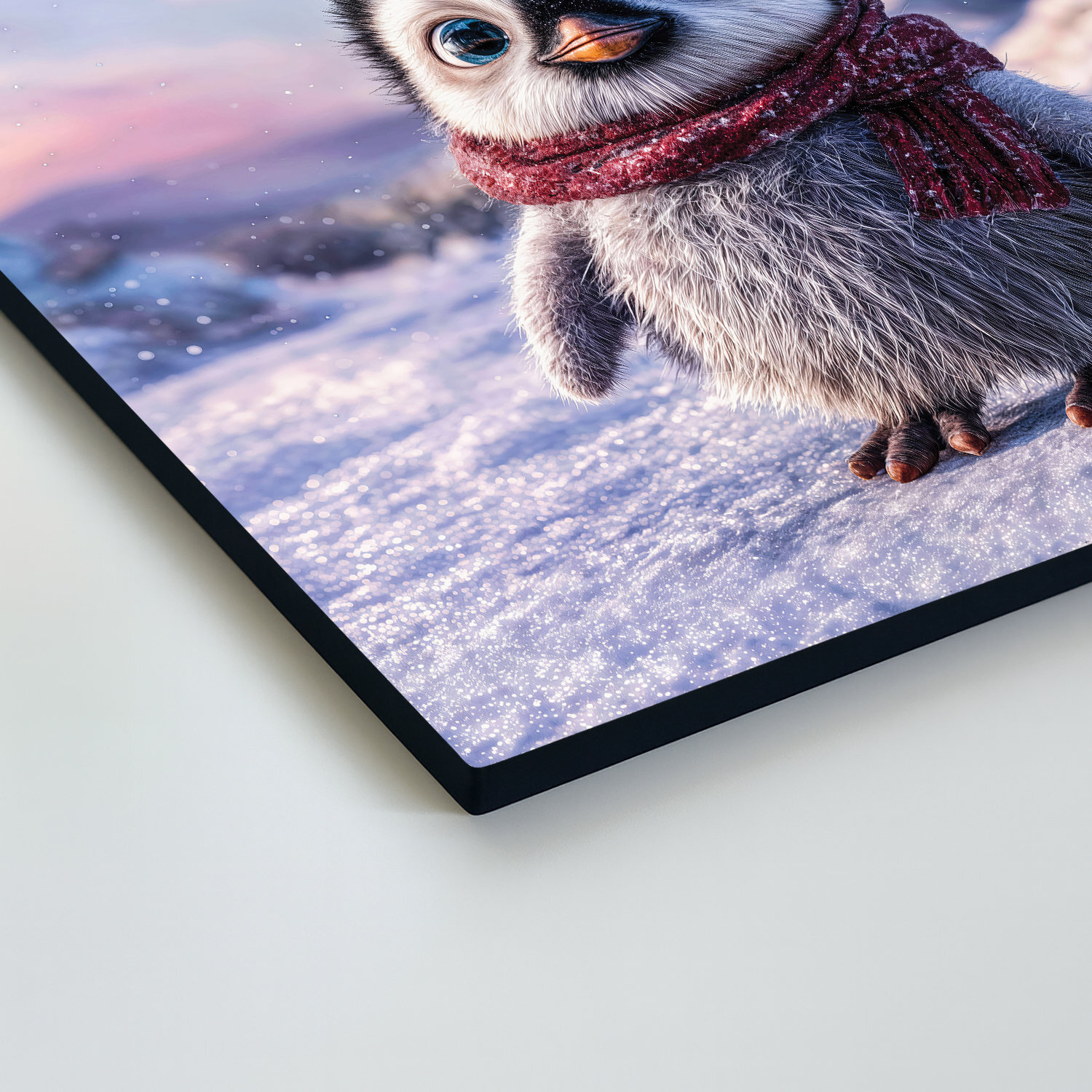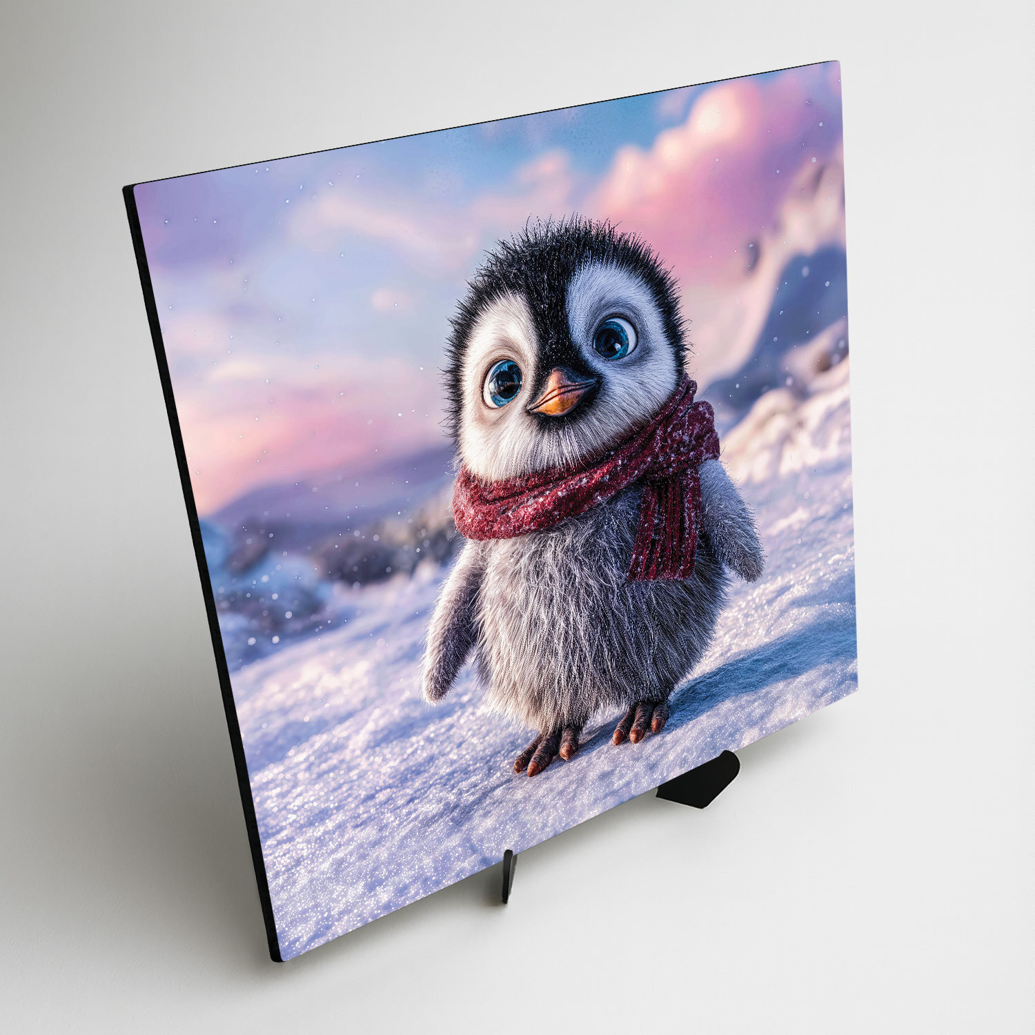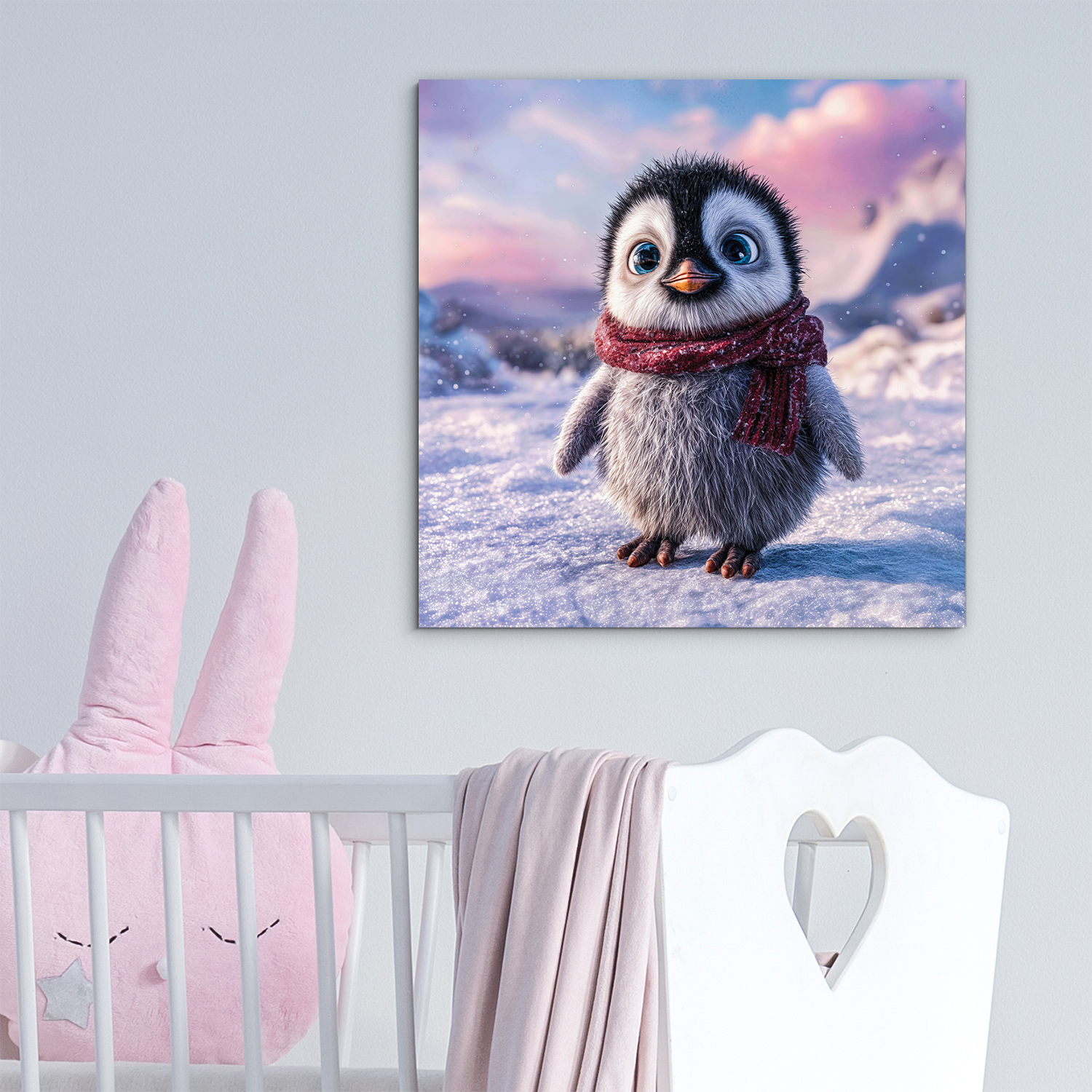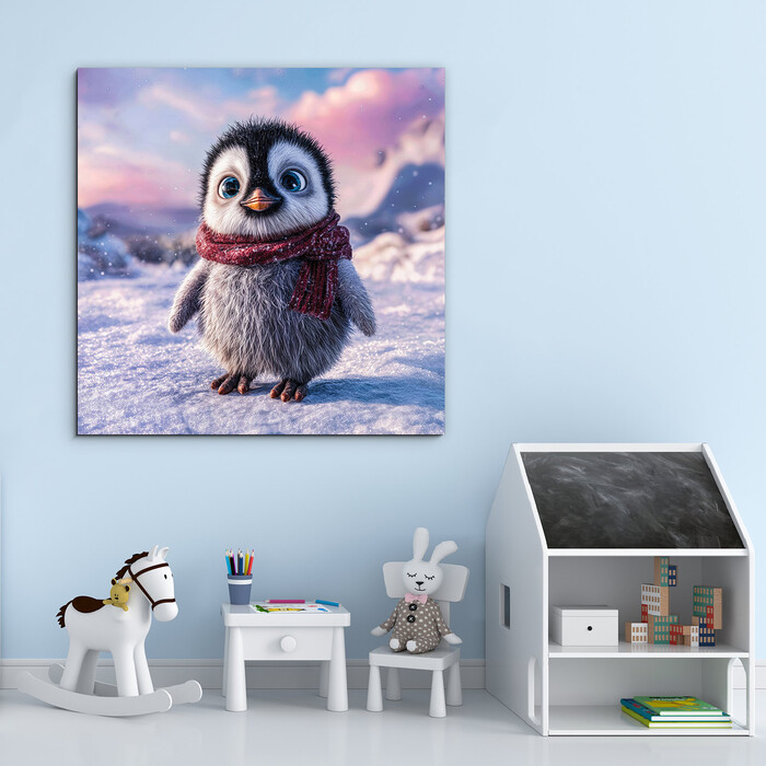 Huňatý tučniak so žiarivo modrými očami a červeným pleteným šálom prináša do detského sveta atmosféru zimnej rozprávky. Drevený obraz vynikne nad detským stolíkom alebo v blízkosti bieleho nábytku. Ak hľadáte štýlový zimný obraz pre deti, ktorý zahreje pri srdci, tento tučniak premení stenu na čarovné zasnežené kráľovstvo.