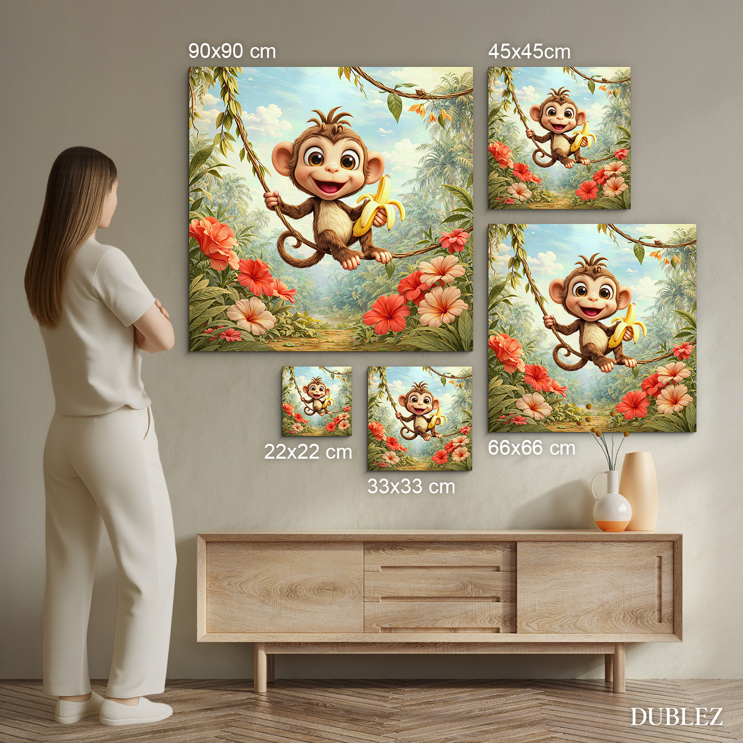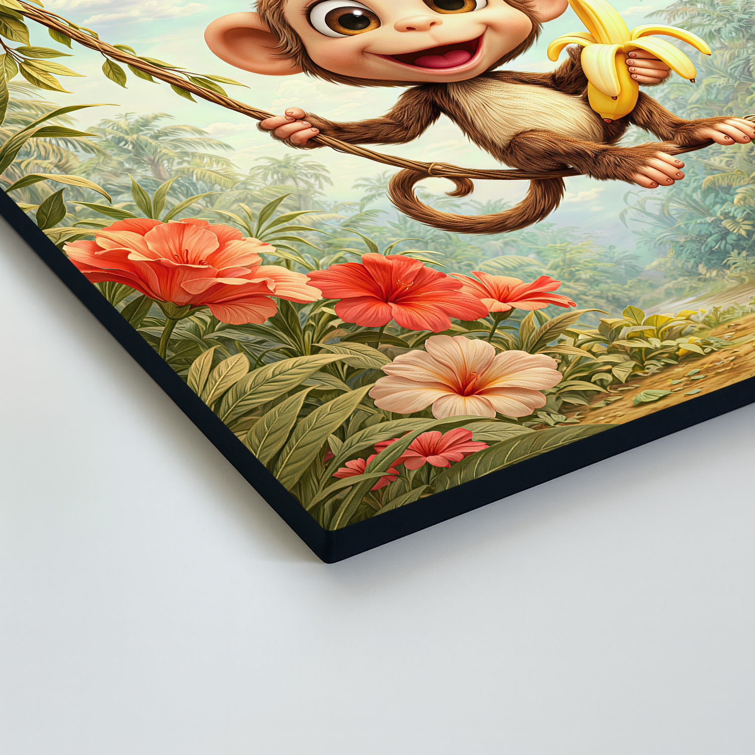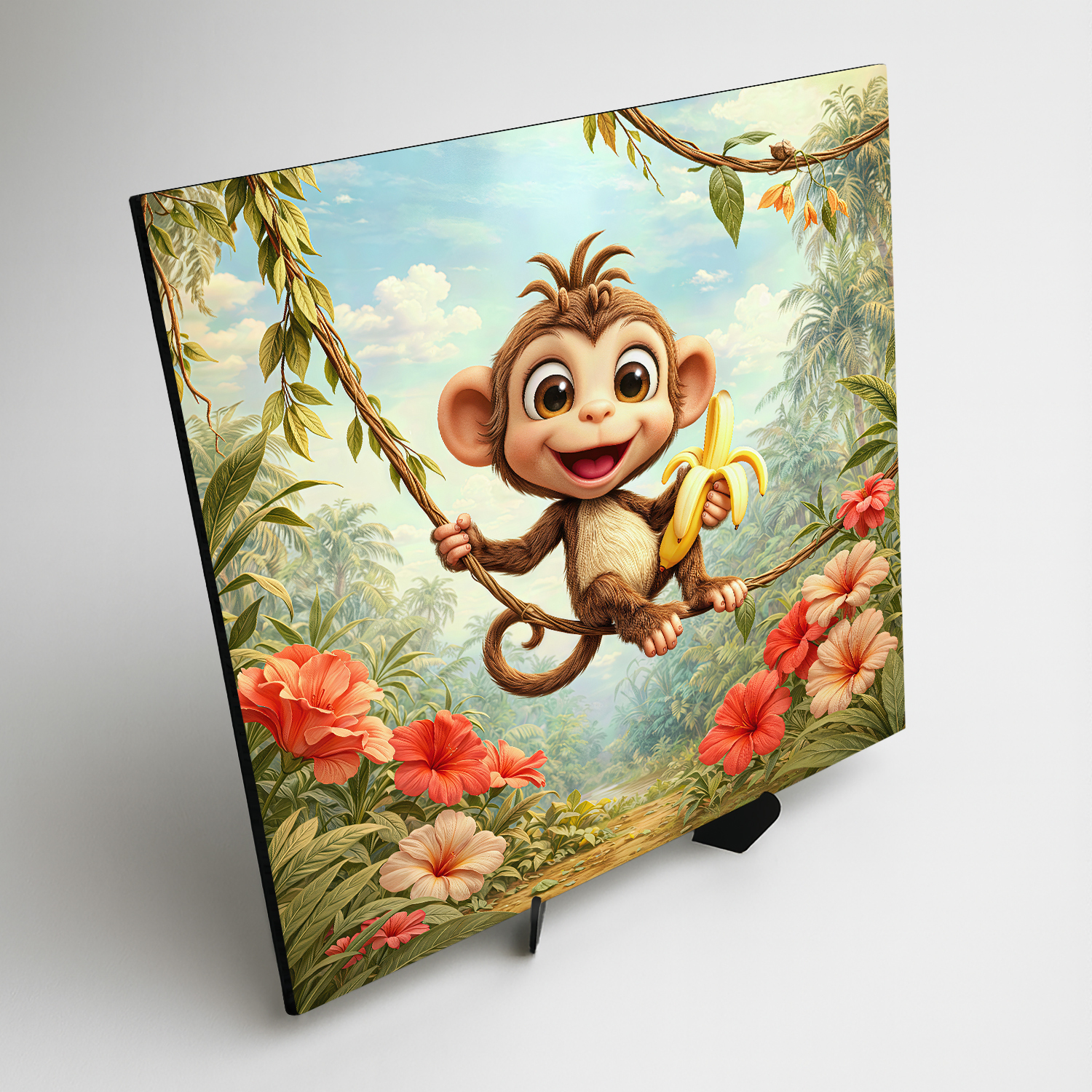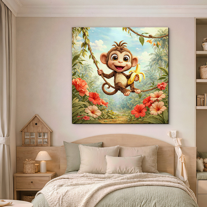 Oživte detskú izbu hravým obrazom opičky hojdajúcej sa na liane s banánom v ruke. Vďaka žiarivým farbám exotických kvetov a blankytnej oblohe obraz okamžite rozjasní každú izbičku. Drevený obraz je vyrobený z kvalitného materiálu, ktorý pôsobí prirodzene a vydrží ako krásna dekorácia dlhé roky. Opička pôsobí bezstarostne a veselo, preto je skvelou voľbou ako darček pre deti, ktoré milujú zvieratá a dobrodružstvo.