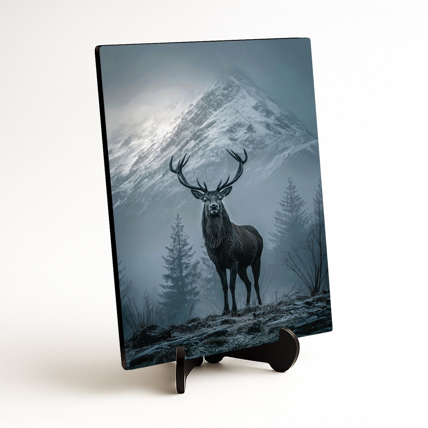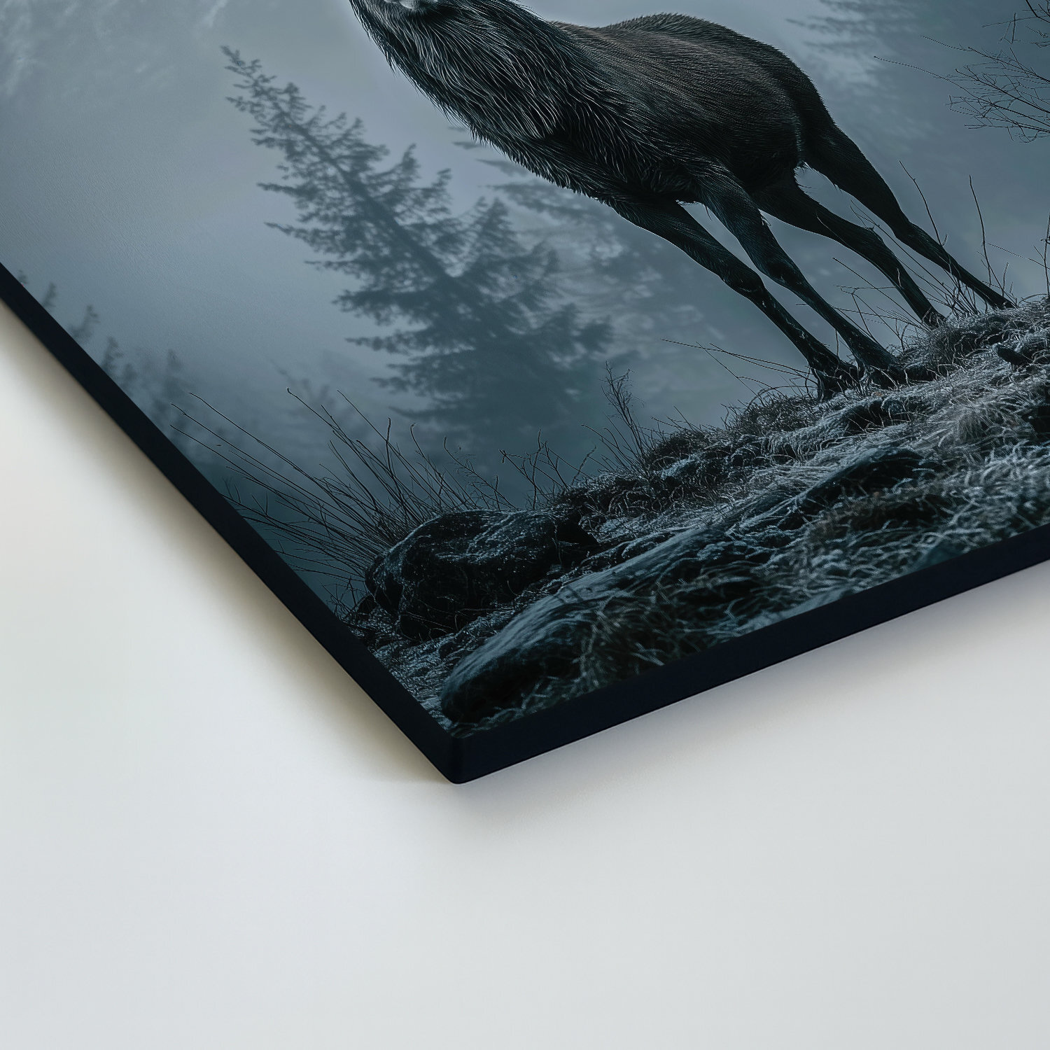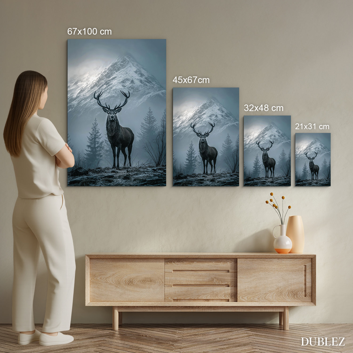 Moderný obraz – Jeleň na zasneženom vrchole hôr. Studené odtiene modrej a sivej navodzujú pocit ticha a pokoja, no zároveň z obrazu vyžaruje sila a odhodlanie kráľa lesa. Perfektne sa hodí do obývačky, kancelárie aj loveckej chaty. Perfektne sa hodí do obývačky, kancelárie či loveckej chaty. Realistické detaily srsti, kontrast medzi tmavou siluetou zvieraťa a hmlistým pozadím, vytvárajú jedinečný dizajnový obraz. Obraz jeleňa skvelo zapadne do moderných aj rustikálnych interiérov.