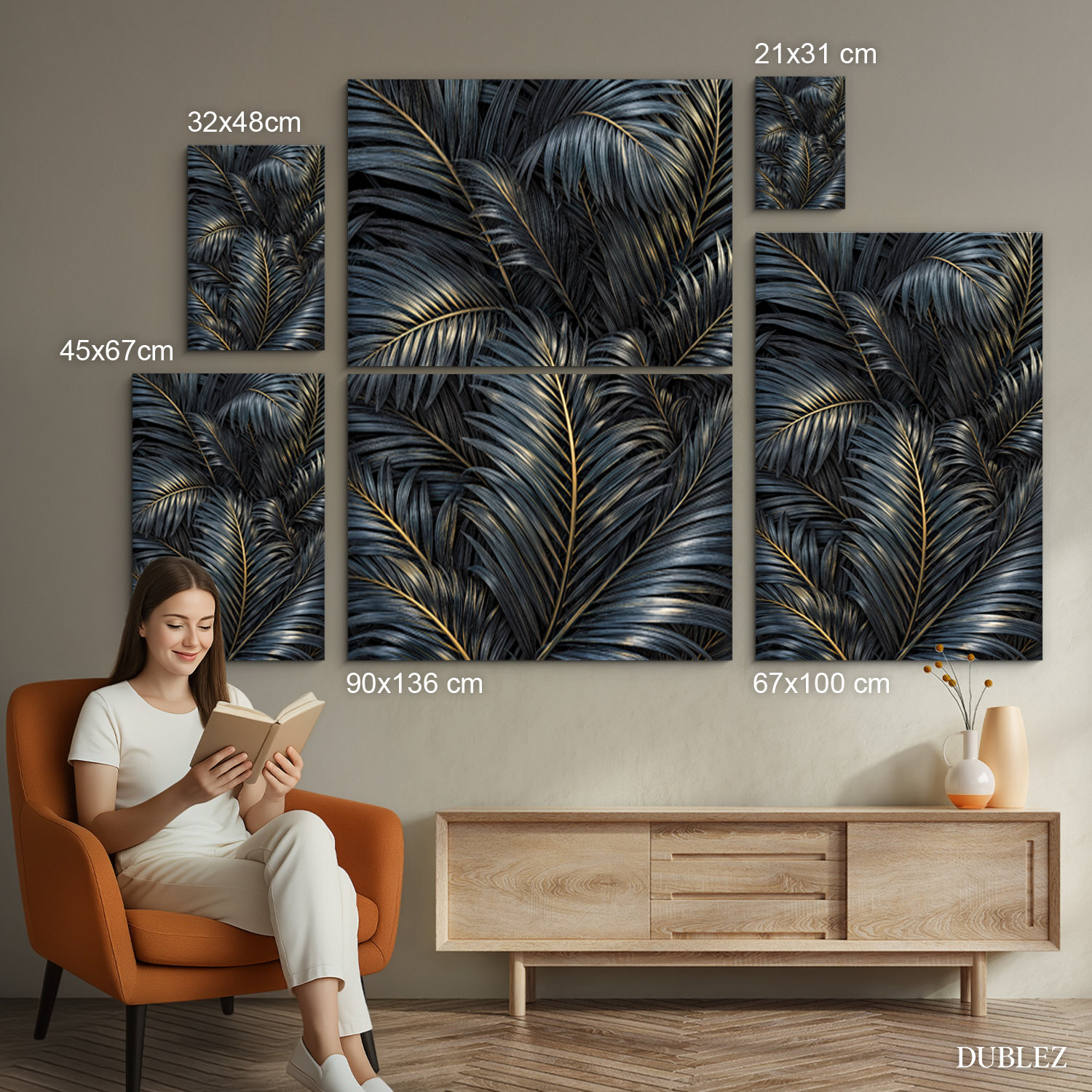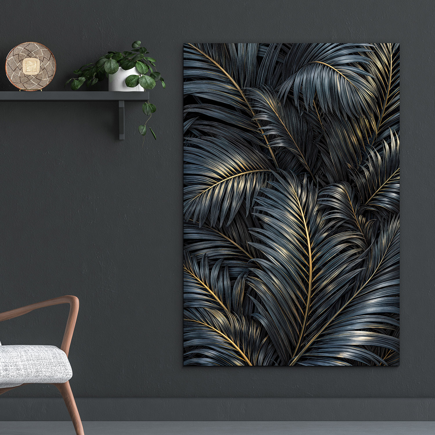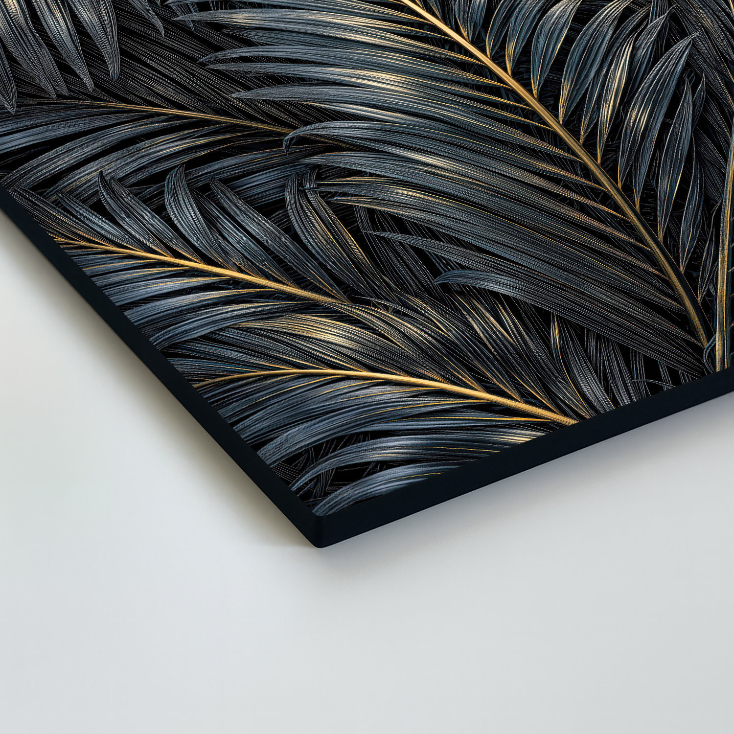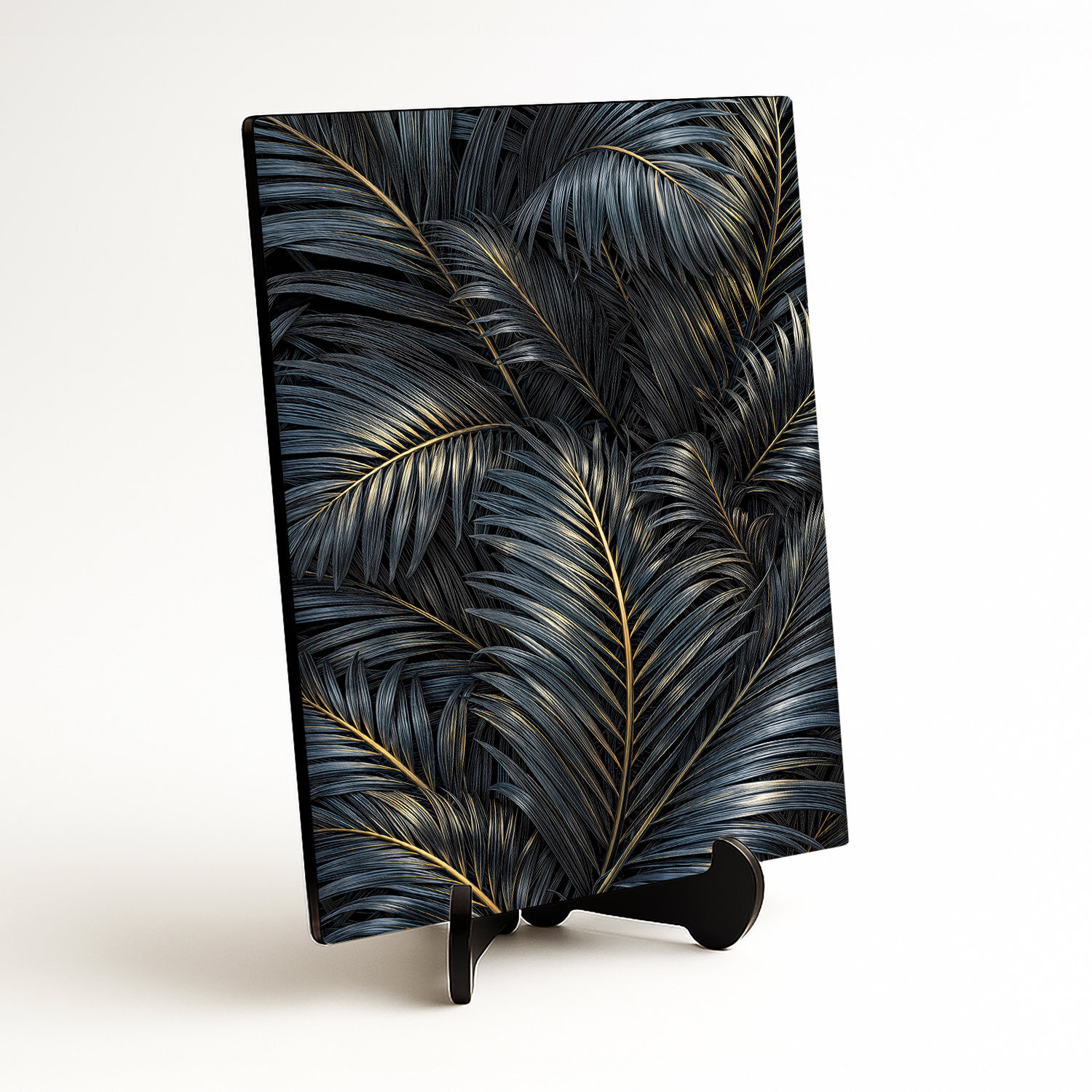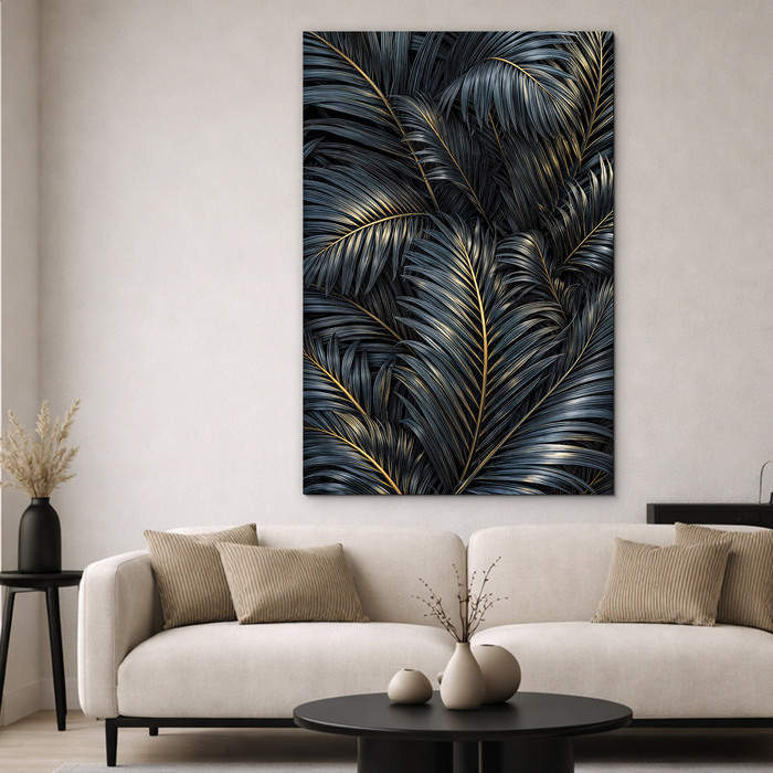 Dizajnový obraz palmových listov prináša do interiéru atmosféru luxusu a exotickej prírody. Detailne vykreslené listy v sýtych farbách sú pretkané jemným zlatým žilovaním. Tento obraz na dreve pôsobí moderne a sofistikovane, vďaka čomu sa stane ozdobou každej obývačky či spálne.