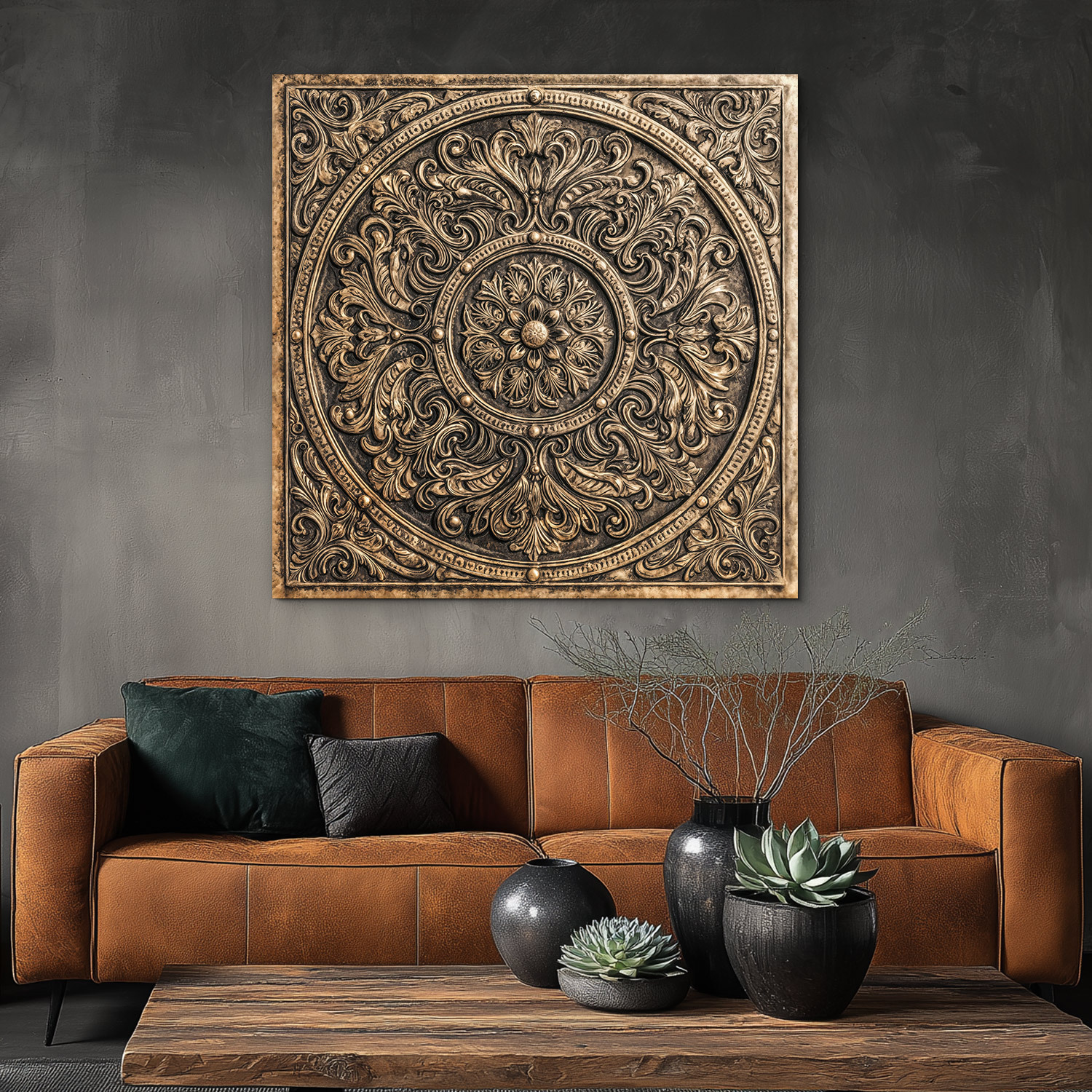 Drevený obraz Bronzová mandala zaujme detailne prepracovaným ornamentom v nádhernej bronzovej farbe. Bohatá symetria, jemná patina vytvárajú luxusný efekt, inšpirovaný barokovými a renesančnými motívmi, ktoré plynule prechádzajú do rohov štvorcového obrazu. Farebný obraz mandaly je vyhotovený ako kvalitná UV tlač na dreve, vďaka čomu vyniknú precízne detaily vzoru a dlhodobá stálosť farieb. Ideálne sa hodí nad sedačku do obývačky, do spálne alebo do luxusnej kancelárie.