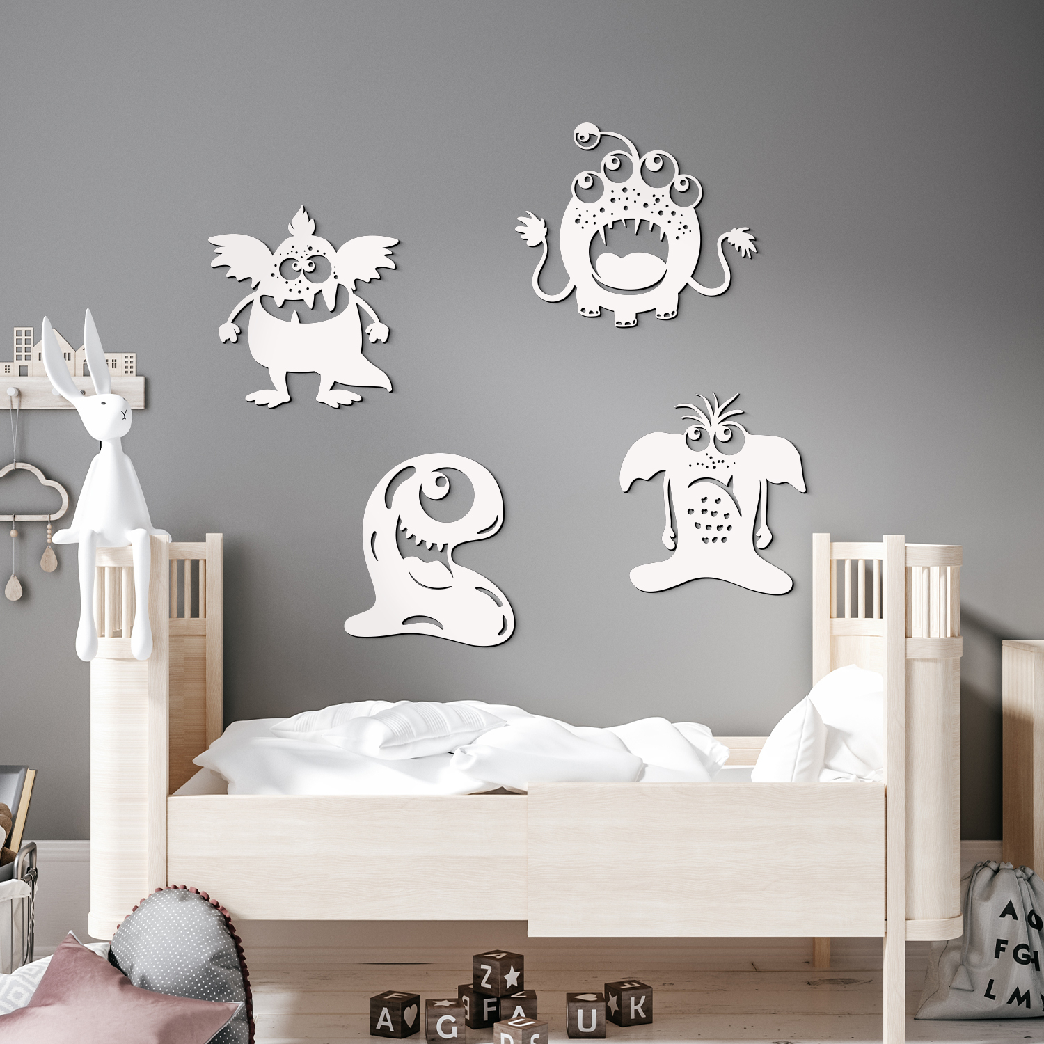 Oživte detskú izbu touto veselou sadou štyroch vyrezávaných strašidielok, ktoré premenia každú stenu na miesto plné fantázie. Minimalistické prevedenie s vtipnými výrazmi tvárí a veľkými očami zaručí, že sa z obávaných príšeriek stanú najlepší kamaráti detí. Drevená dekorácia sa skvele hodí nad detskú posteľ, do hracieho kútika alebo nad komodu, kde vnesie do priestoru hravosť a jedinečný dizajn.