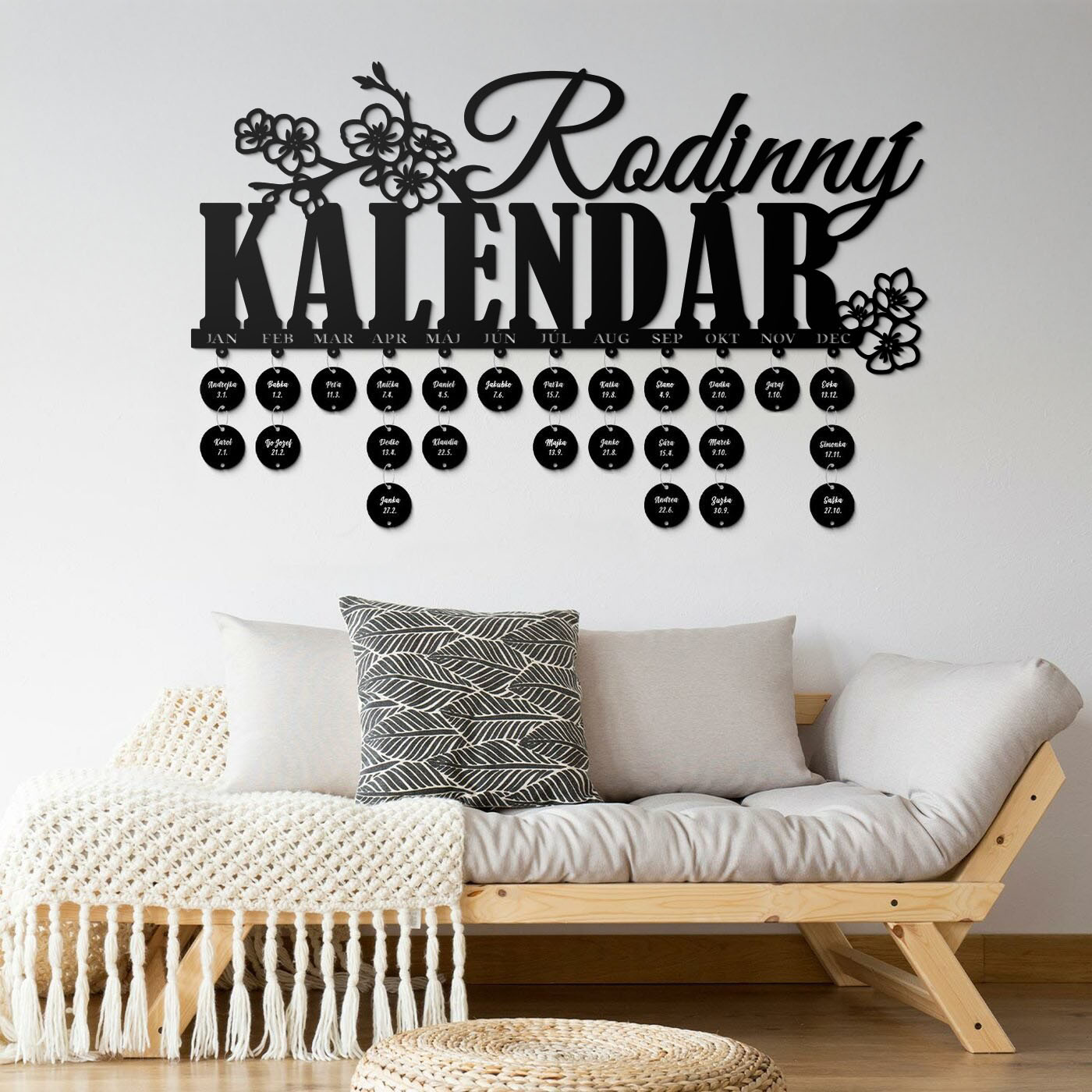 Rodinný kalendár na stenu je praktická drevená dekorácia, ktorá vám pomôže mať vždy prehľad o narodeninách, meninách či výročiach všetkých členov rodiny. Vyrezávaný slovenský nápis Rodinný kalendár dopĺňajú kvetiny, vďaka ktorým zapadne do moderného aj tradičného interiéru. Drevená dekorácia je vhodná do kuchyne, chodby alebo obývačky.
