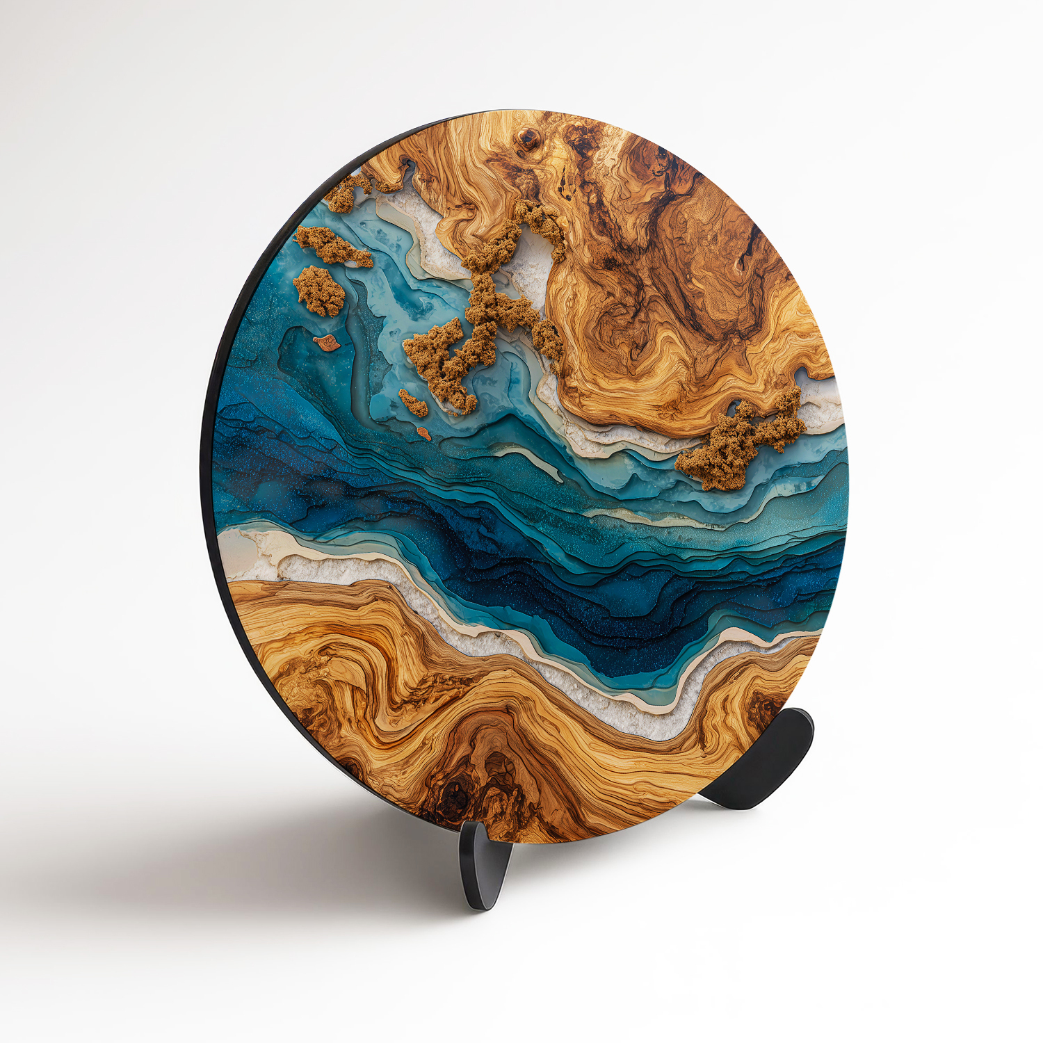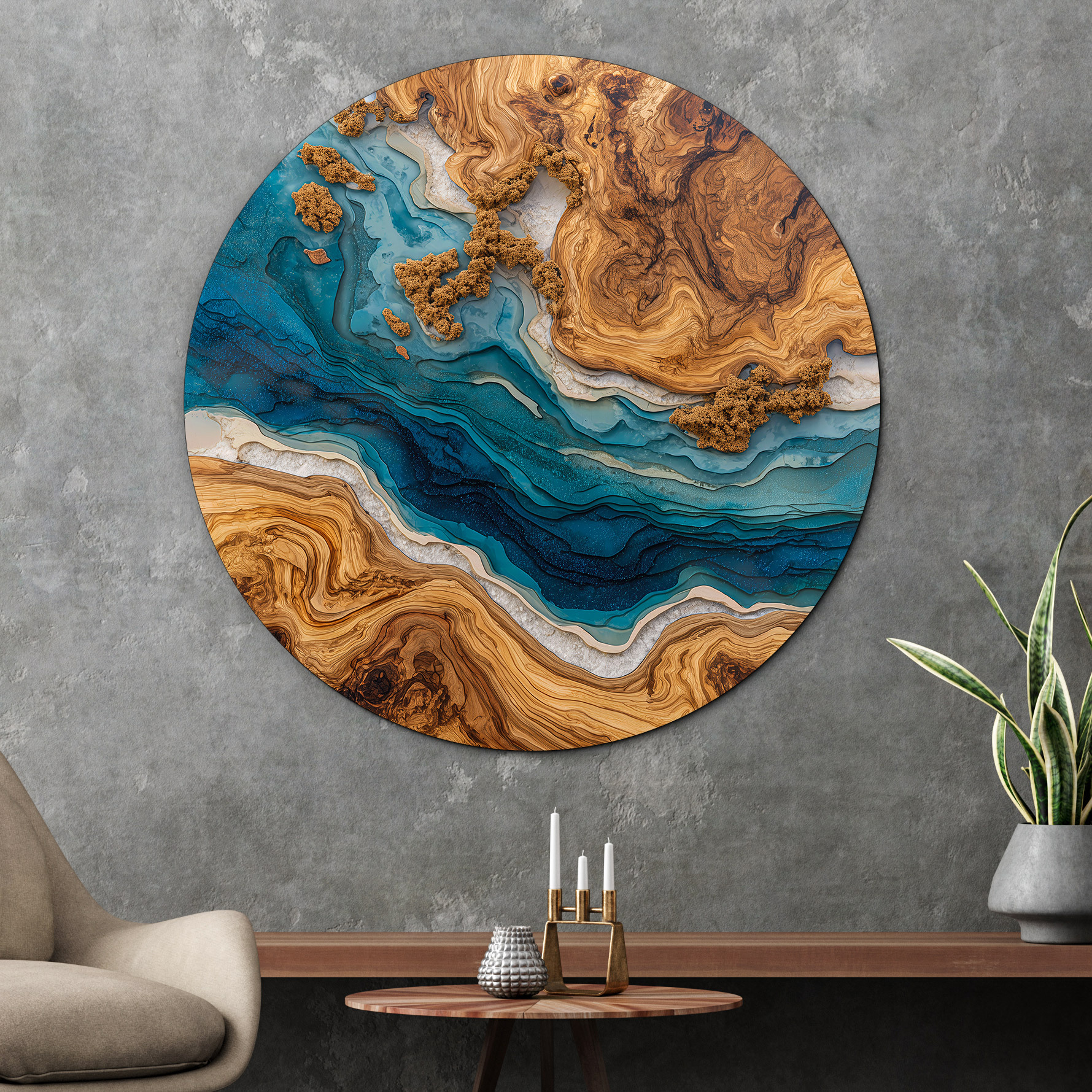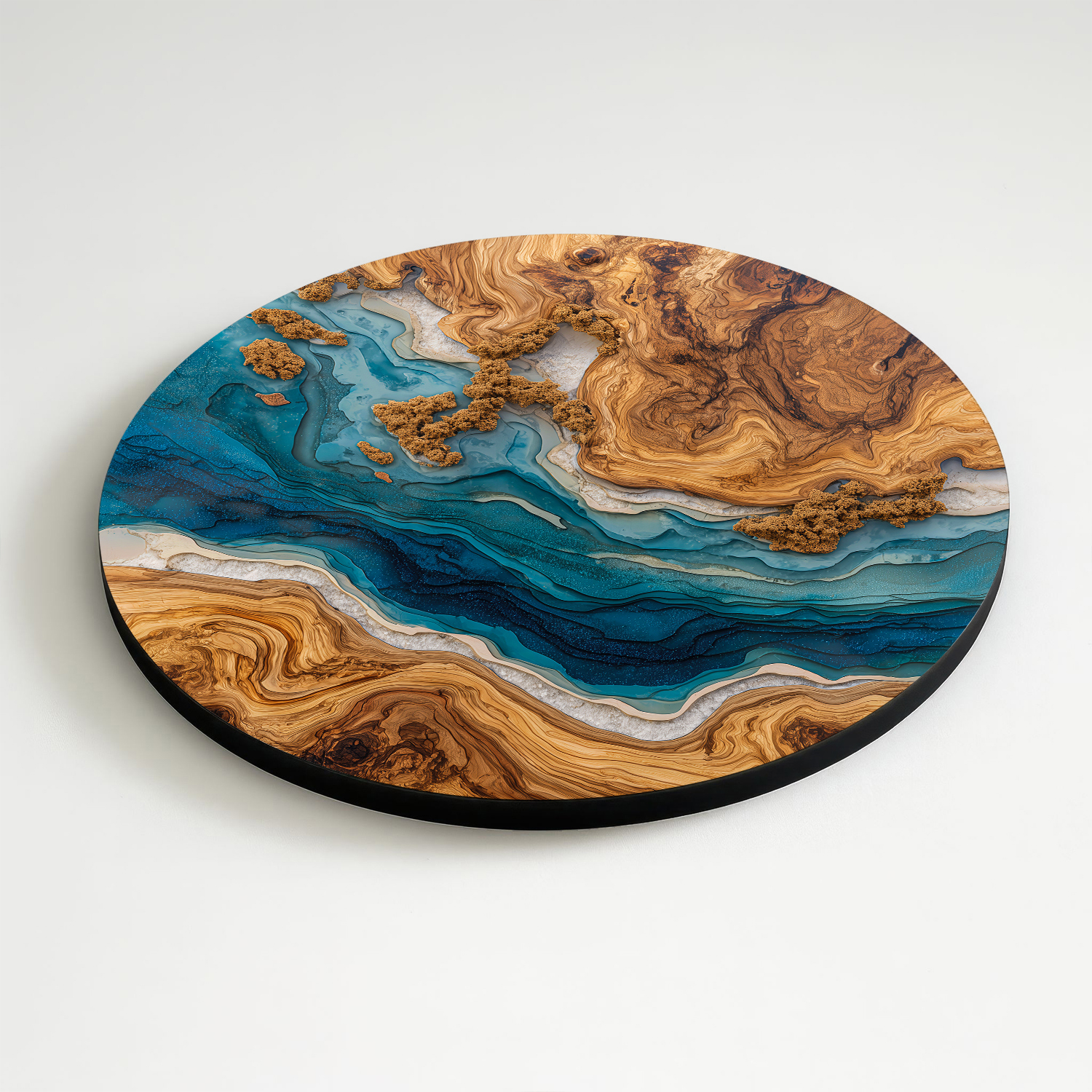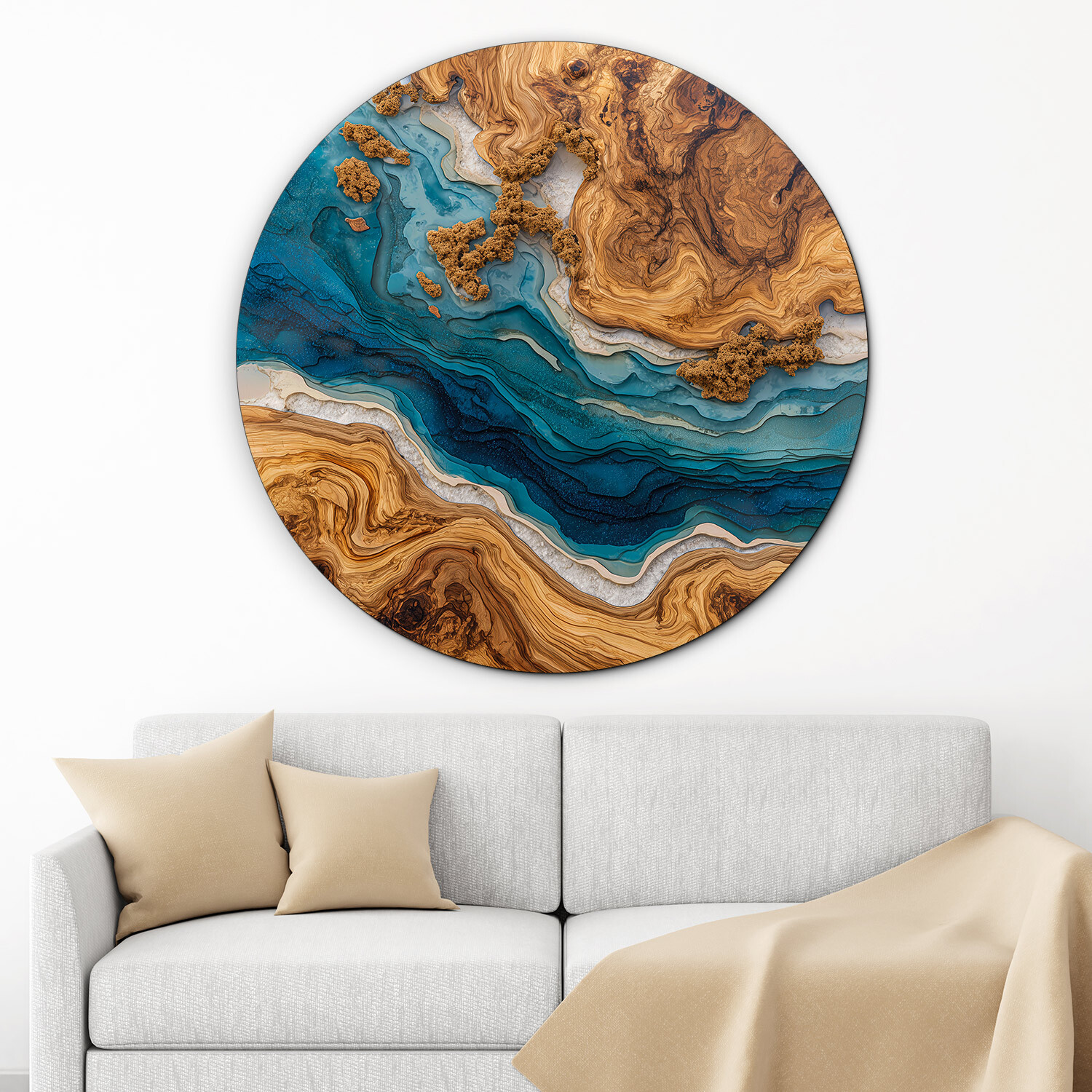 Moderný kruhový obraz s efektom dreva a vody zaujme na prvý pohľad. Pripomína pohľad na rieku, ktorá sa vlieva do mora. Hladké línie a prírodné farby pôsobia upokojujúco a zároveň dodajú interiéru nádych luxusu. Skvele sa hodí do obývačky alebo kancelárie.