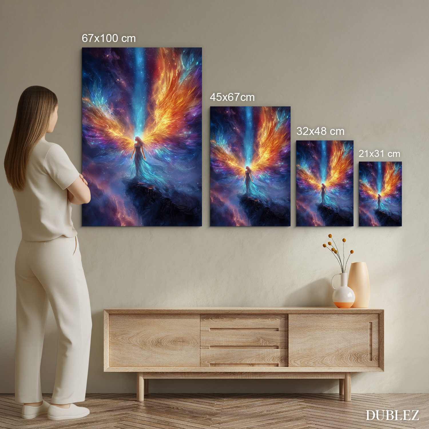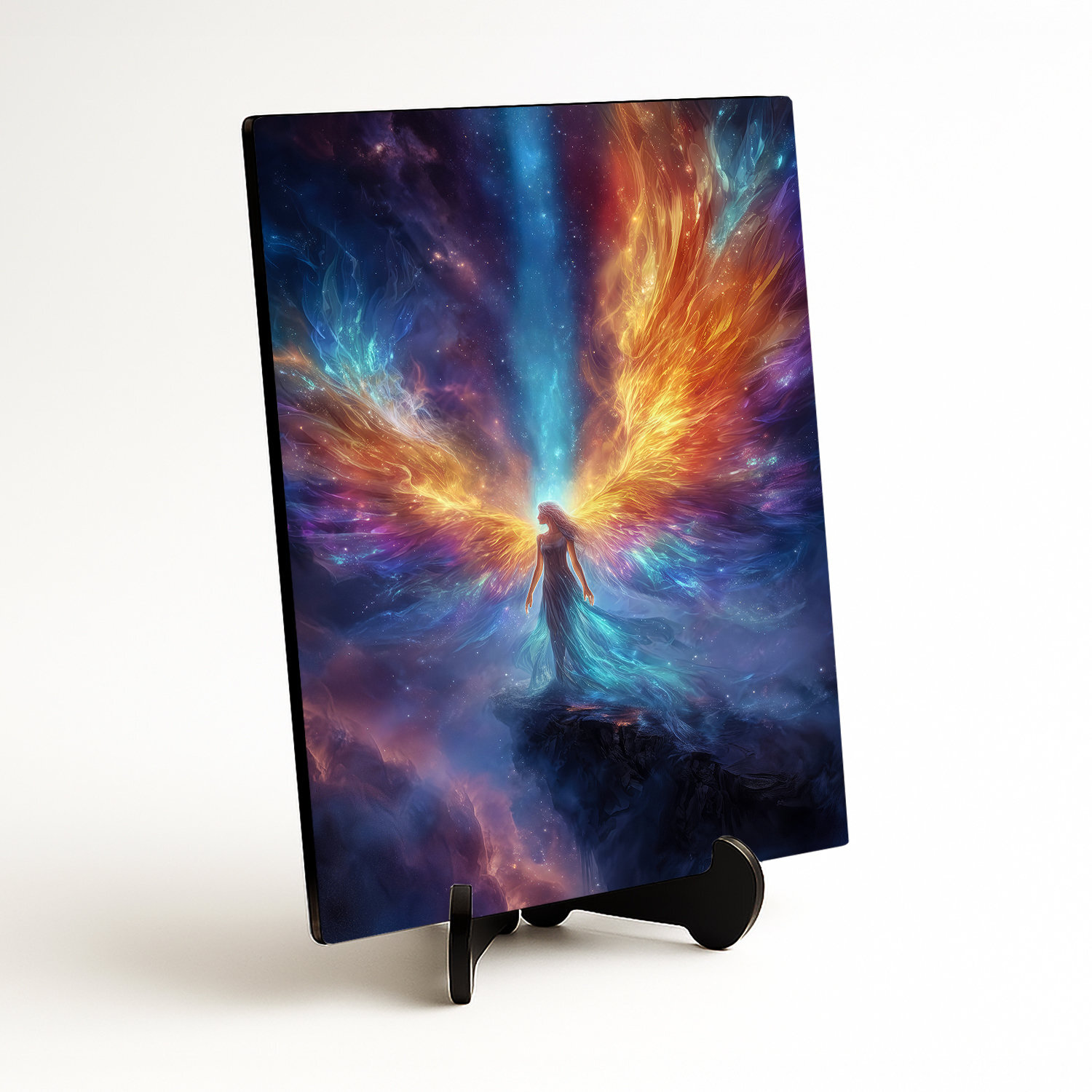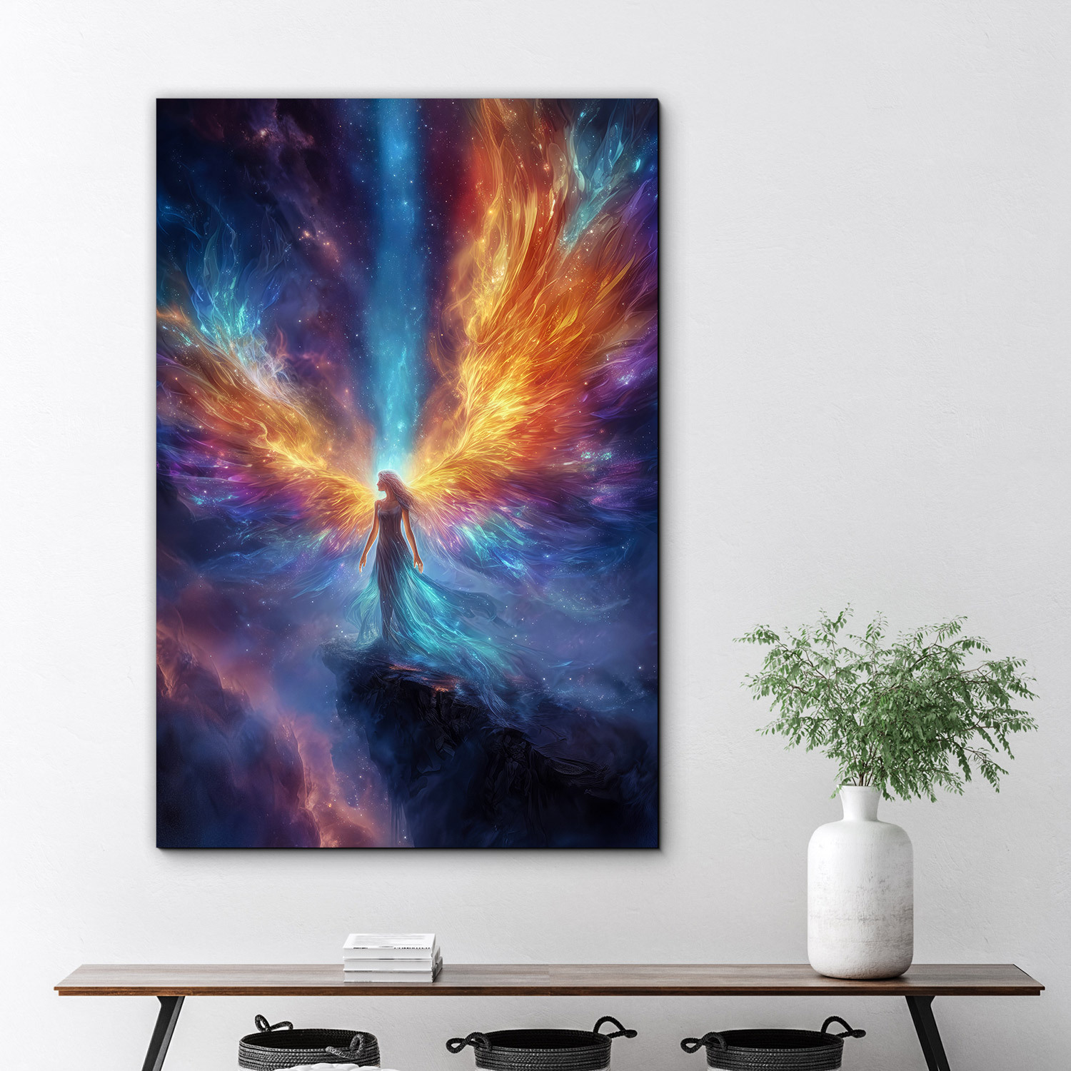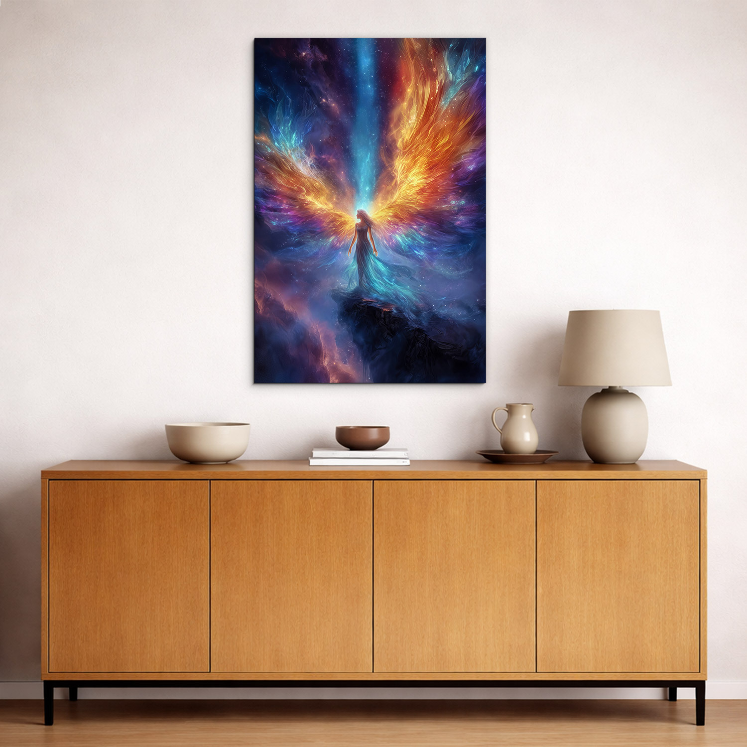 Nebeský ochranca je drevený obraz anjela na stenu, ktorý spája nekonečný vesmír s čistou energiou anjelskej bytosti. V centre obrazu stojí anjel v splývavých šatách a rozťahuje ohnivé krídla v zlatej a oranžovej farbe do hviezdnej hmly. Vďaka svojej unikátnej atmosfére sa obraz dokonale hodí do moderných aj klasických interiérov, kde vynikne jeho sýta farebnosť. Svoje miesto si nájde v spálni, kde navodzuje pocit bezpečia a pokojného spánku, ale aj v obývačke či kancelárii.