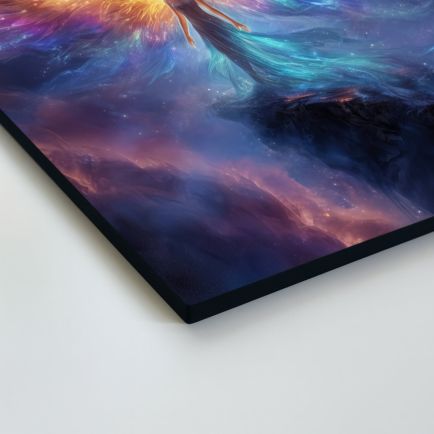 Význam obrazu: Obraz symbolizuje prítomnosť svetla a nádeje v nekonečnom vesmíre, kde anjel so žiariacimi krídlami funguje ako neúnavný strážca pokoja.