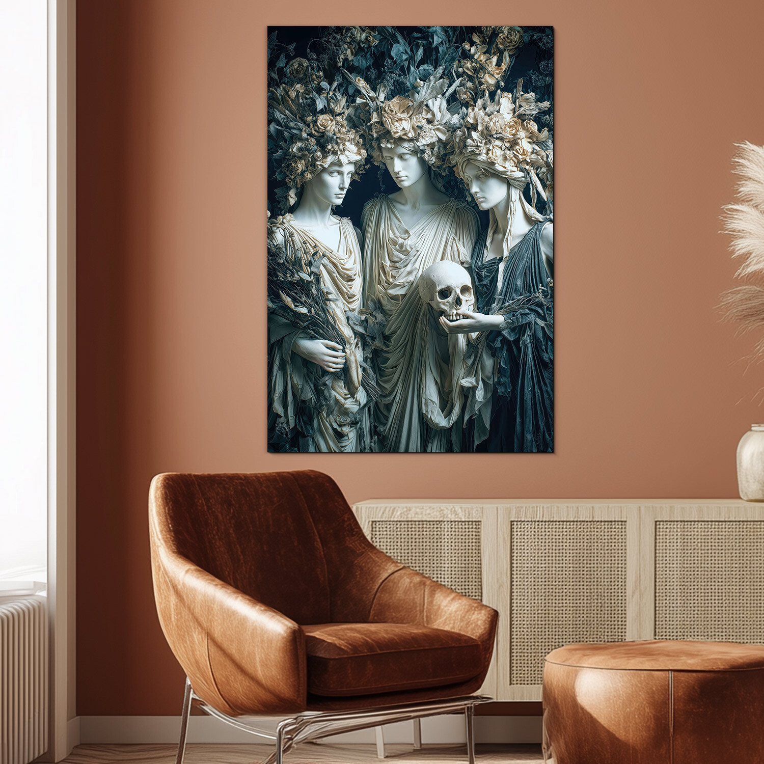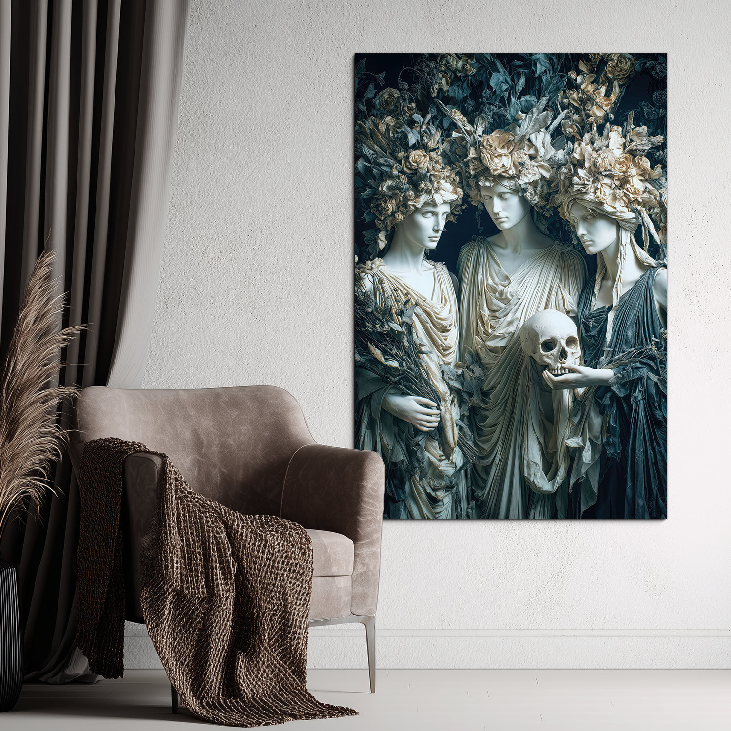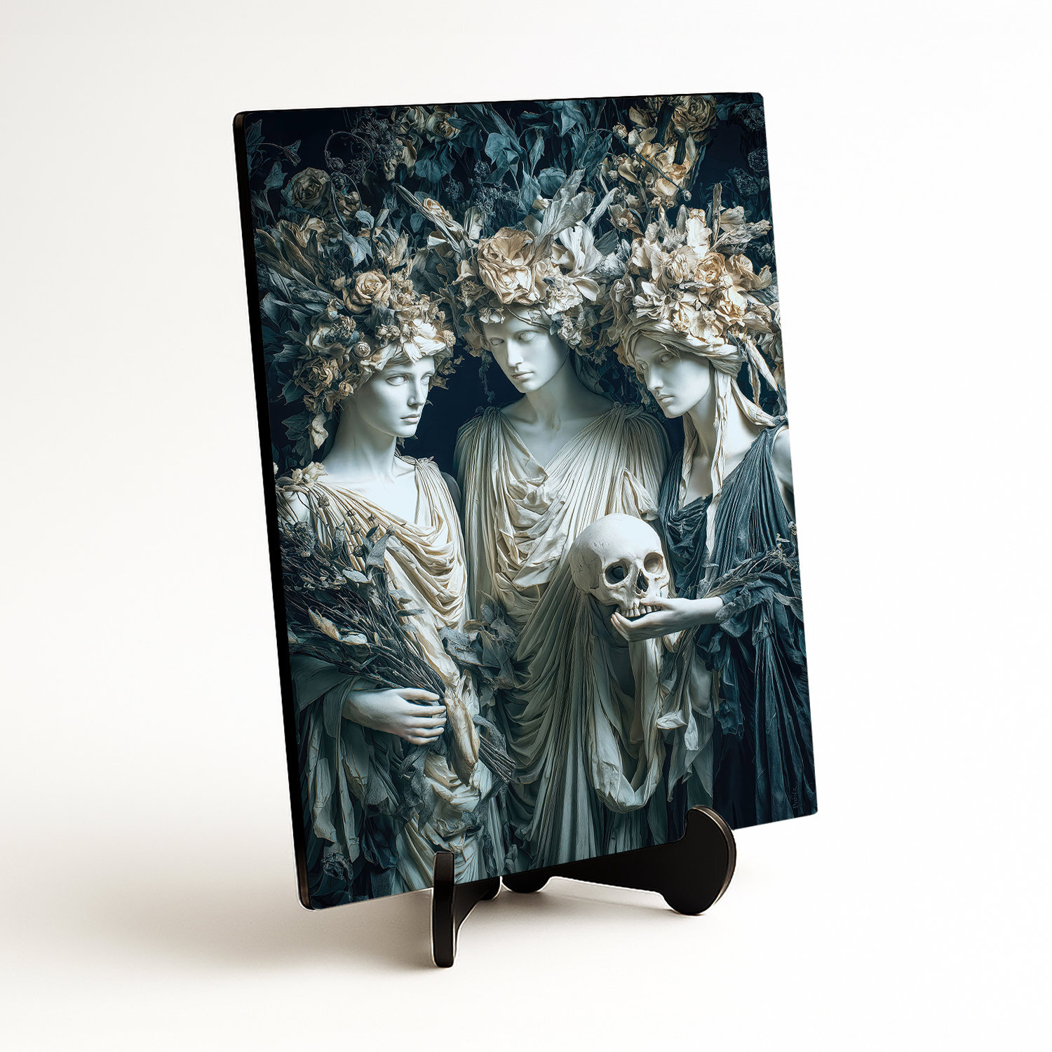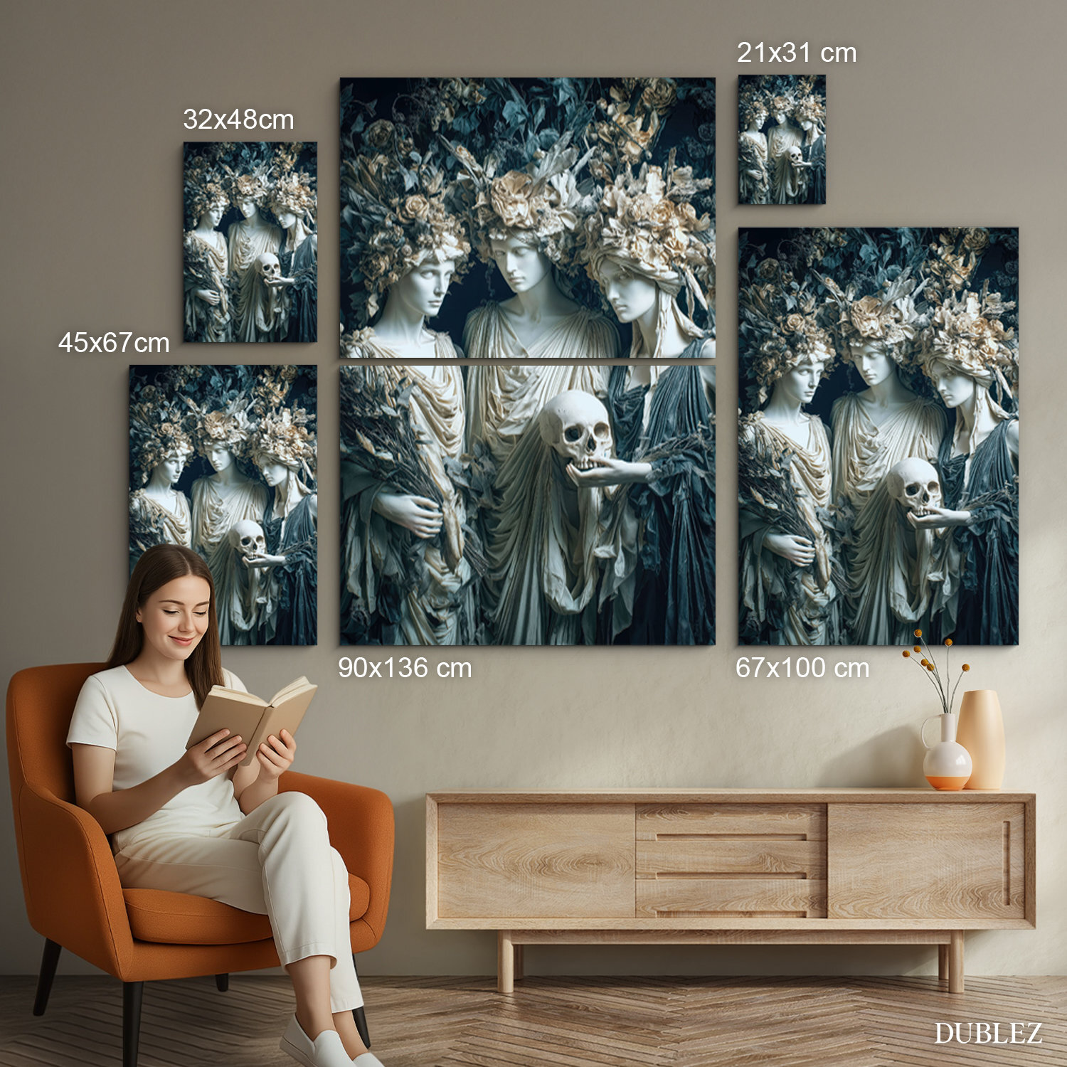 Drevený obraz prináša fascinujúce spojenie antickej krásy a pominuteľnosti. Tri ženské postavy, pripomínajúce mramorové sochy, sú odeté v jemne riasených tógach a zdobené bohatými kvetinovými korunami. Ústredným prvkom kompozície je lebka, ktorú jedna z postáv drží v rukách, čo dielu dodáva hlboký filozofický rozmer v štýle memento mori. Vďaka tlmenej farebnosti a detailnému tieňovaniu pôsobí obraz mimoriadne elegantne a stane sa neprehliadnuteľným prvkom v každom klasickom aj modernom interiéri.