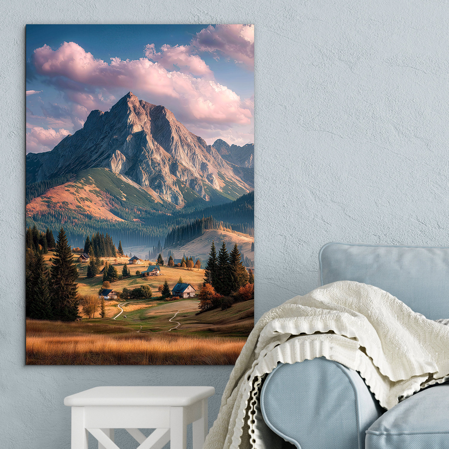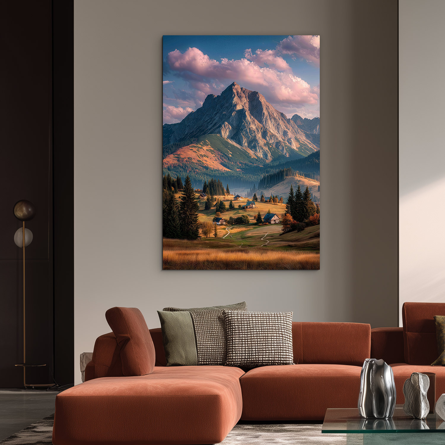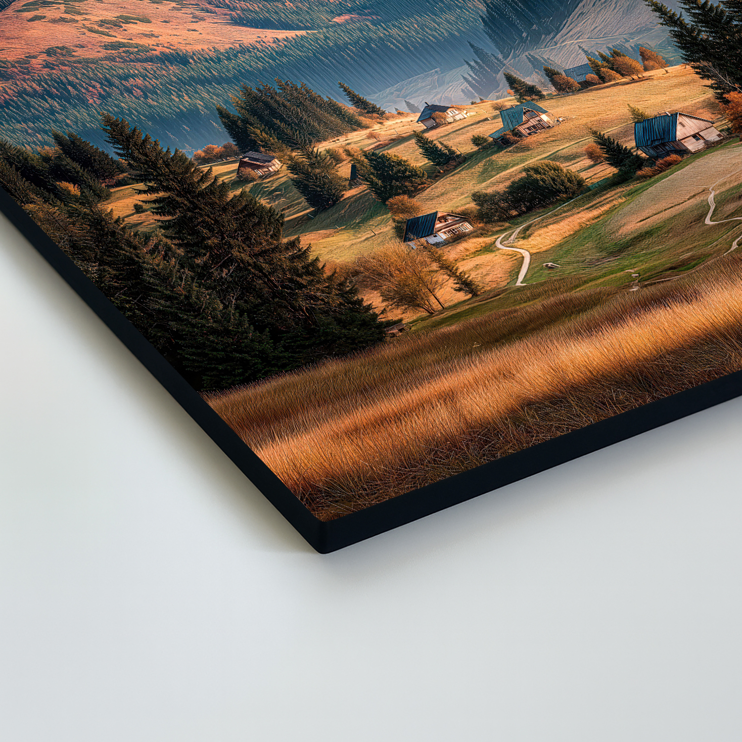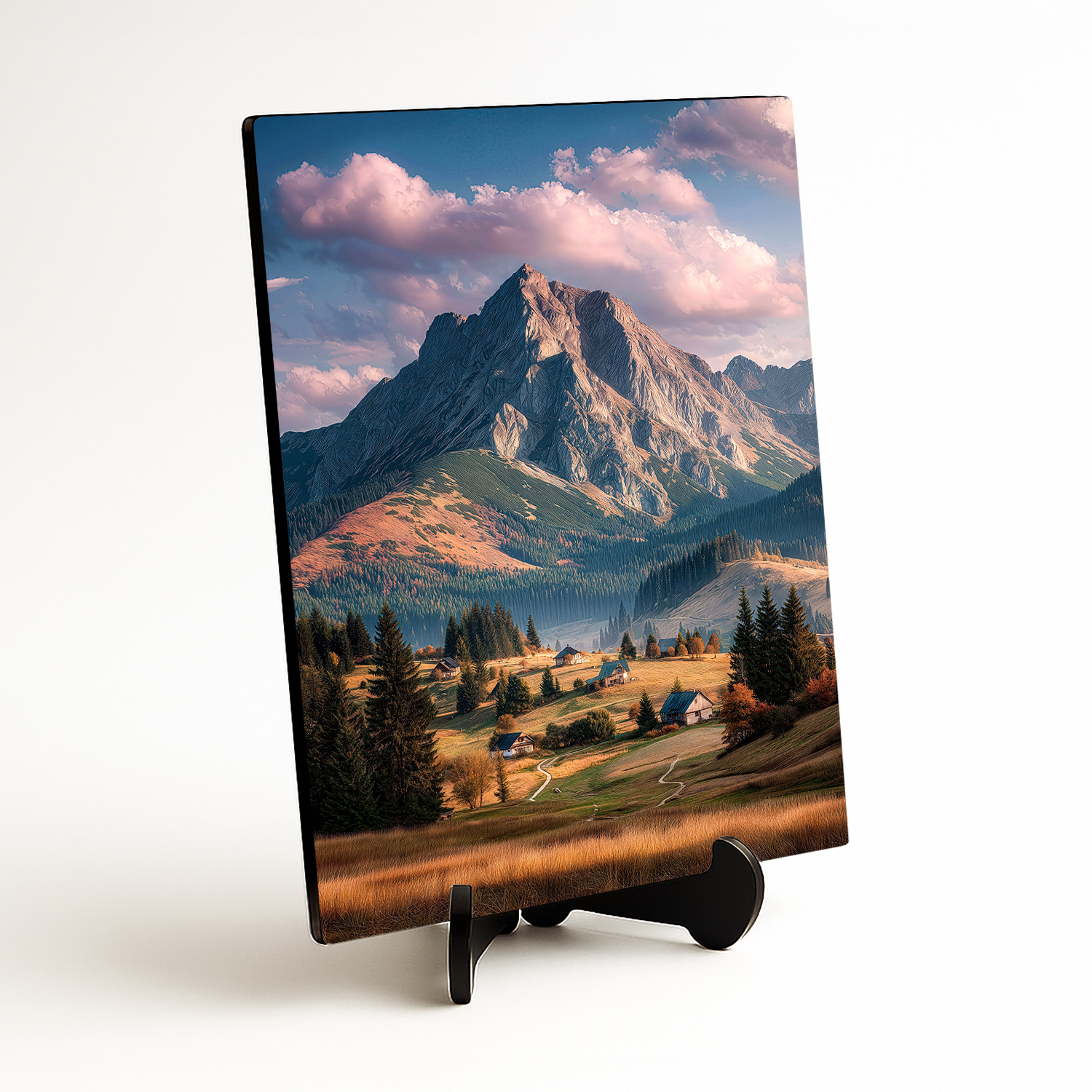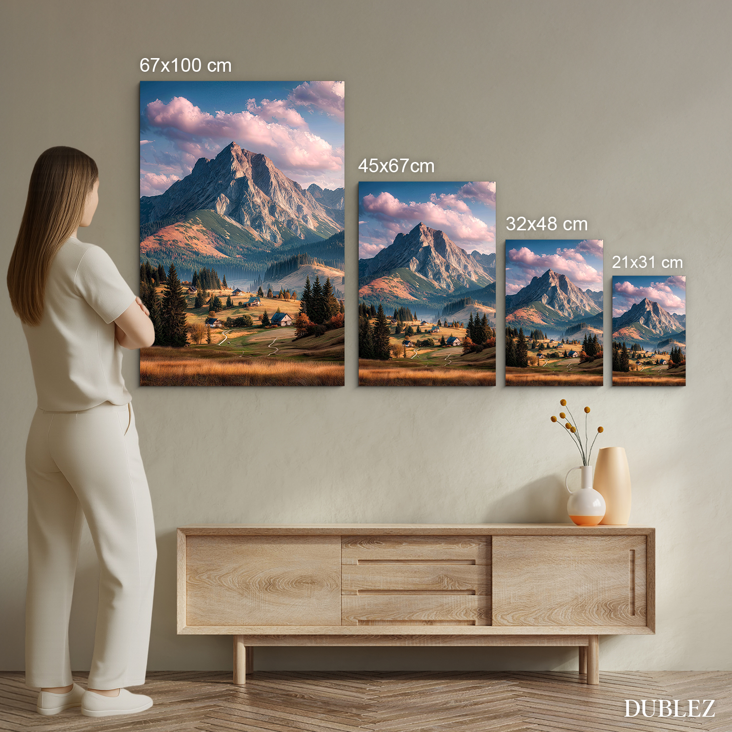 Drevený obraz – Dedinka v objatí hôr zachytáva jeden z tých výhľadov, ktoré sa navždy vryjú do srdca. Svetlo zapadajúceho slnka maľuje krajinu do teplých odtieňov, vďaka čomu obraz pôsobí útulne a harmonicky. Je to obraz, ktorý rozžiari každú obývačku, chodbu či spálňu. Skvelo doplní interiér v rustikálnom alebo chalupárskom štýle, no vynikne aj v modernom priestore, kde prinesie dotyk prírody a pokoja.
