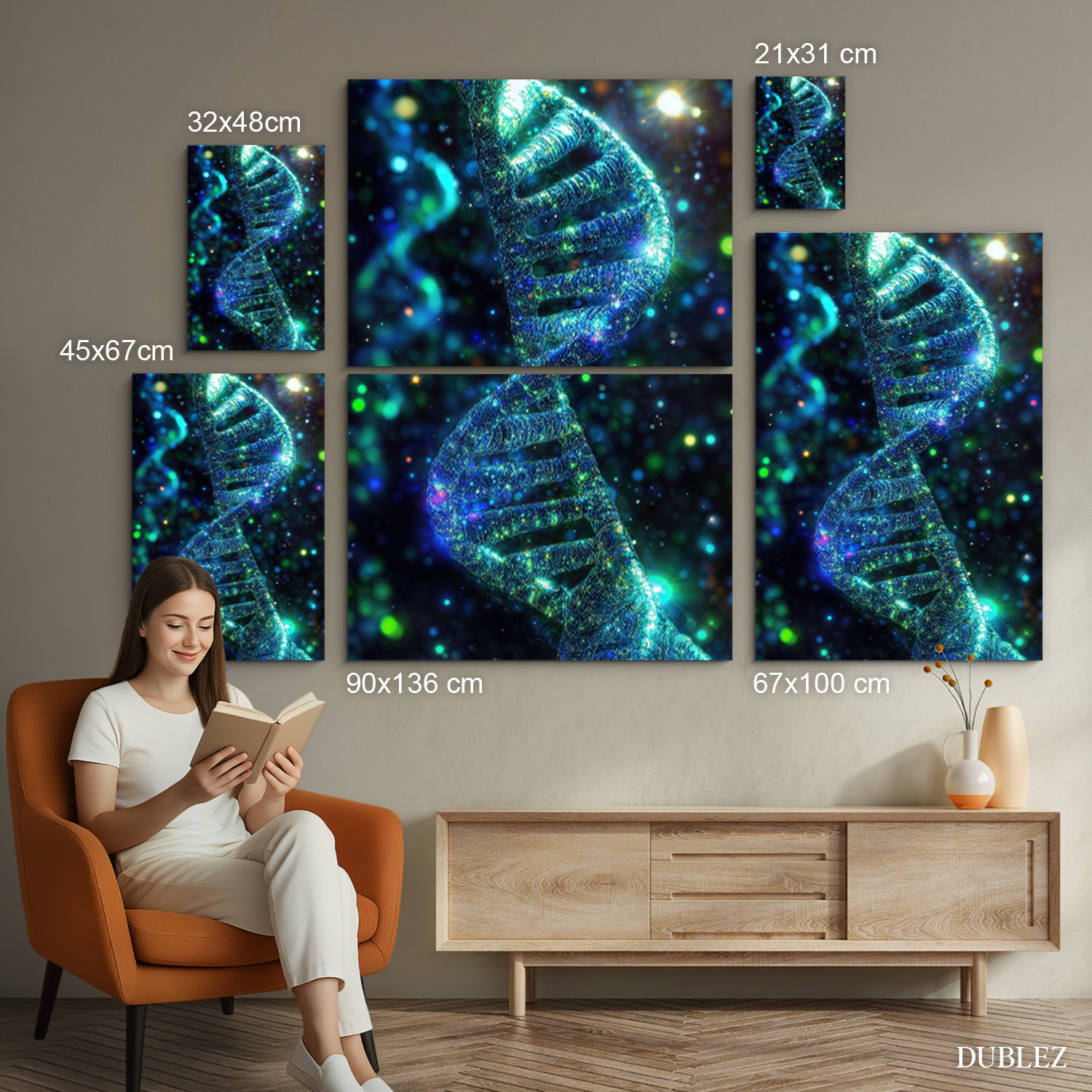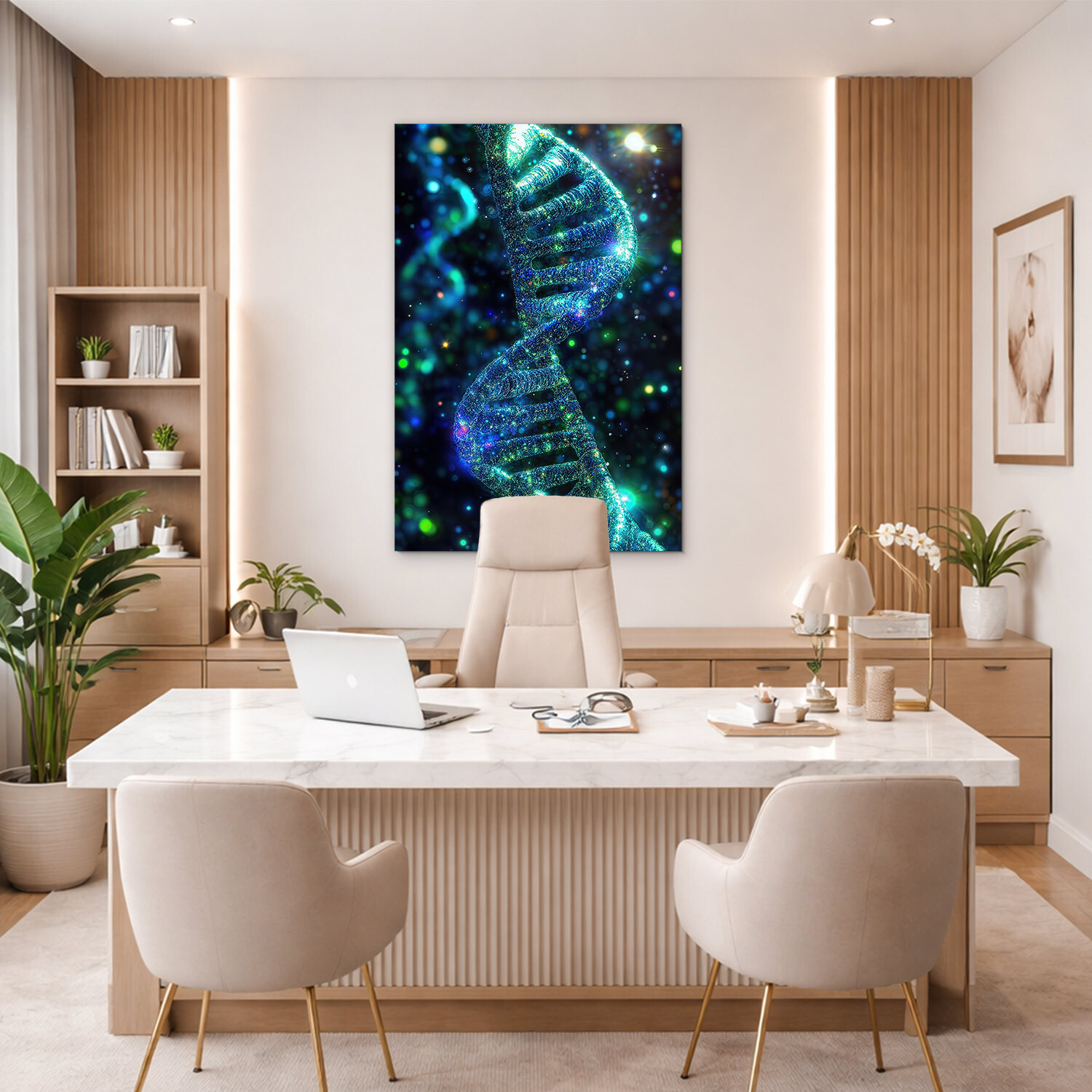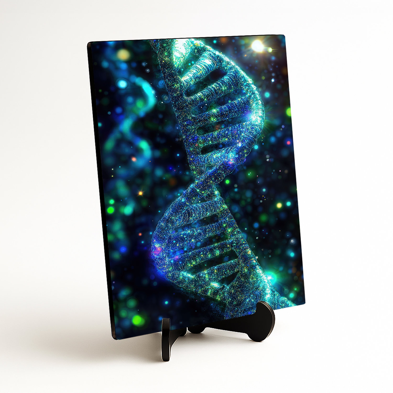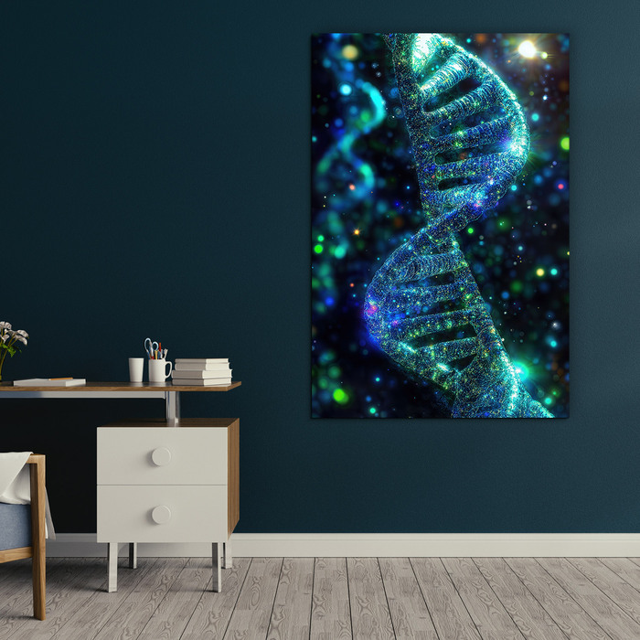 Moderný obraz zachytáva ľudskú DNA vo fascinujúcich farbách. Žiarivé modré, zelené a zlatisté častice vystupujú z tmavého pozadia a vďaka precíznej tlači na drevo získava tento technologický motív nečakanú hĺbku a štýlový dizajn. Drevený obraz sa hodí ako reprezentatívny doplnok do kancelárie, študentskej izby alebo do lekárskych a vedeckých priestorov. Ak hľadáte darček pre biológa, lekára alebo technologického nadšenca, tento obraz na dreve je ideálnou voľbou.