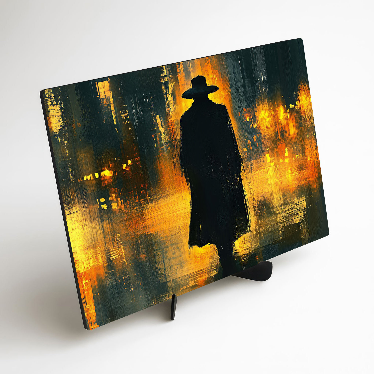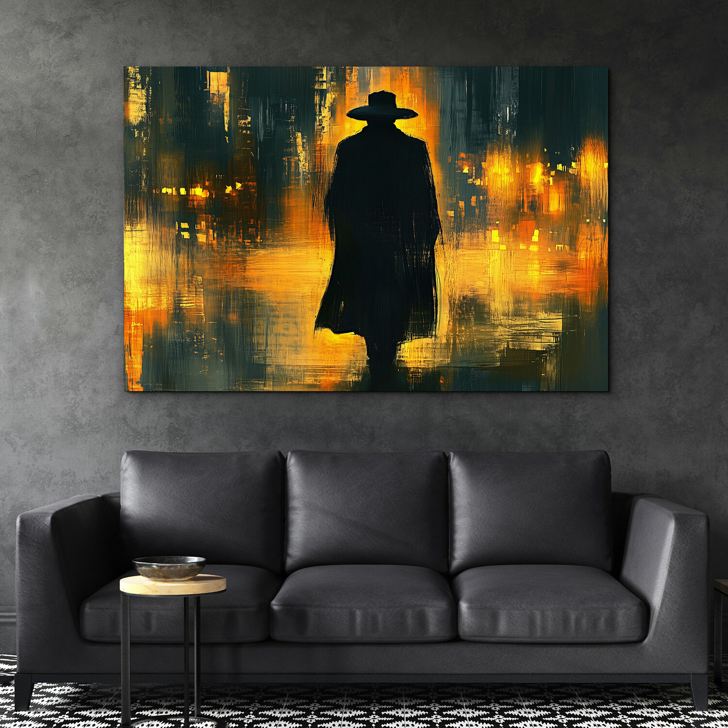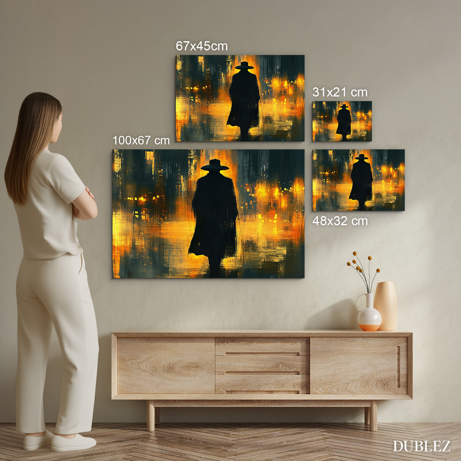 Dizajnový obraz na stenu spája filmový štýl s moderným spracovaním. Tajomný muž v dlhom kabáte a klobúku sa stráca v zlatistých svetlách mesta. Obraz sa hrá so svetlom a tieňom, pričom pozadie pripomína výklady, pouličné lampy alebo svetelné odrazy – ich neostrosť a rozpitý vzhľad perfektne zapadnú do industriálneho štýlu. Vynikne najmä v obývačke, kancelárii, bare či chodbe.