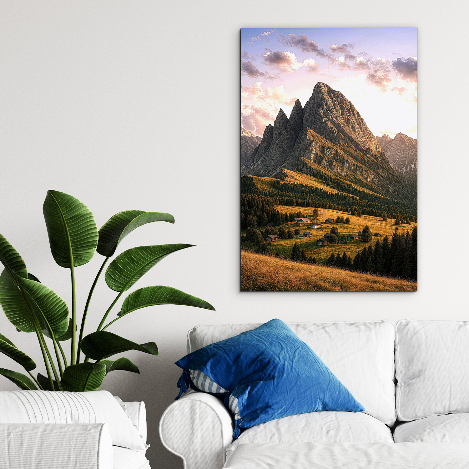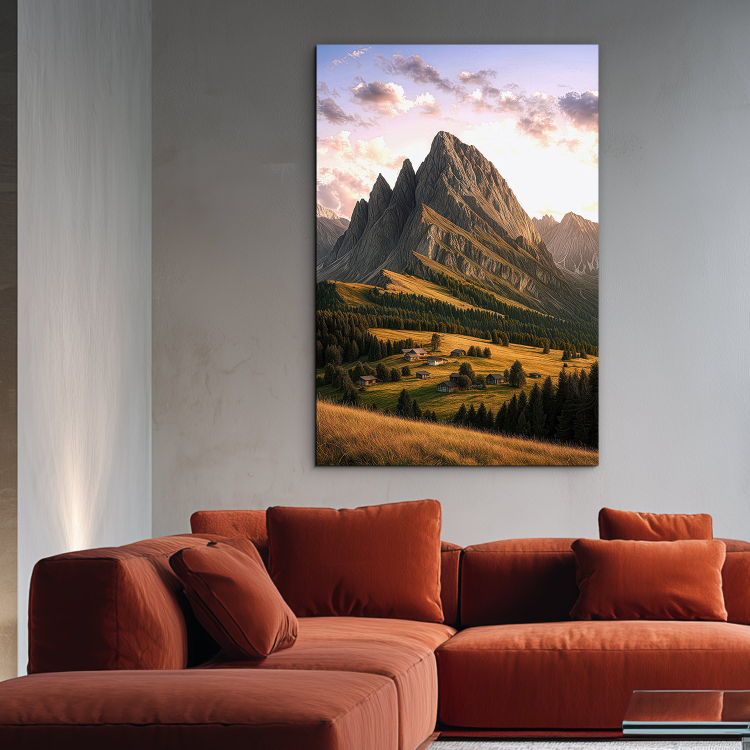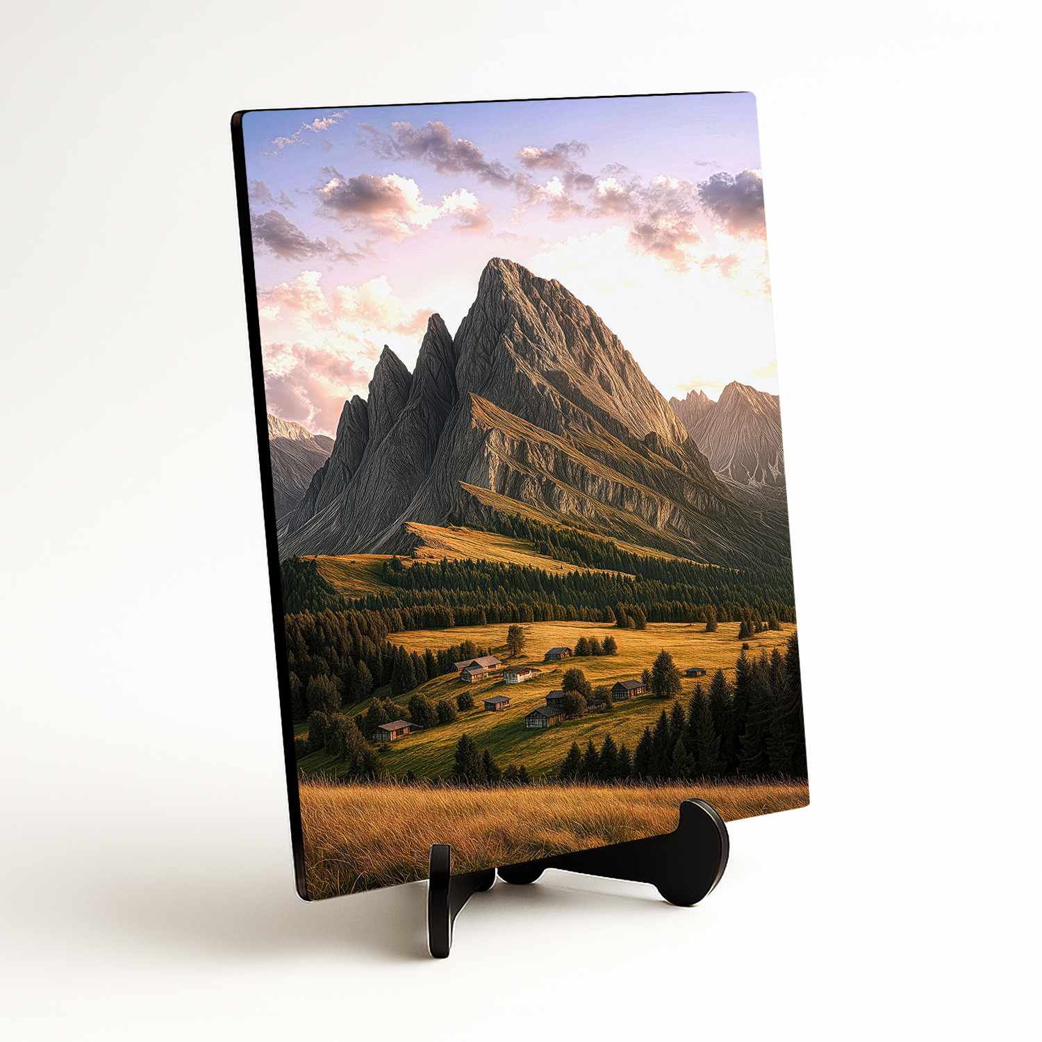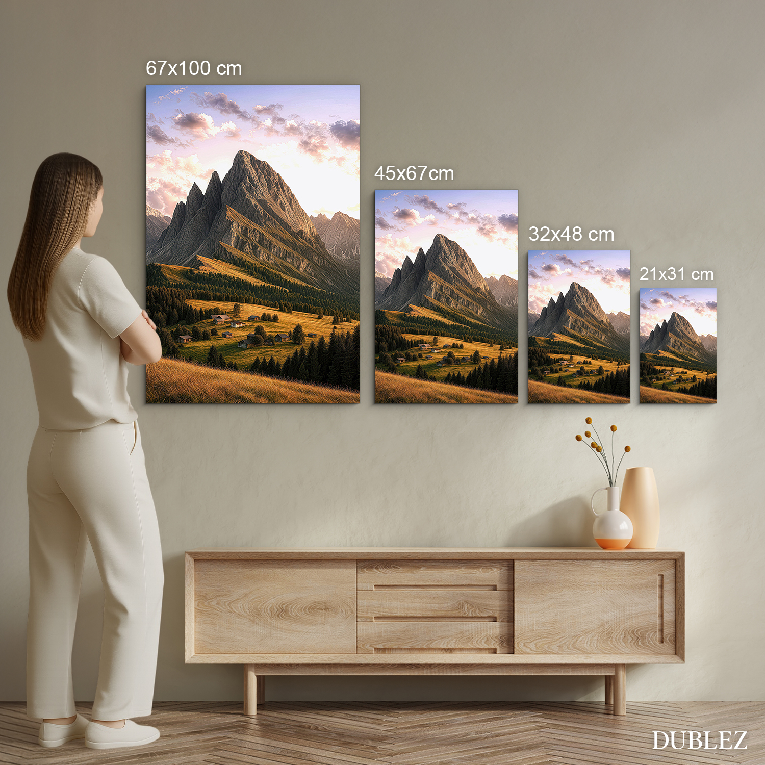 Farebný drevený obraz – Horský pokoj zachytáva čarovný okamih, keď sa slnko dotýka vrcholkov hôr a krajina ožíva v zlatistých odtieňoch. Realistické detaily horských svahov, lúk a malých drevených chalúpiek v údolí pôsobia ako z rozprávky. Skvelo sa hodí do obývačky, chodby alebo na chalupu, kde vytvorí pocit ticha a harmónie.