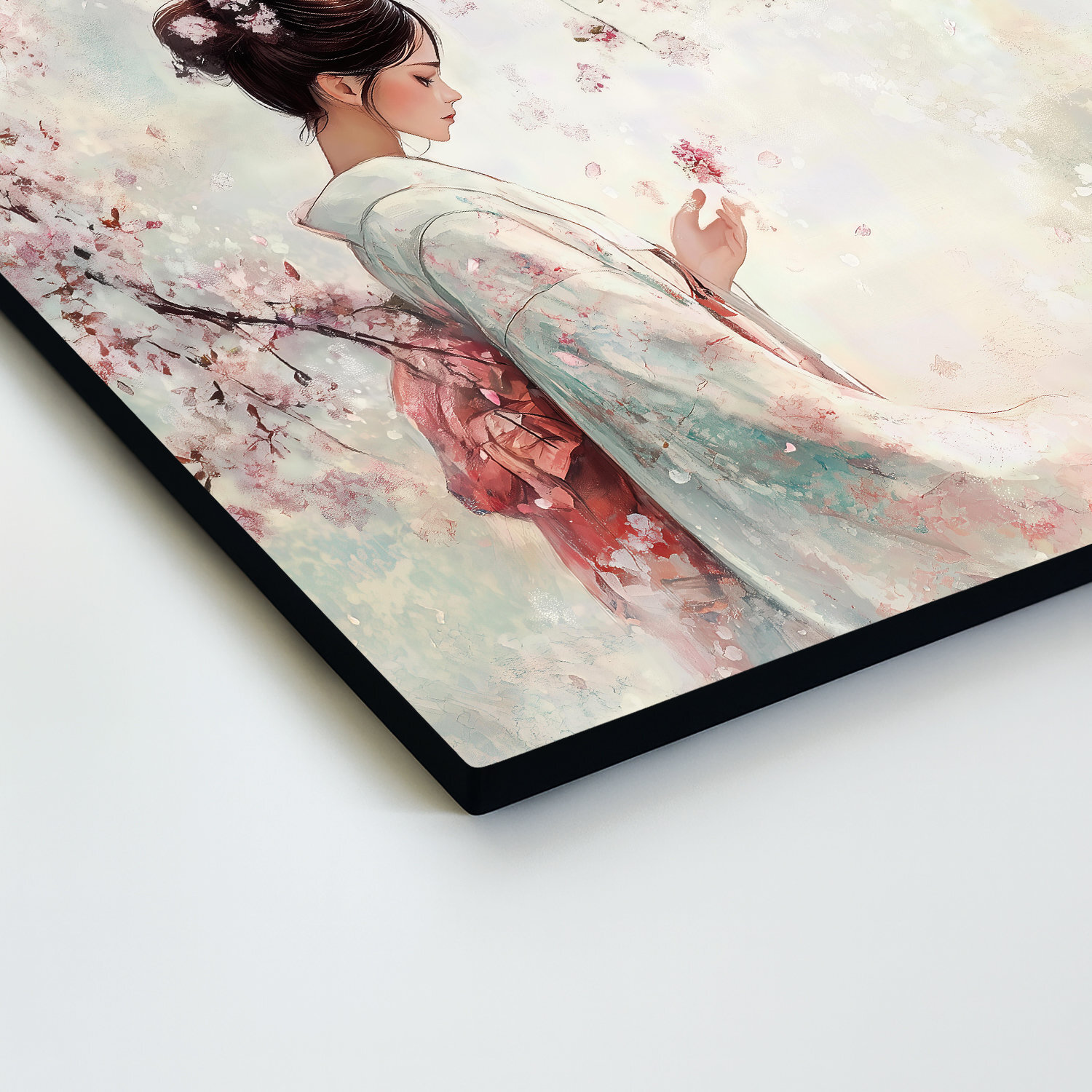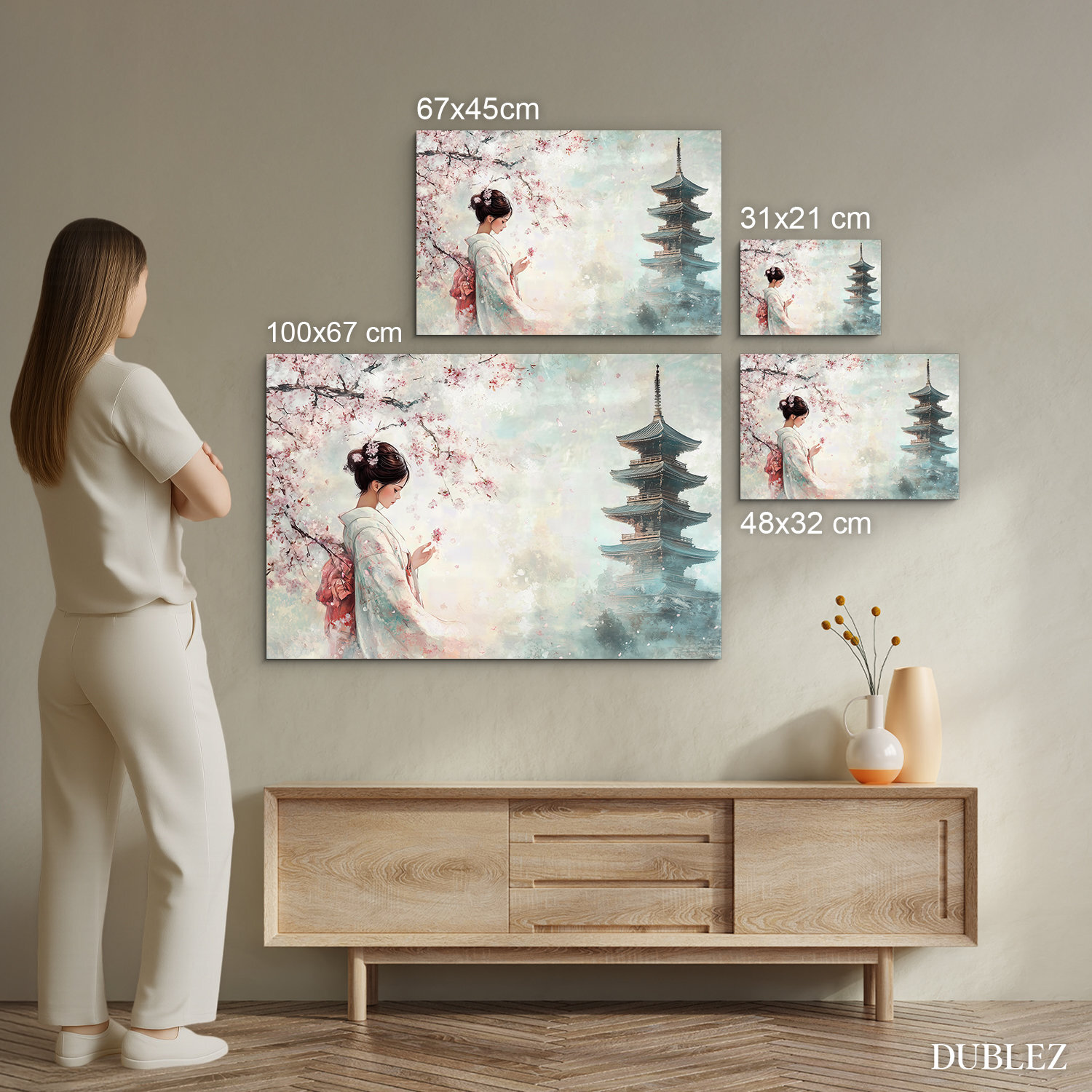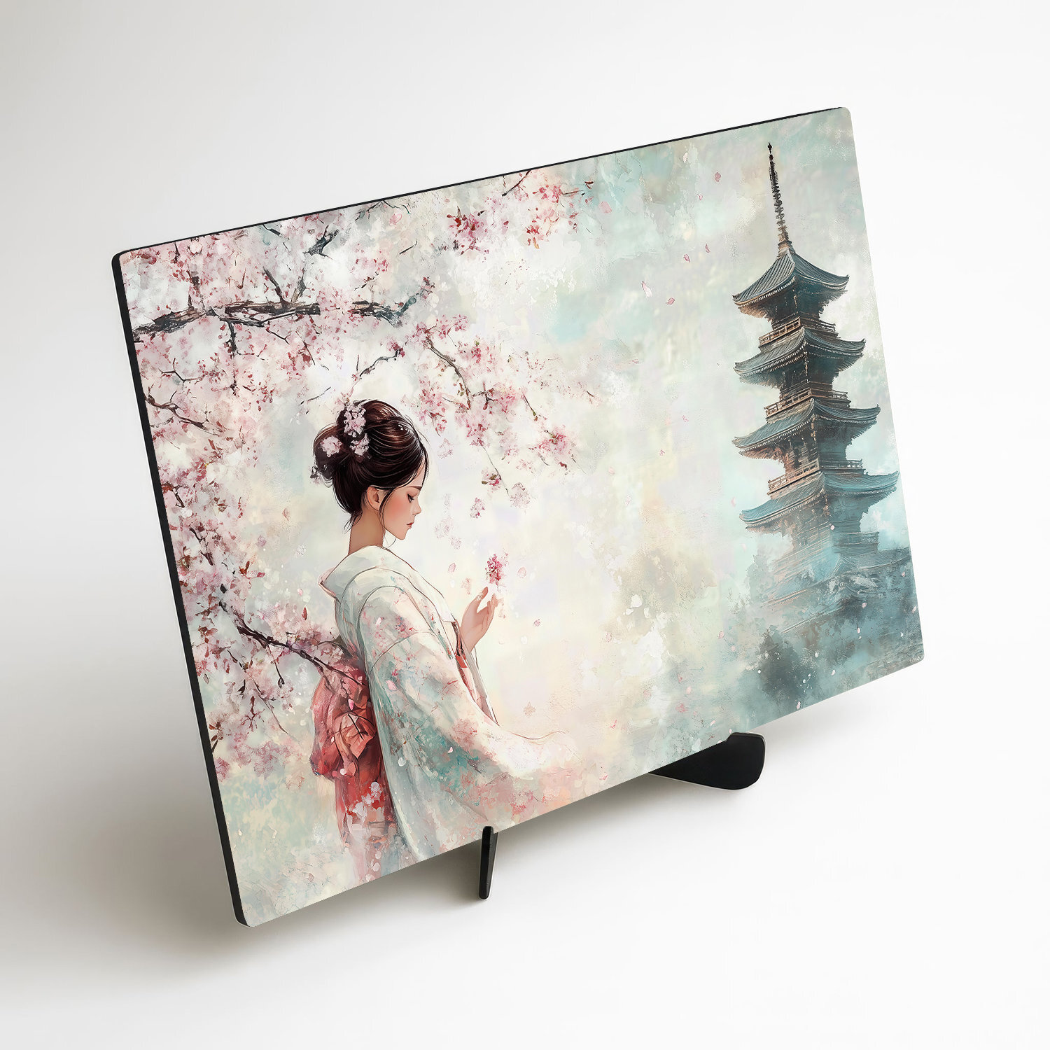 Moderný japonský obraz s motívom sakury zobrazuje jemnú a poetickú scénu plnú rovnováhy. Mladá žena v tradičnom kimone stojí pod rozkvitnutou čerešňou, drží v ruke kvet sakury a v tichom zamyslení vníma krásu okamihu. Drevený obraz zaujme prémiovými farbami a vynikne v spálni či obývačke.