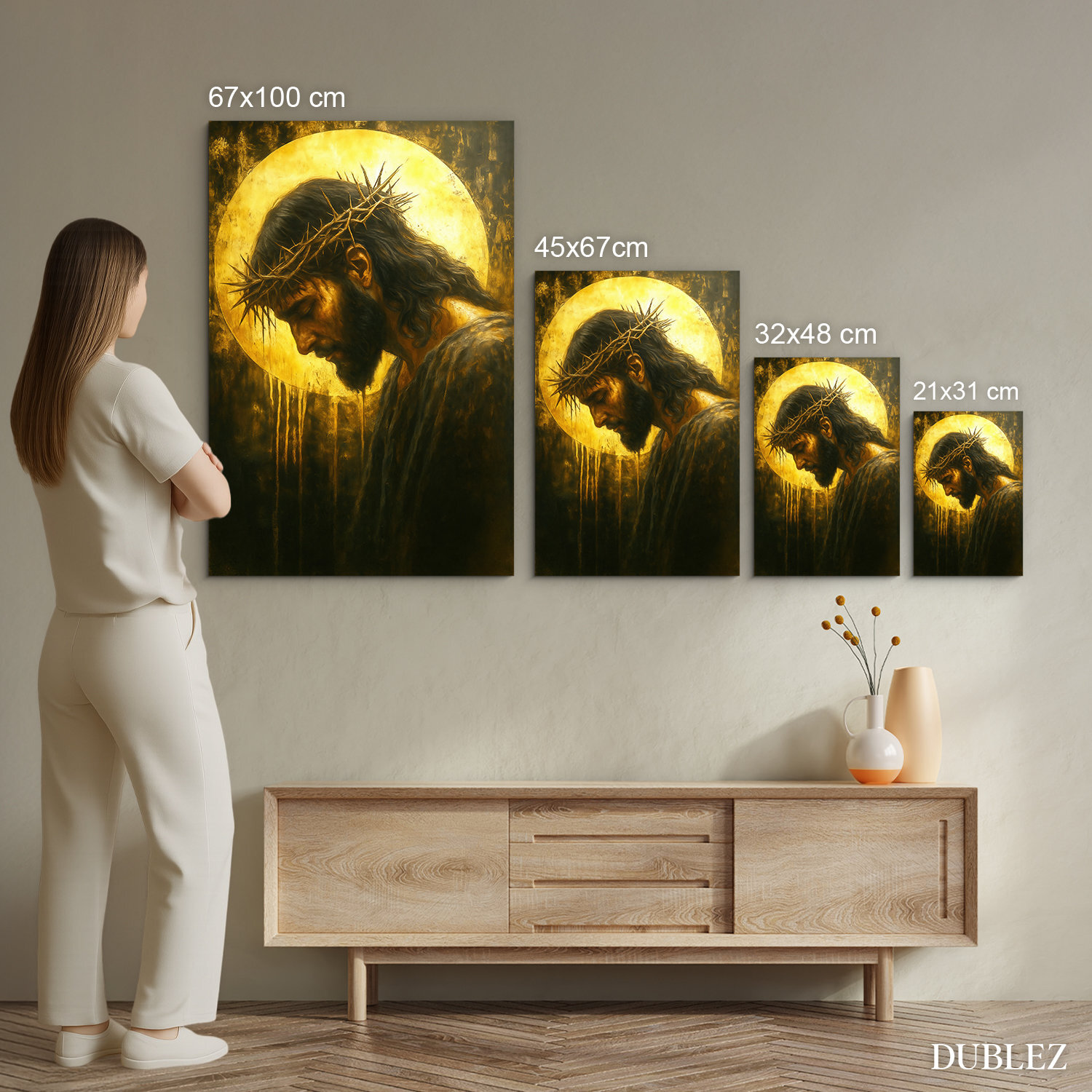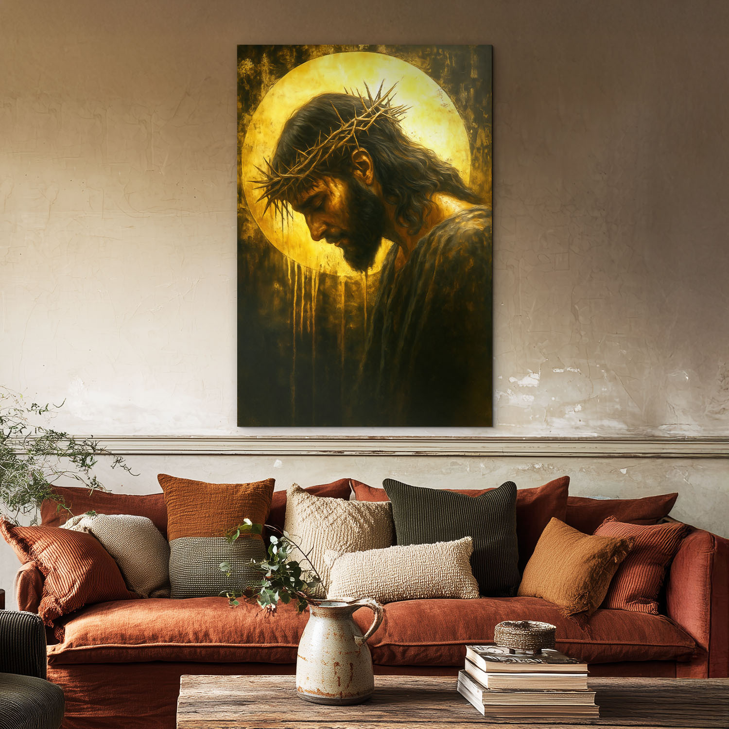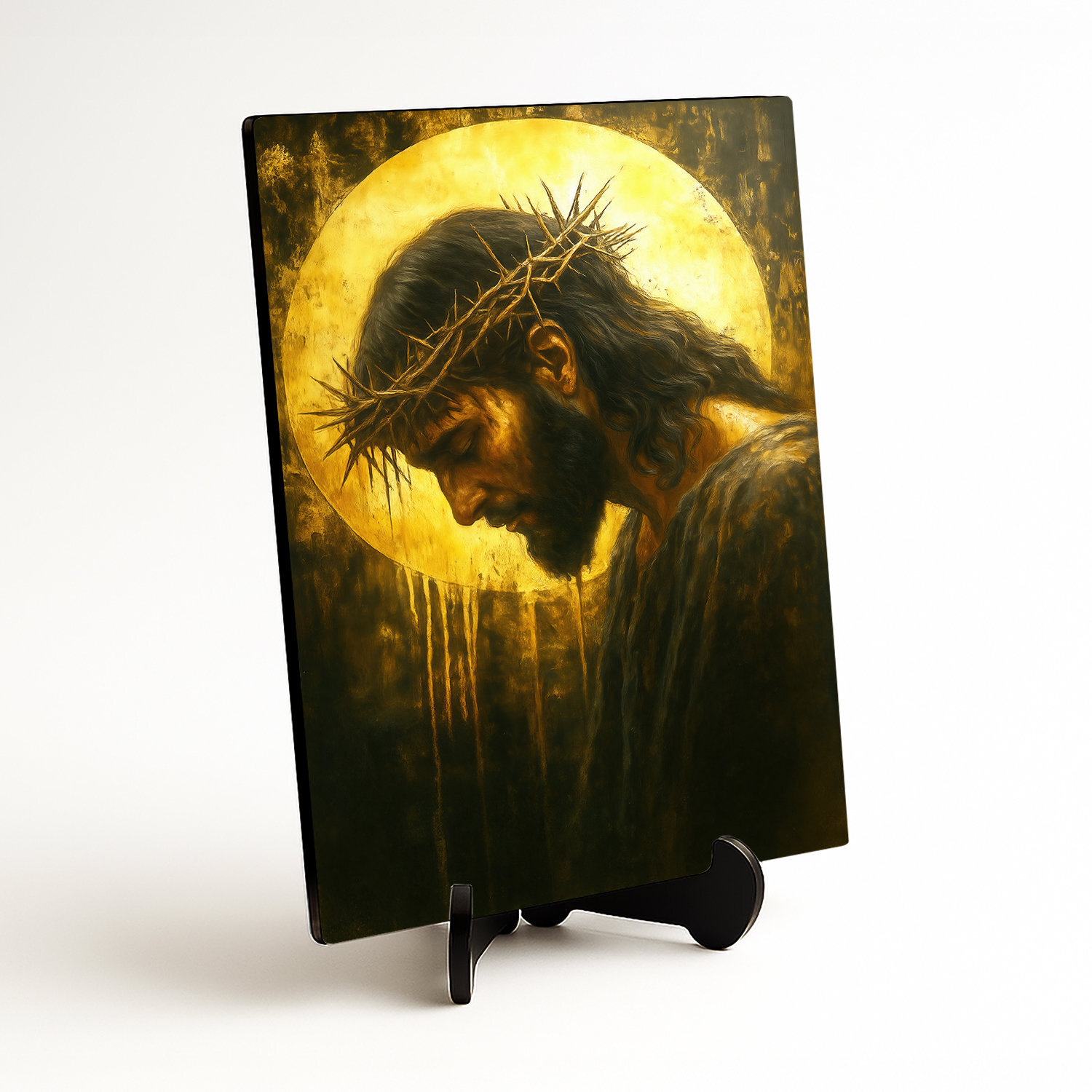 Moderný obraz zachytáva Ježiša ako pripomienku viery, odpustenia a vykúpenia. Tŕňová koruna, sklonená hlava a žiarivé pozadie vytvárajú nadčasovú kresťanskú dekoráciu. Drevený obraz Ježiša je ideálny do obývačky, spálne alebo kuchyne. Skvelý darček pre veriacich.