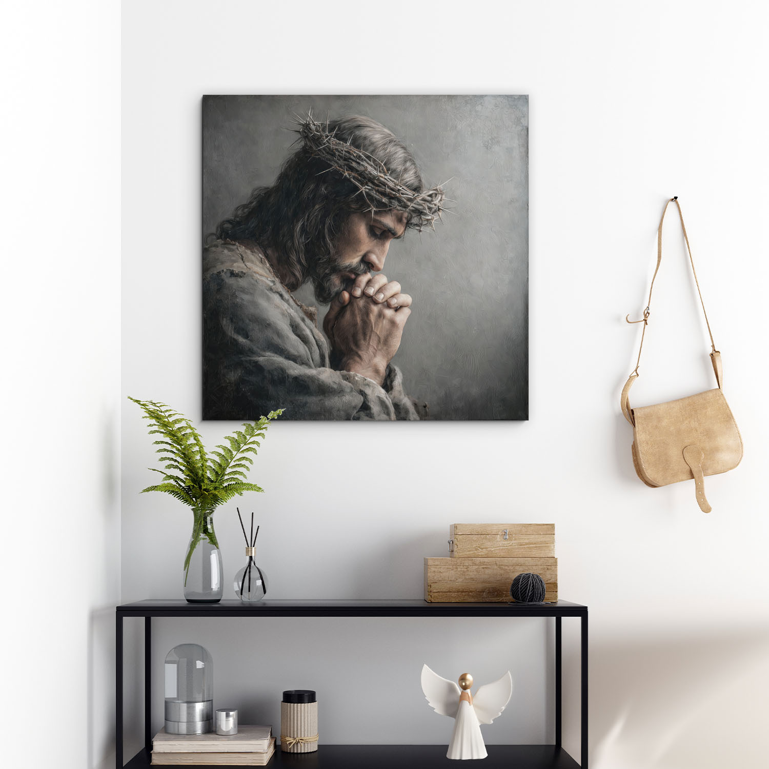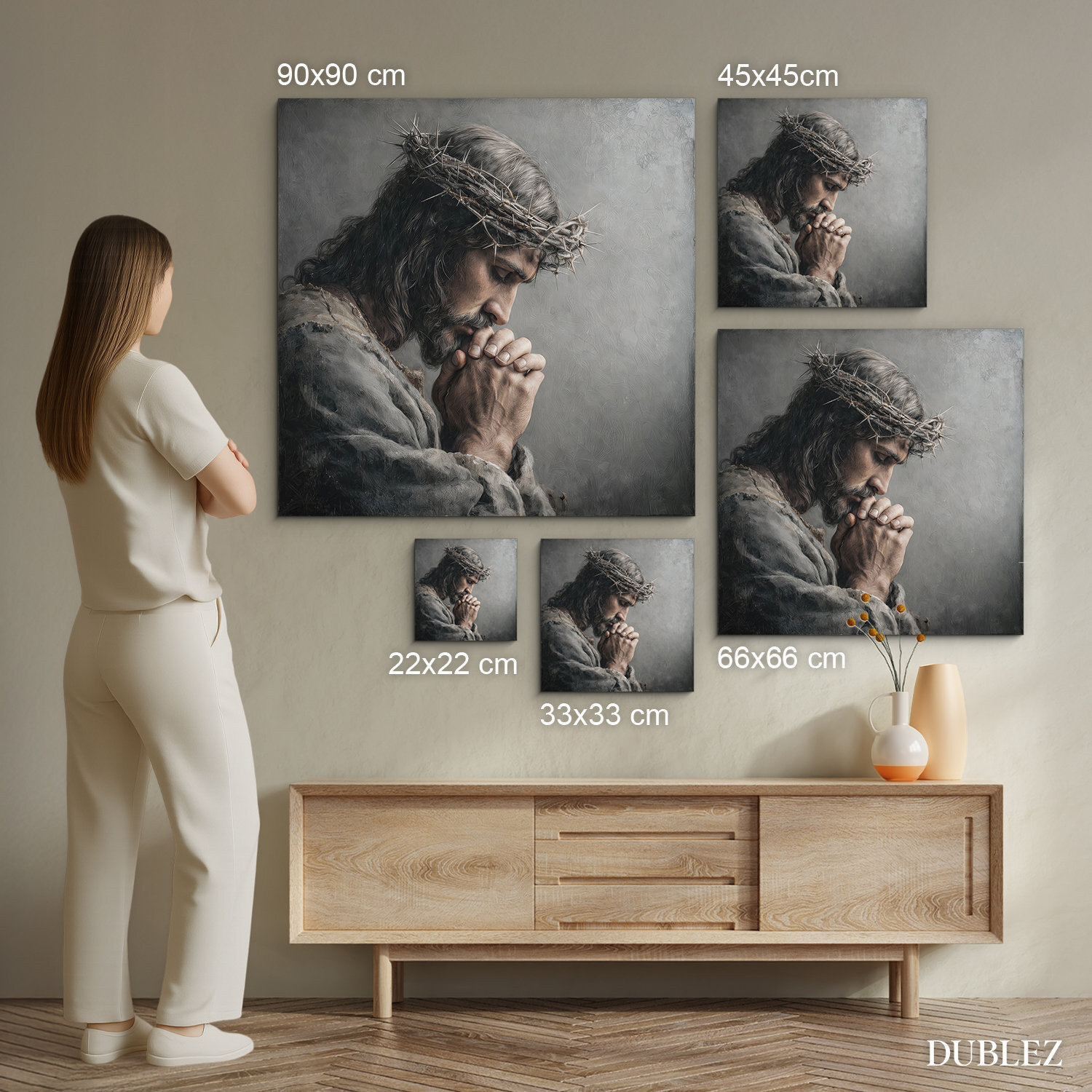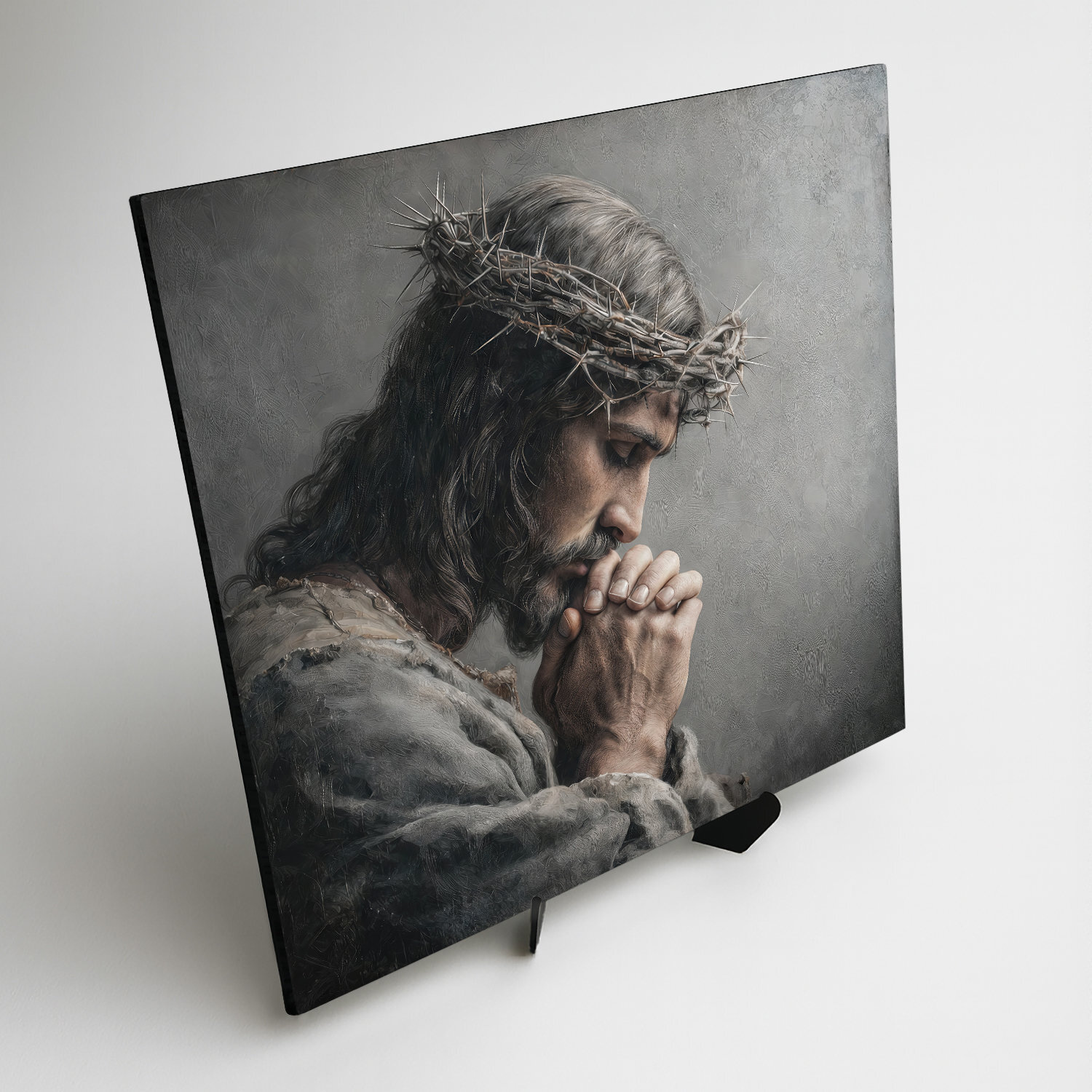 Drevený obraz - Modliaci sa Ježiš Kristus s tŕňovou korunou prináša do interiéru ticho, pokoru a vieru. Umelecké stvárnenie Ježiša je vhodné do tradičných aj moderných domácností. Do obývačky, spálne, pri vstup alebo nad stôl. Vďaka tlmeným farbám obraz nepôsobí rušivo, ale prirodzene splýva s každým interiérom.