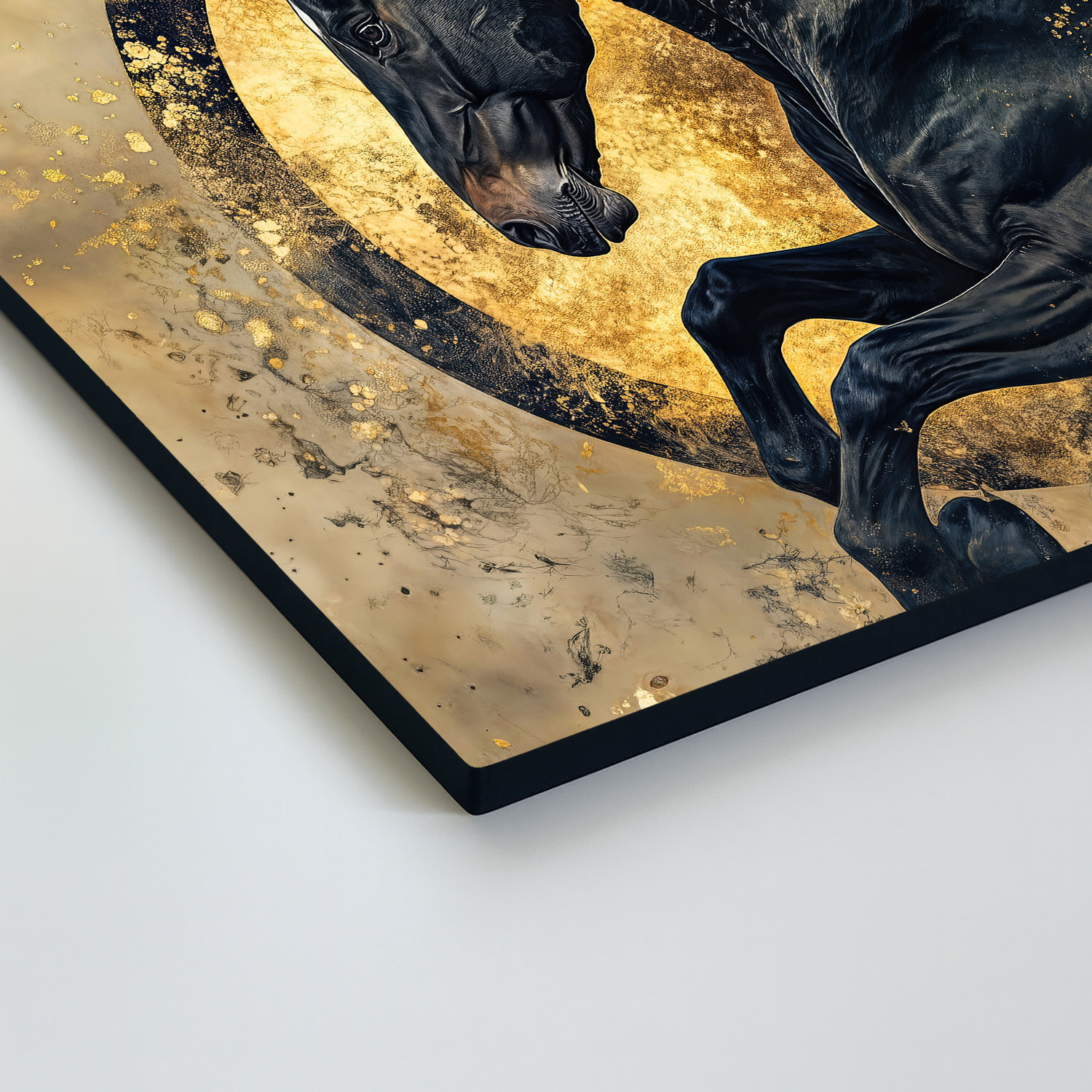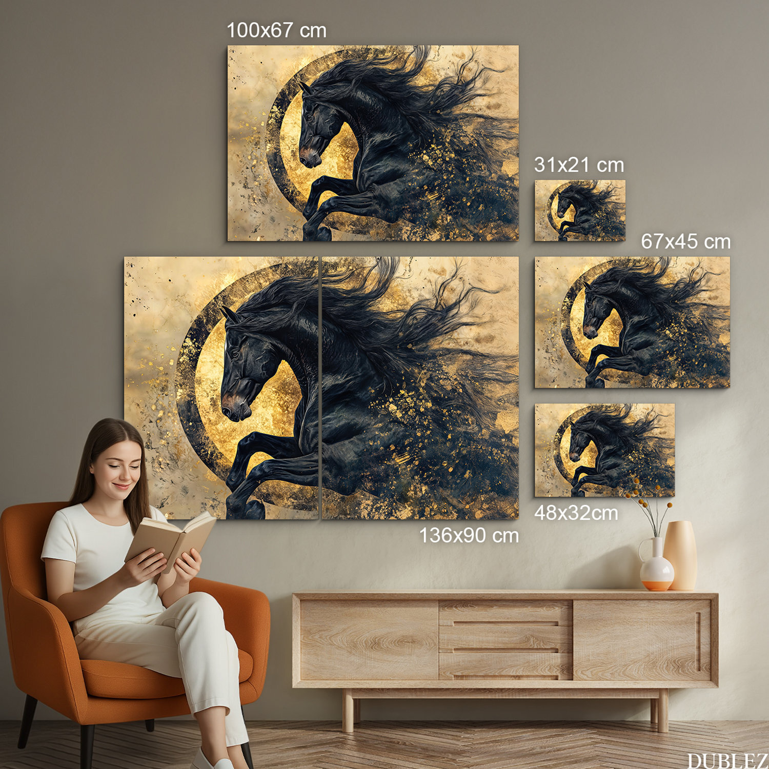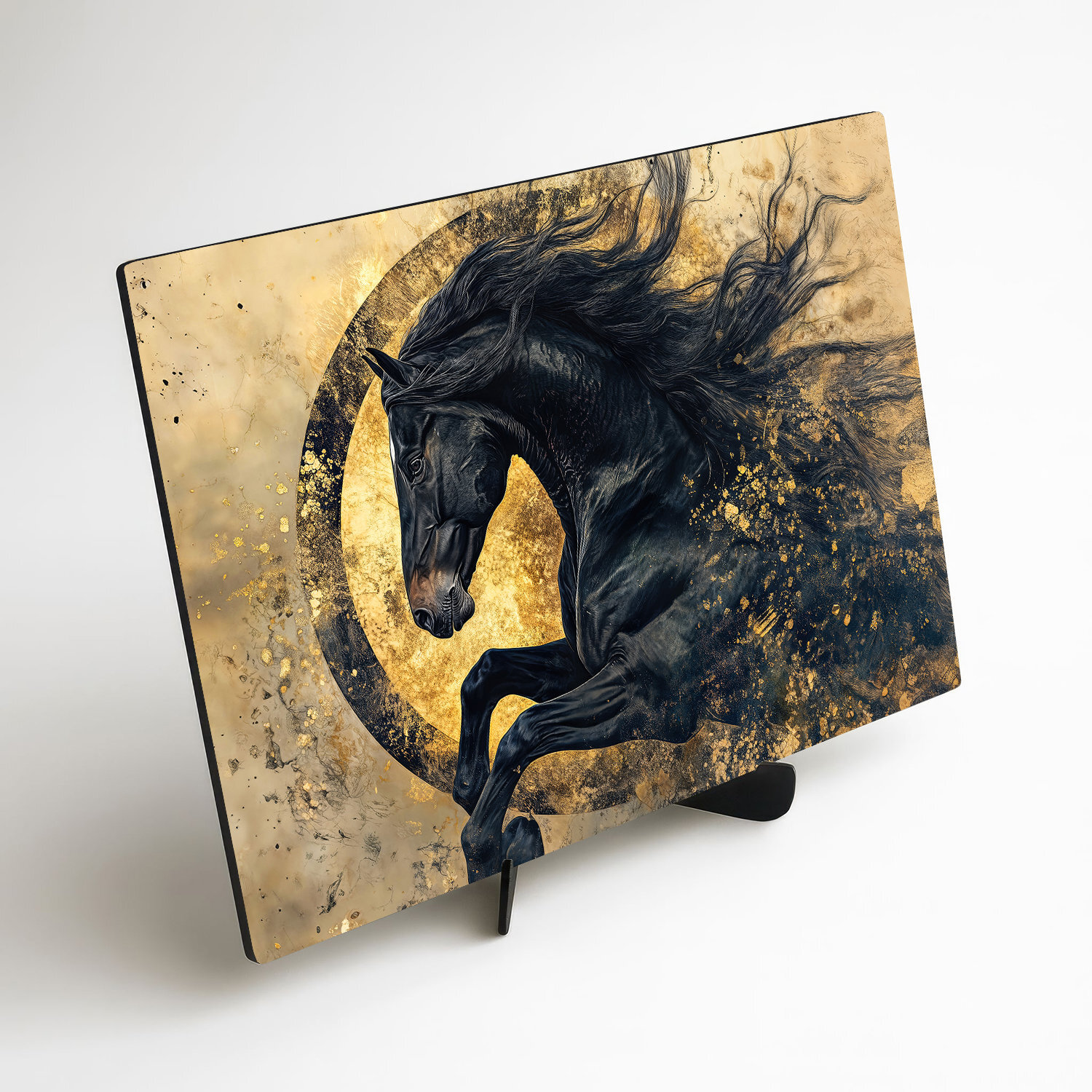 Drevený obraz koňa zachytáva cválajúceho čierneho mustanga. Kôň je umiestnený pred zlatým kruhom, ktorý symbolizuje silu, slobodu a vznešenosť tohto divokého zvieraťa. Zlaté tóny obrazu vytvárajú dojem luxusu a originálneho štýlu. Obraz koňa vynikne v obývačke, spálni alebo v kancelárii.