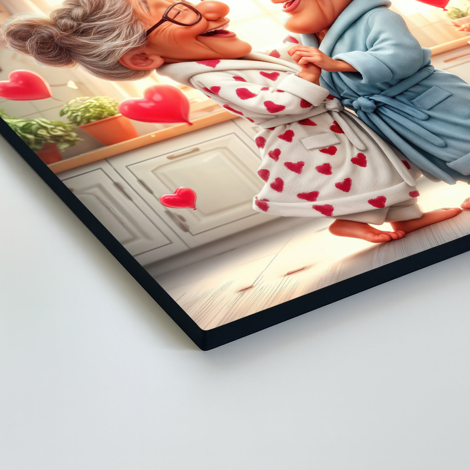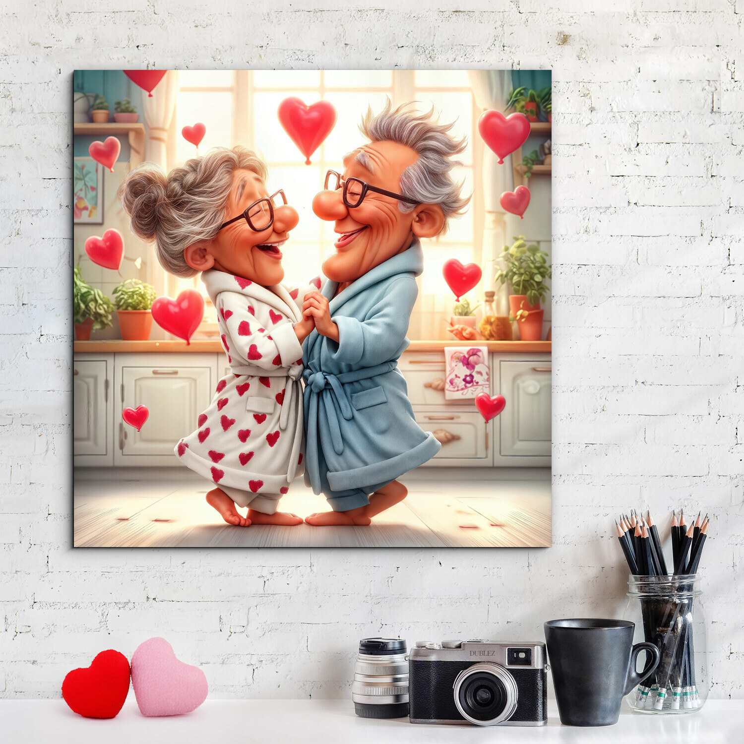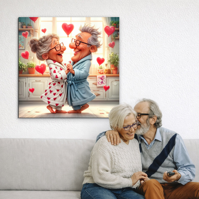 Význam obrazu: Obraz oslavuje krásu dlhoročného vzťahu a pripomína, že láska nemá vekové hranice a najlepšie chutí s dávkou humoru. Postavičky v županoch v domácom prostredí symbolizujú pohodu, bezpečie a každodenné maličkosti, ktoré tvoria skutočný domov.