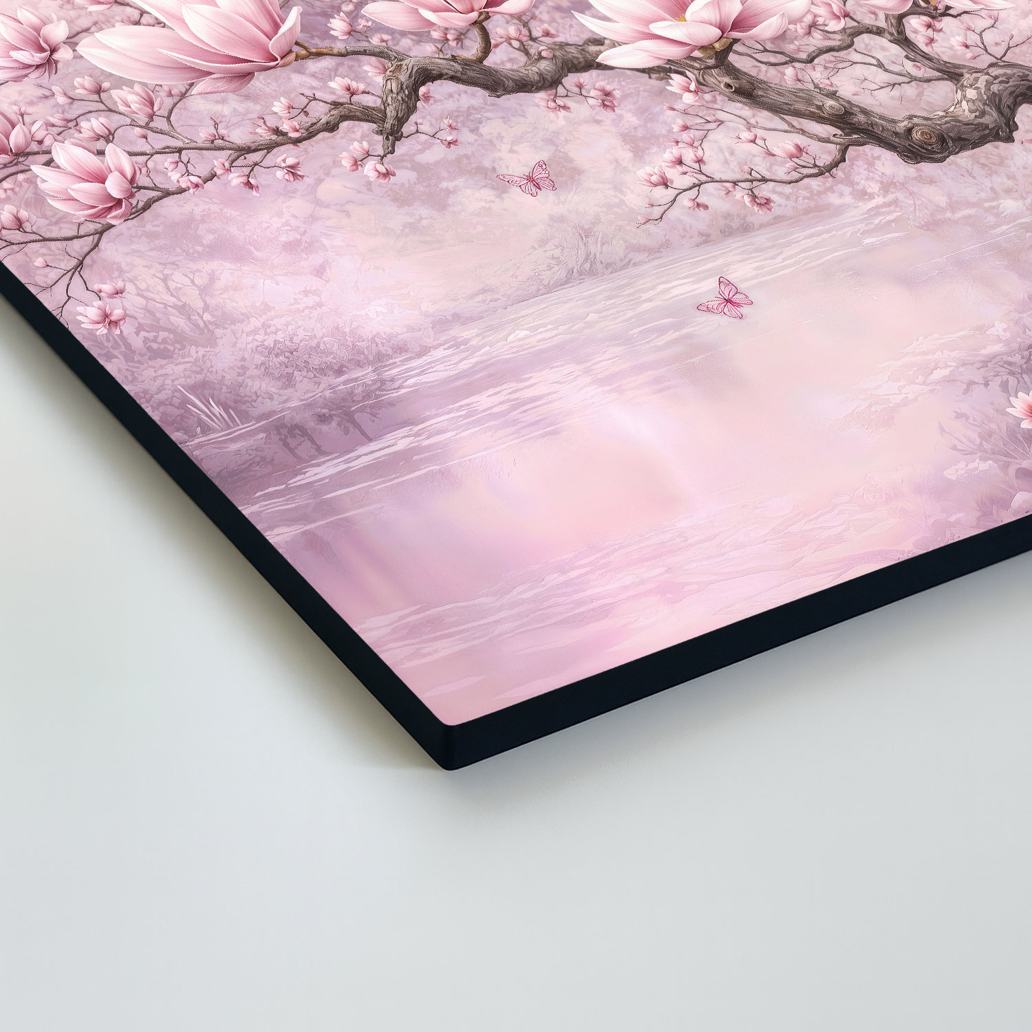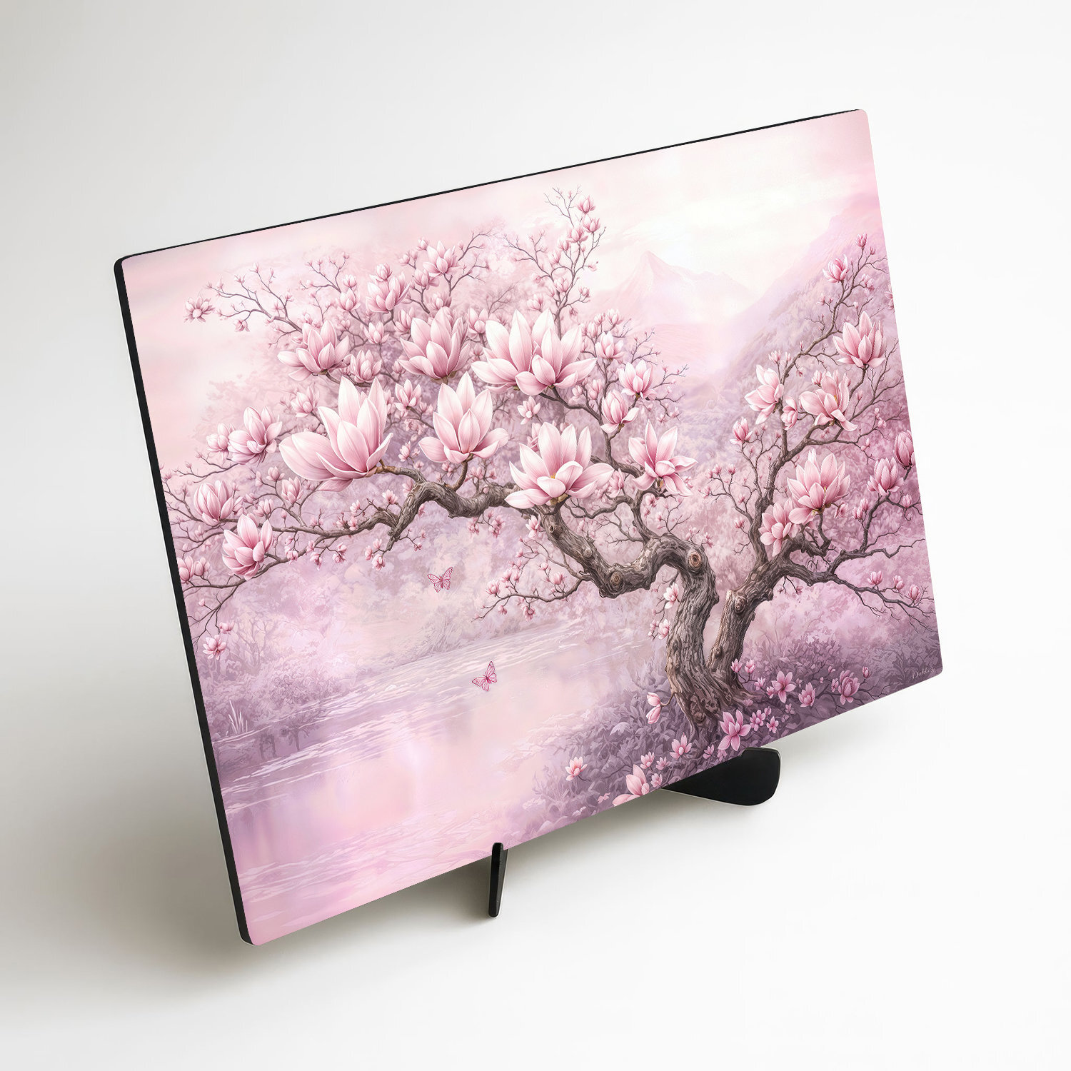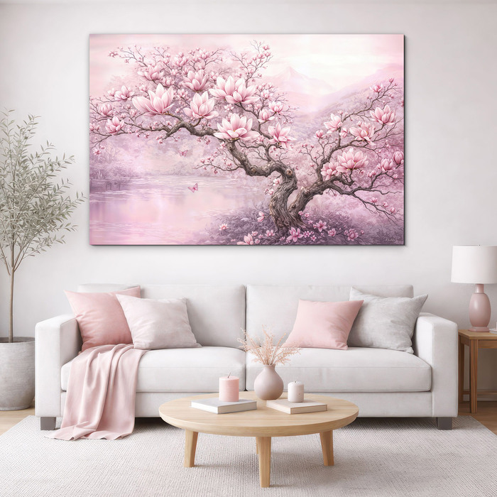 Vneste do svojho domova závan jari, elegancie a jemnosti s ružovým obrazom Magnólia v rozkvete. Drevený obraz zachytáva nádherný strom magnólie, ktorý sa rozvinul do bohatej záplavy ružových kvetov. Celková kompozícia kvetov, pokojného jazera a jemných motýľov pôsobí upokojujúco a do každého interiéru vnáša romantickú atmosféru. Paleta púdrovej ružovej prirodzene zútulňuje priestor a vynikne v obývačke, spálni či dievčenskej izbe.