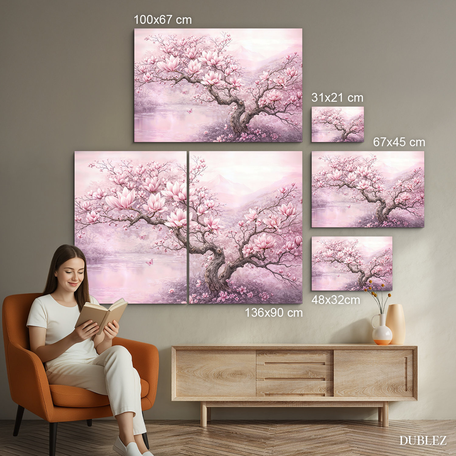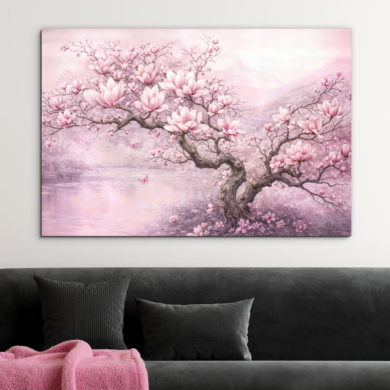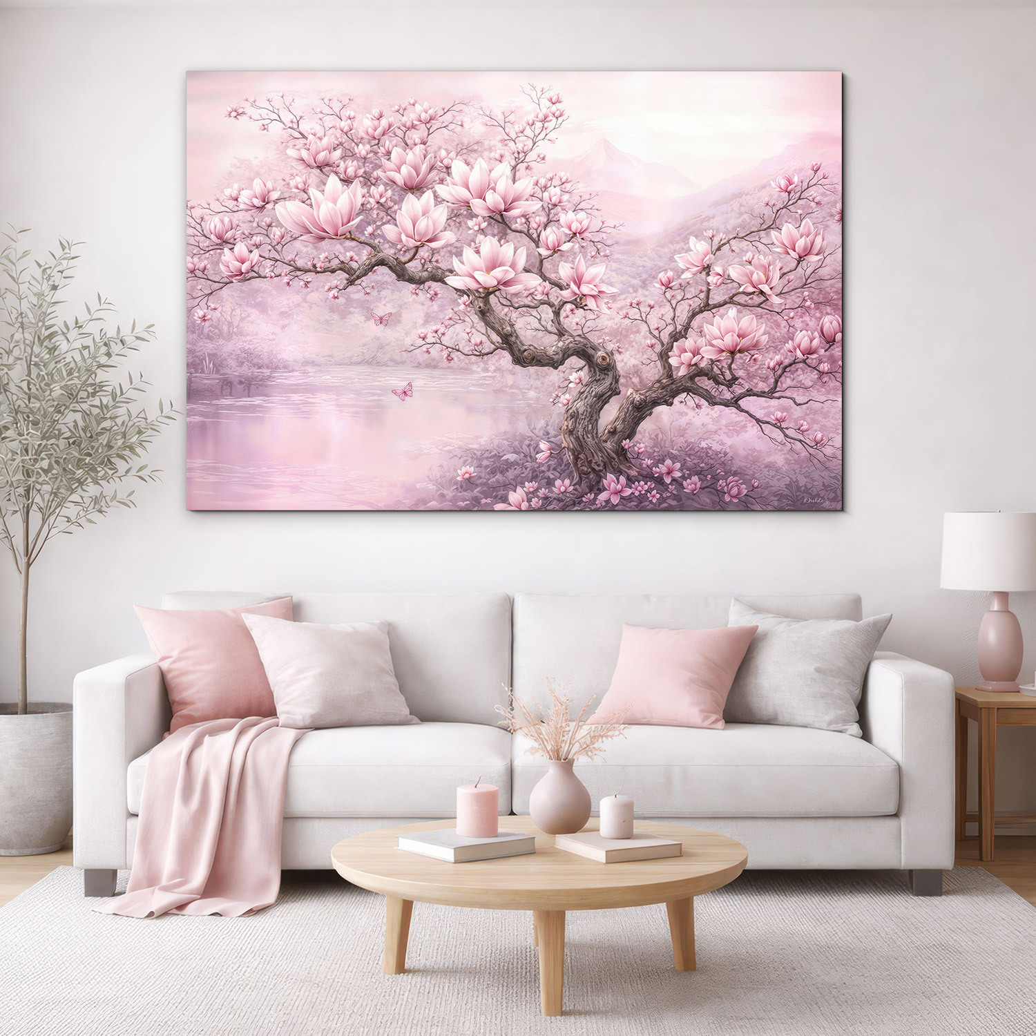 Vneste do svojho domova závan jari, elegancie a jemnosti s ružovým obrazom Magnólia v rozkvete. Drevený obraz zachytáva nádherný strom magnólie, ktorý sa rozvinul do bohatej záplavy ružových kvetov. Celková kompozícia kvetov, pokojného jazera a jemných motýľov pôsobí upokojujúco a do každého interiéru vnáša romantickú atmosféru. Paleta púdrovej ružovej prirodzene zútulňuje priestor a vynikne v obývačke, spálni či dievčenskej izbe.