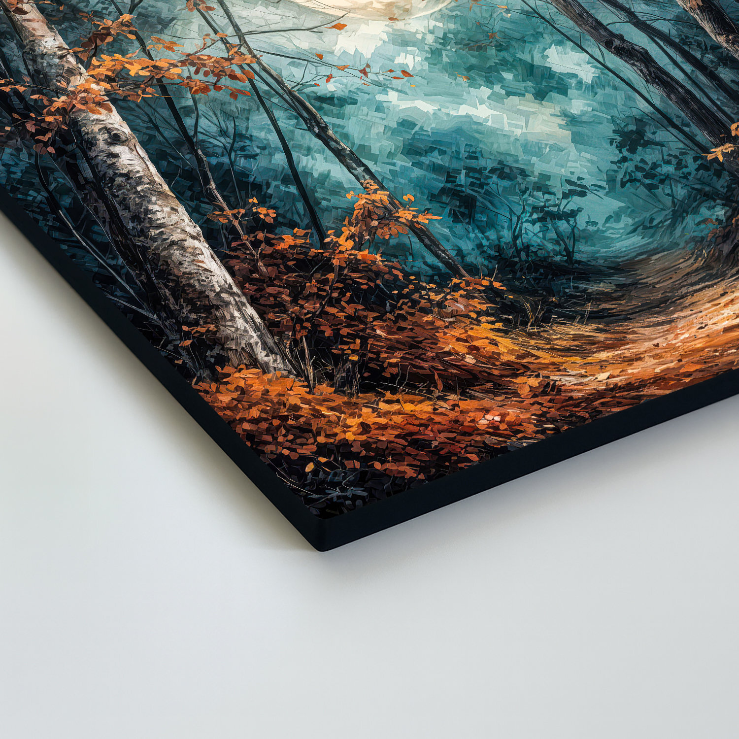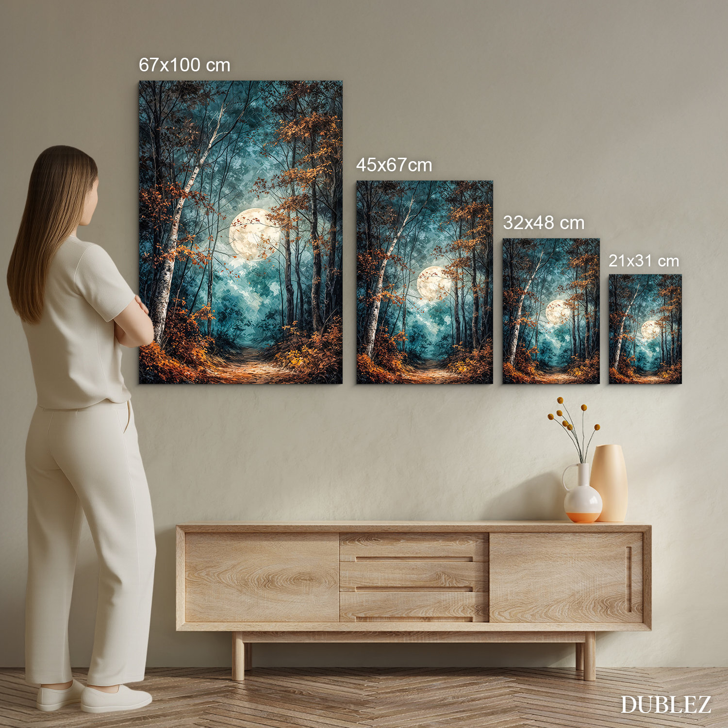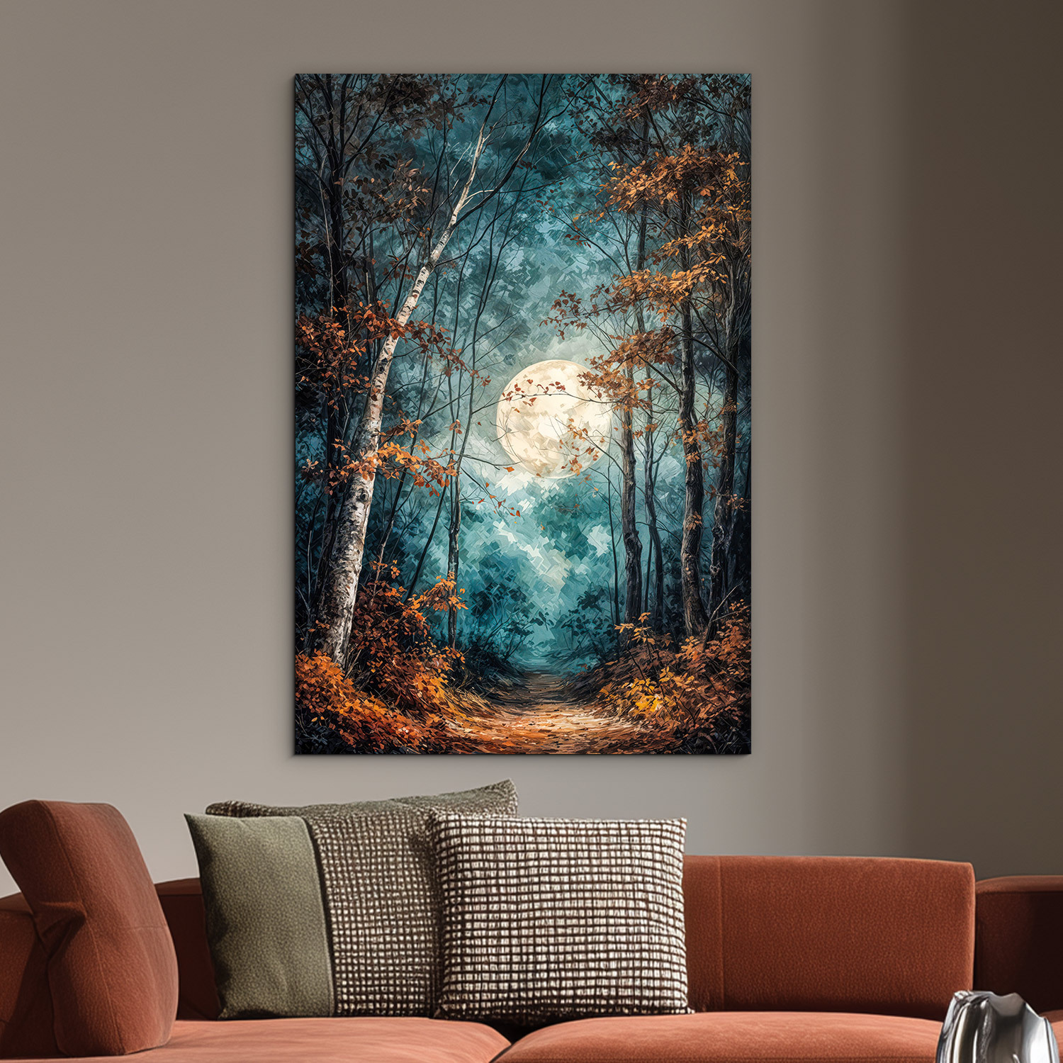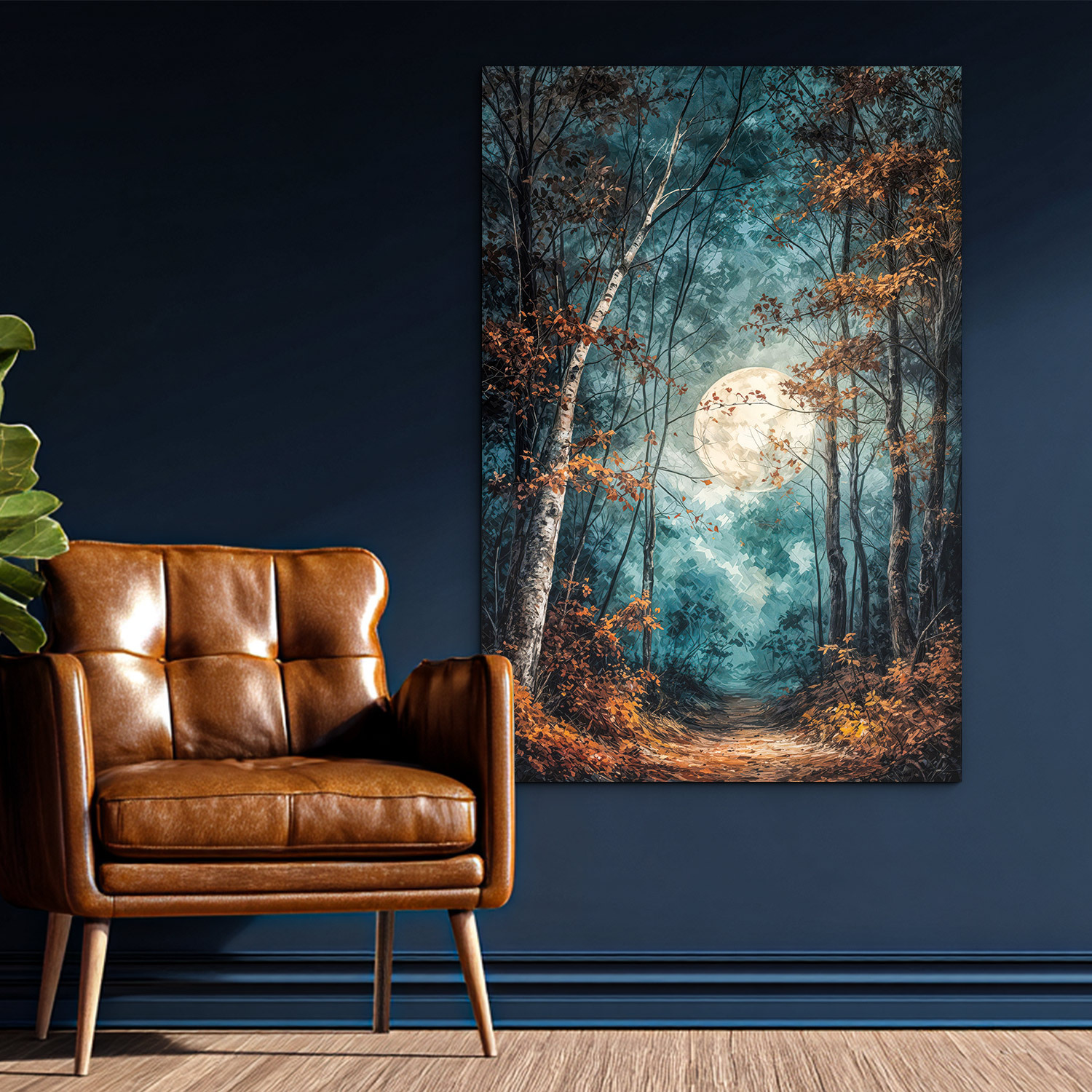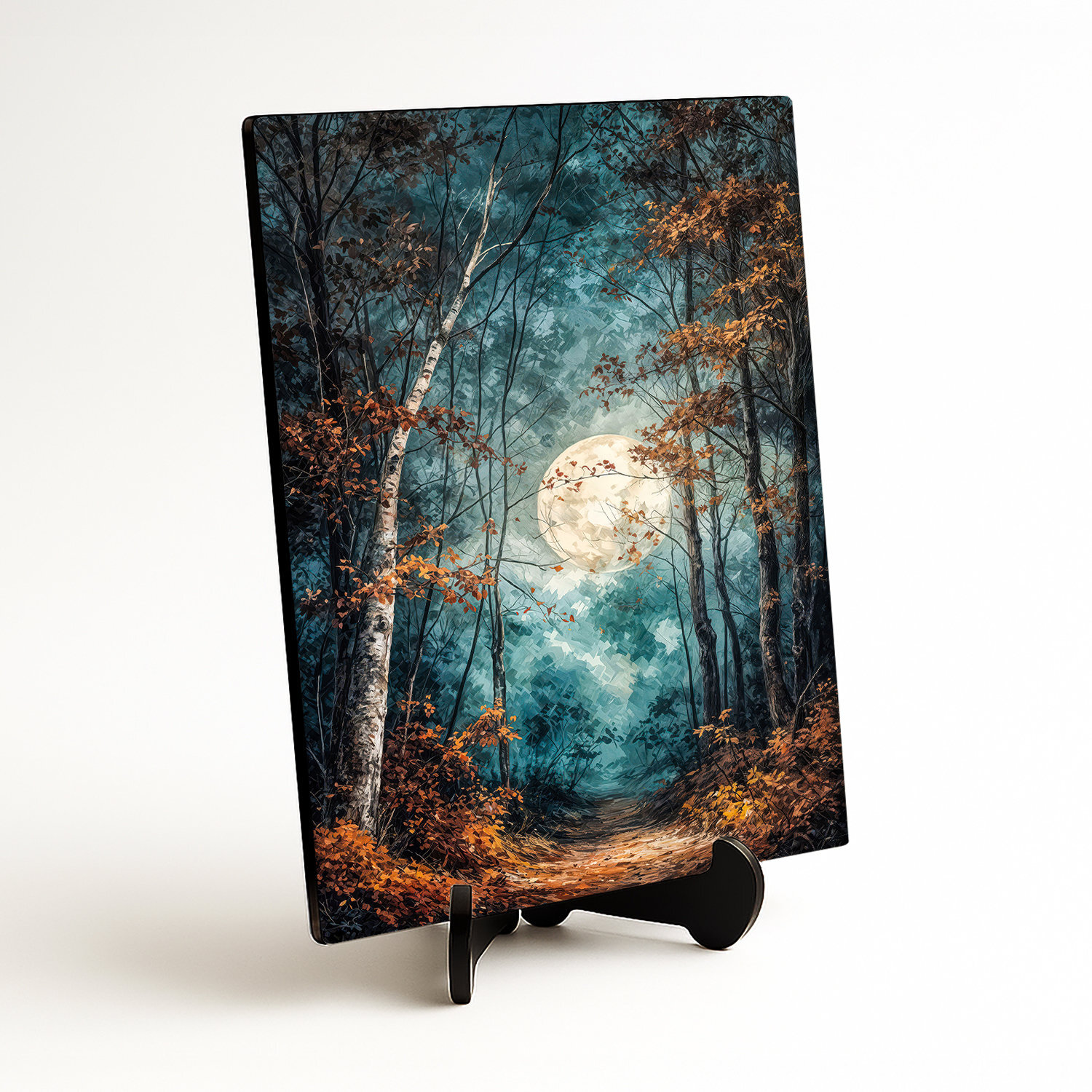 Umelecký obraz mesačného lesa prináša do interiéru tajomnú atmosféru, pokoj a jemnú eleganciu nočnej prírody. Lesná cestička, štíhle stromy, sýte modrozelené farby a žiarivý mesiac krásne vyniknú v obývačke, spálni, pracovni aj v útulnej predsieni. Skvele sa hodí do moderného, prírodného, rustikálneho aj klasického interiéru a zároveň poteší ako originálny darček.
