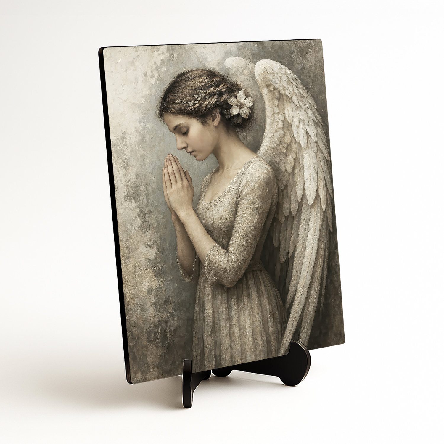 Drevený obraz Anjel v modlitbe vnáša nielen do spálne pokoj a vieru. Obraz anjela so zopnutými rukami a sklopeným pohľadom je vyhotovený v nežných odtieňoch béžovej a sivej farby, ktoré pôsobia jemne a elegantne. Vhodný do každej miestnosti ako symbol ochrany – či už je to spálňa, obývačka alebo detská izba.
