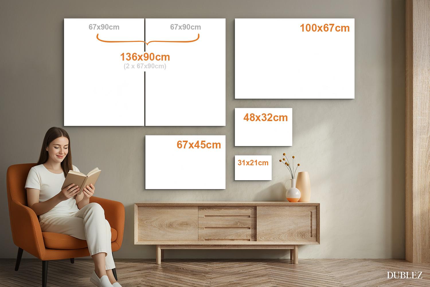 2. 136x90 cm - Obraz je rozdelený na 2 časti (rozmer jednej časti je 67x90 cm - viď galéria produktu). Rozmer 136x90 cm je rozmer po zavesení na stenu s 2 cm medzerou medzi jednotlivými dielmi. Medzery medzi jednotlivými dielmi je možné ľubovoľne nastaviť a tým dosiahnuť aj väčšiu veľkosť.