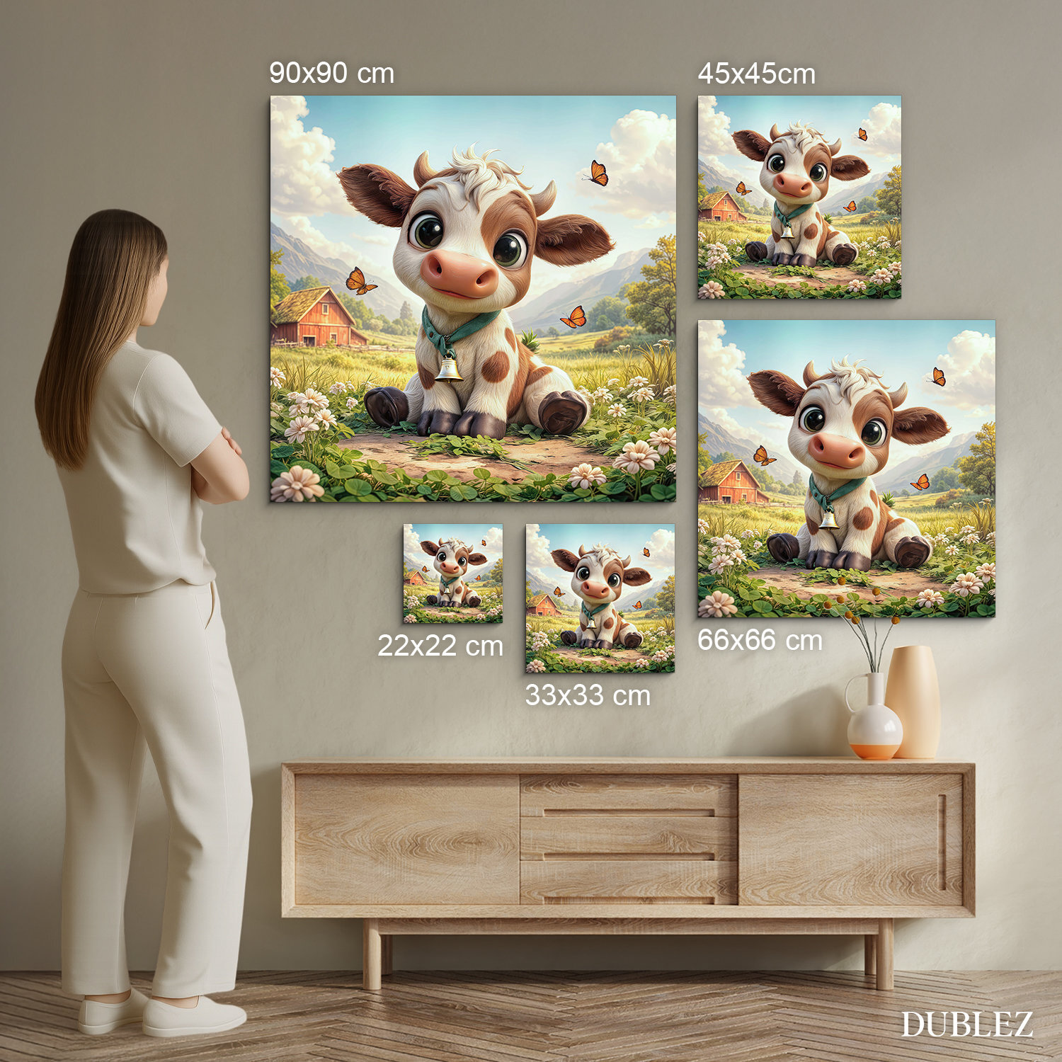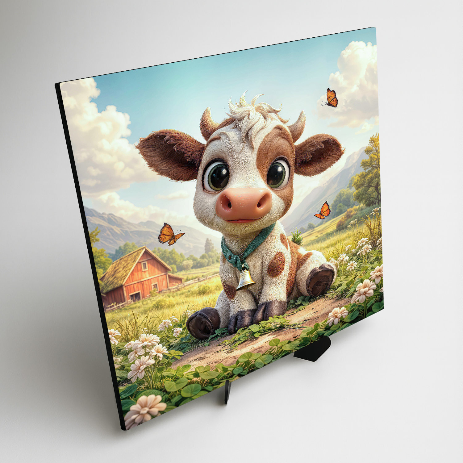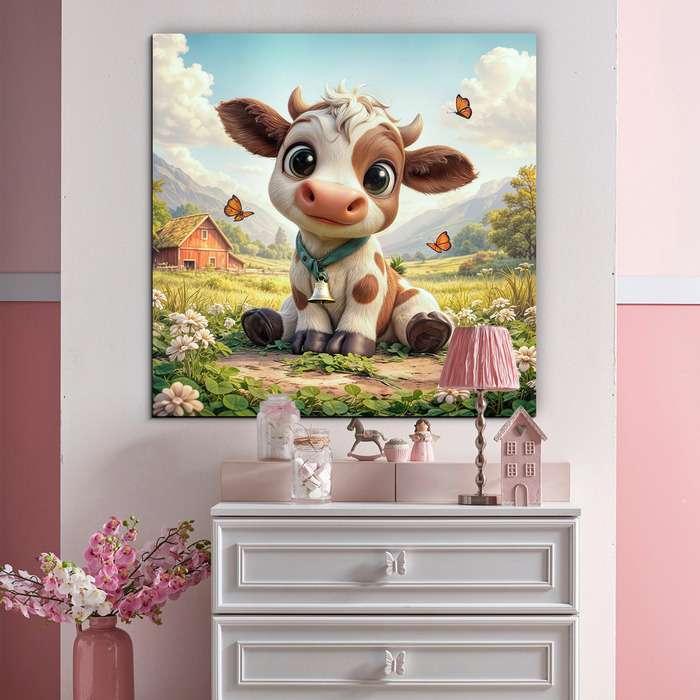Drevený obraz farmárskeho zvieratka – kravičky prinesie do detskej izby kúsok vidieckej prírody. Rozkvitnutá lúka, poletujúce motýle a jemné hnedo-biele tóny teliatka so zvončekom krásne vyniknú v čítacom kútiku alebo nad poličkou s hračkami. Detský obraz podporí fantáziu a cit k prírode. Farebný obraz do detskej izby je originálny darček pre rodičov novorodeniatka.