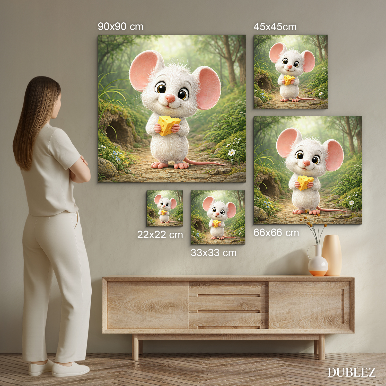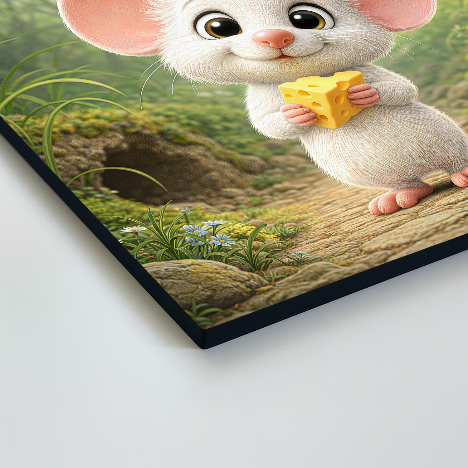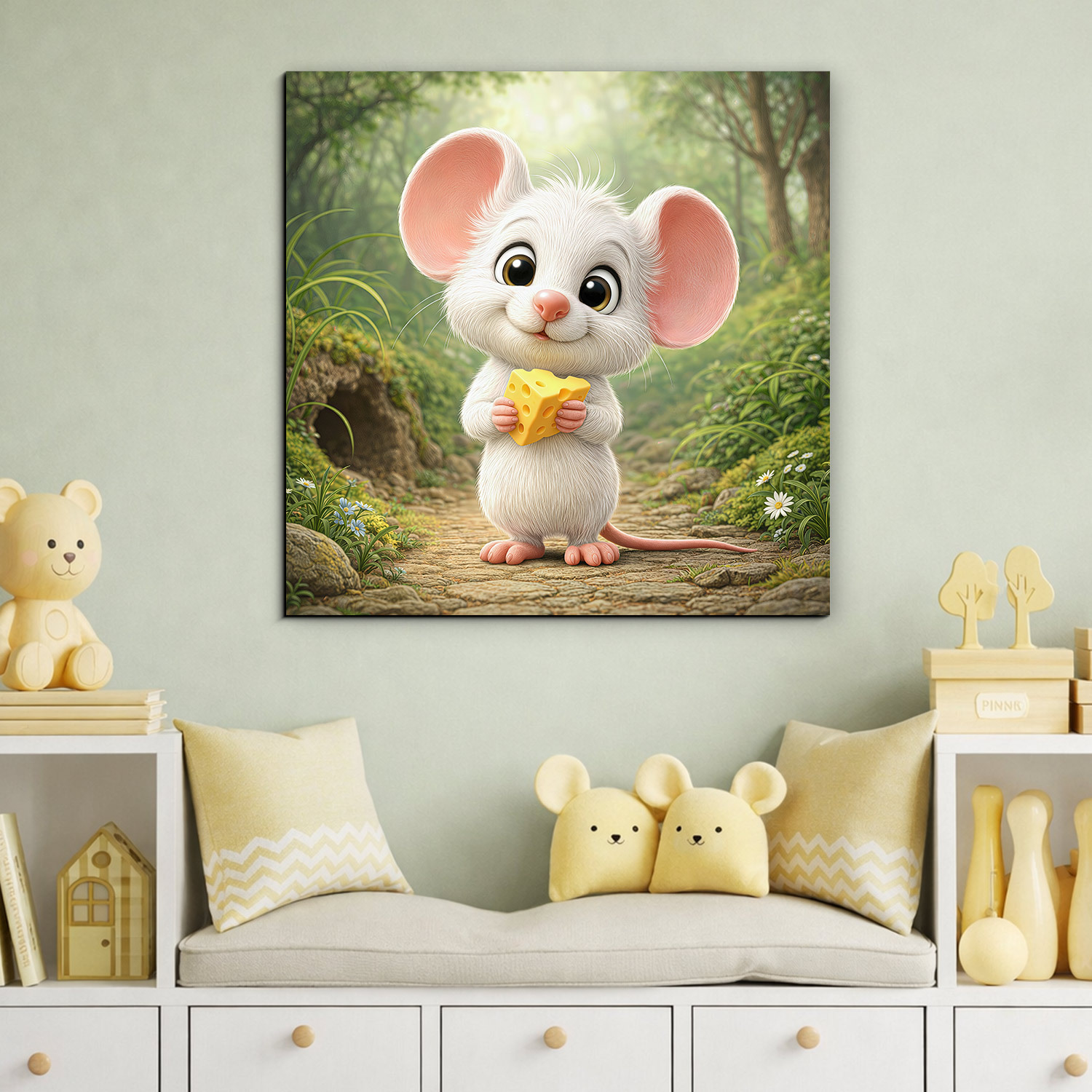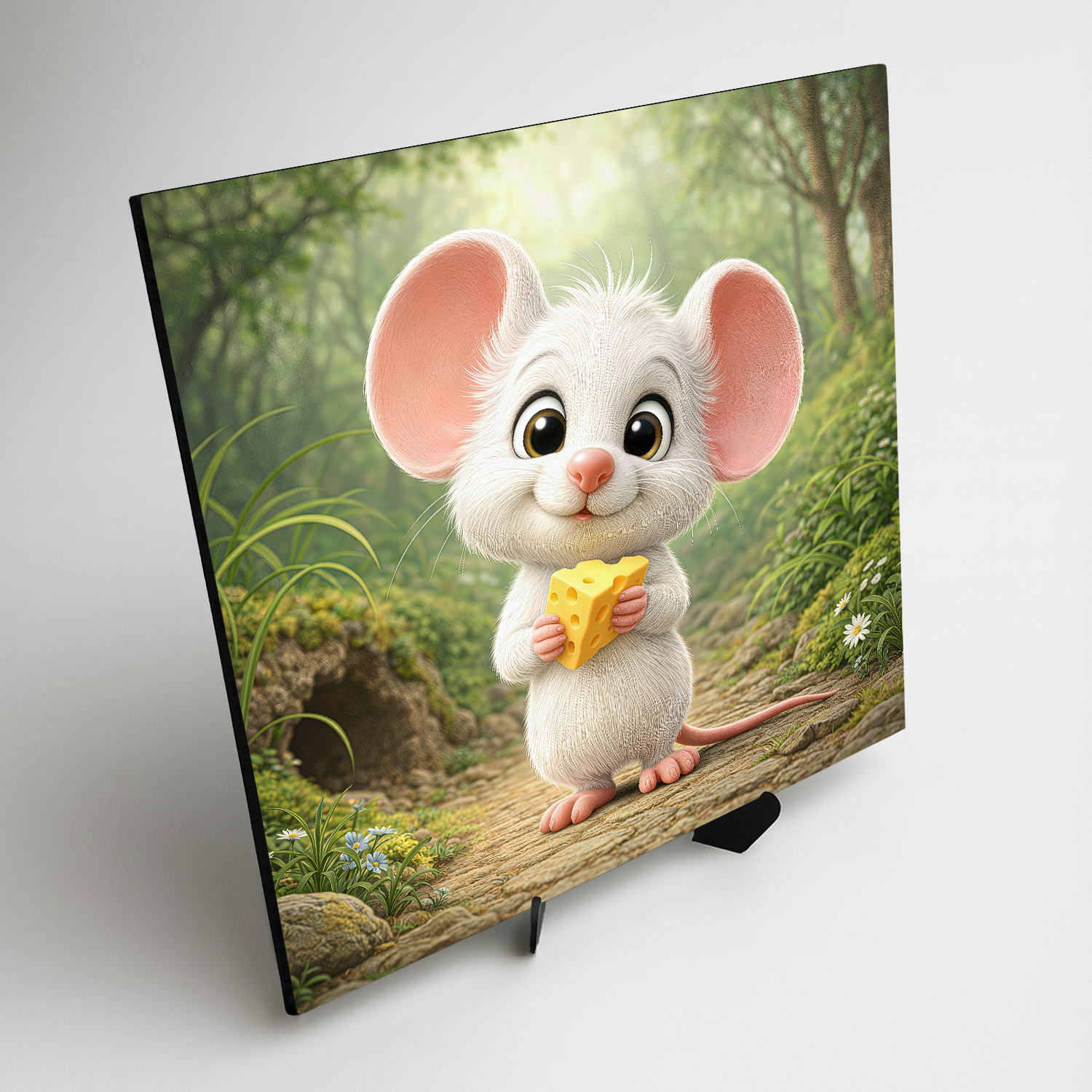 Biela myška s veľkými uškami a kúskom syra v labkách vnesie do každej detskej izbičky okamžitú dávku roztomilosti. Vďaka jemným smotanovým a pastelovým farbám sa drevený obraz výborne hodí do moderných interiérov v minimalistickom alebo škandinávskom štýle. Najlepšie vynikne umiestnený na poličke vedľa obľúbených knižiek alebo nad detskou komodou. Ak hľadáte vkusný darček k prvým narodeninám alebo drobné prekvapenie pre malého nezbedníka, tento kvalitne spracovaný obraz na dreve je voľbou, ktorá spája detskú radosť s trvácnym dizajnom.