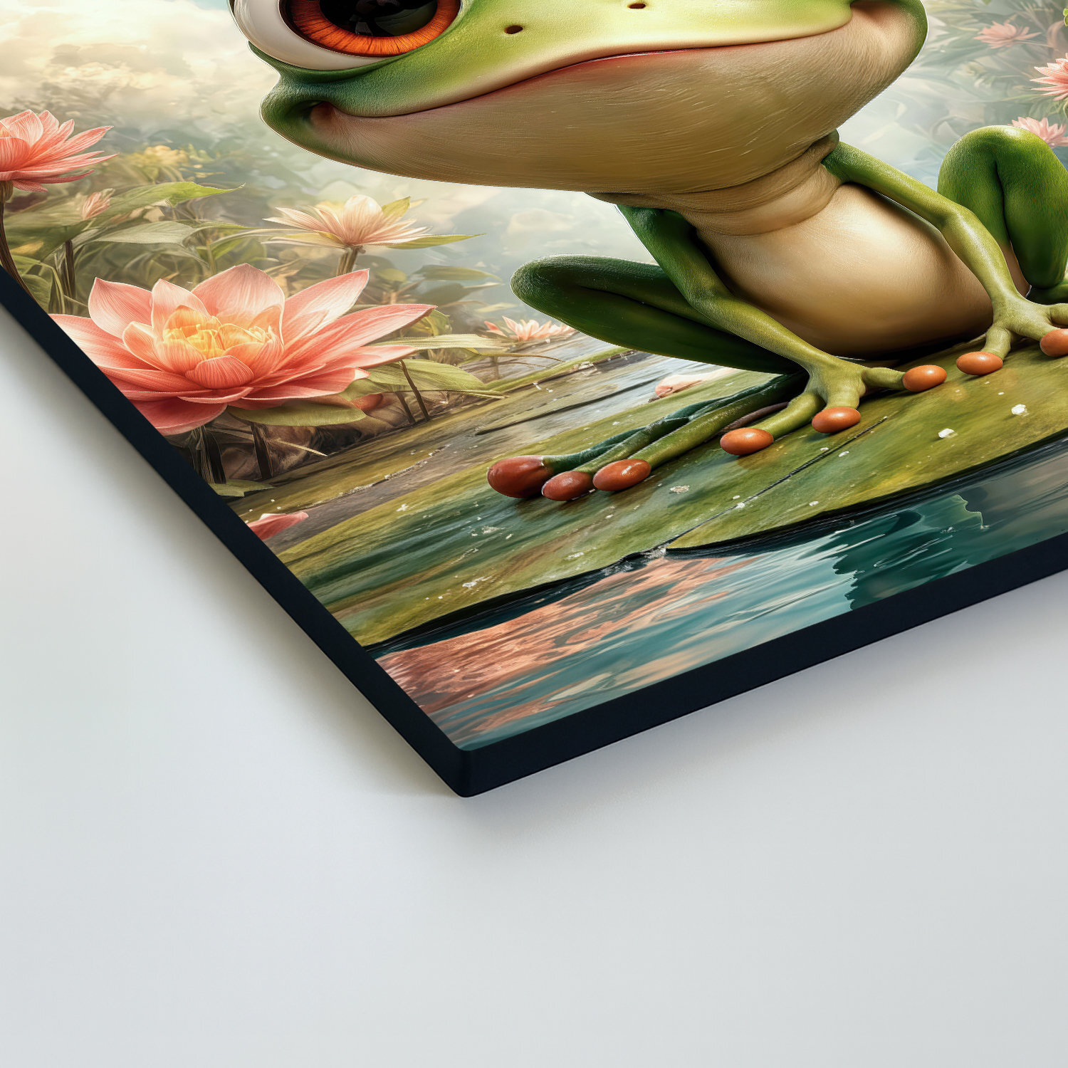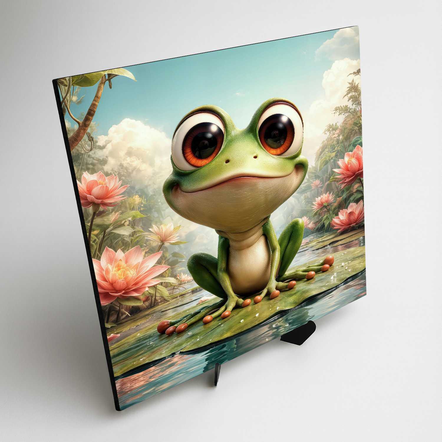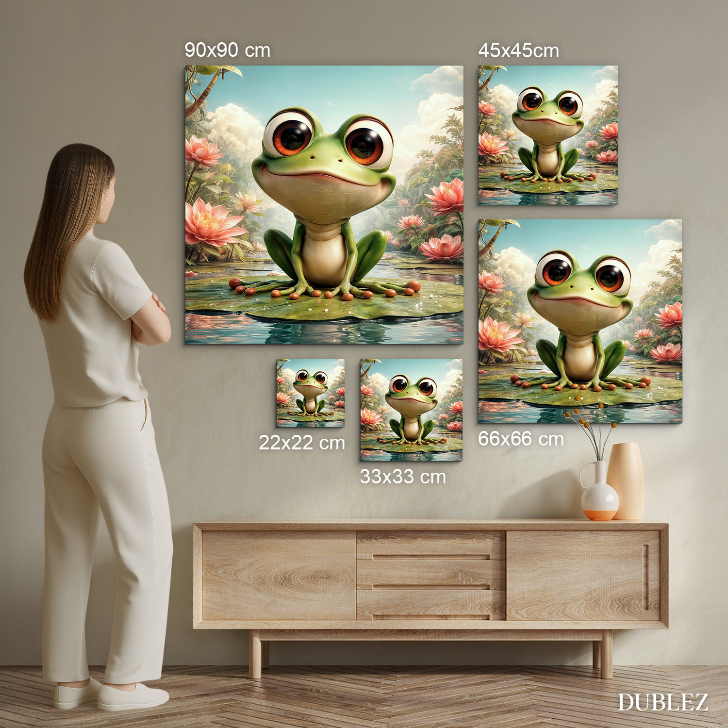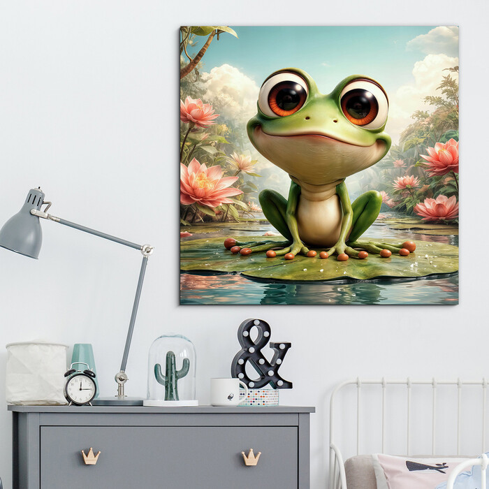 Drevený obraz pre deti so zelenou žabkou prinesie do detskej izby kúsok prírody. Ružové lekná, jemná vodná hladina a svieža zelená farba žabky krásne vyniknú nad postieľkou alebo nad detskou komodou. Detský obraz podporí fantáziu, cit k prírode a radosť z malých detailov. Žabka do detskej izby prináša šťastie, sviežosť a pozitívnu energiu.