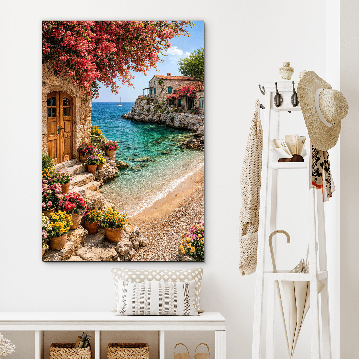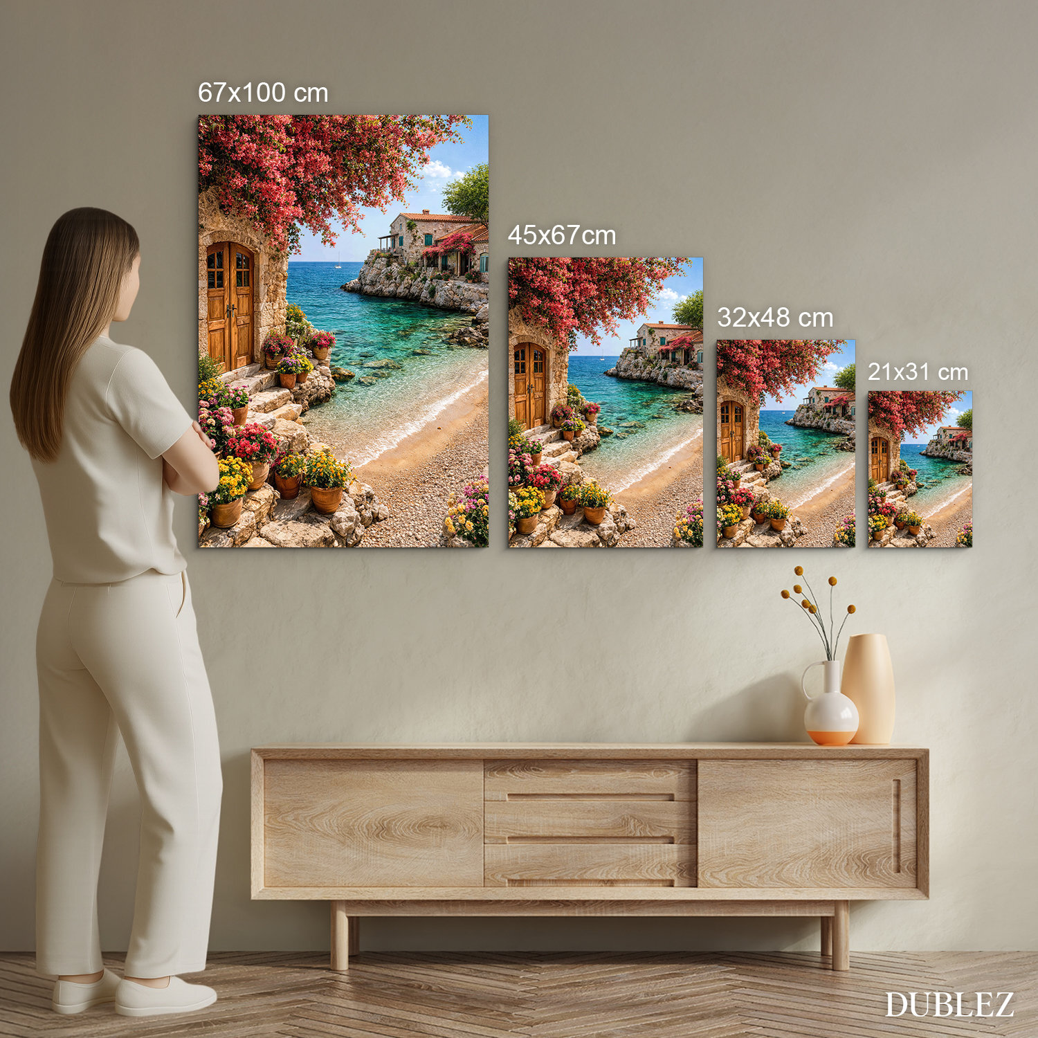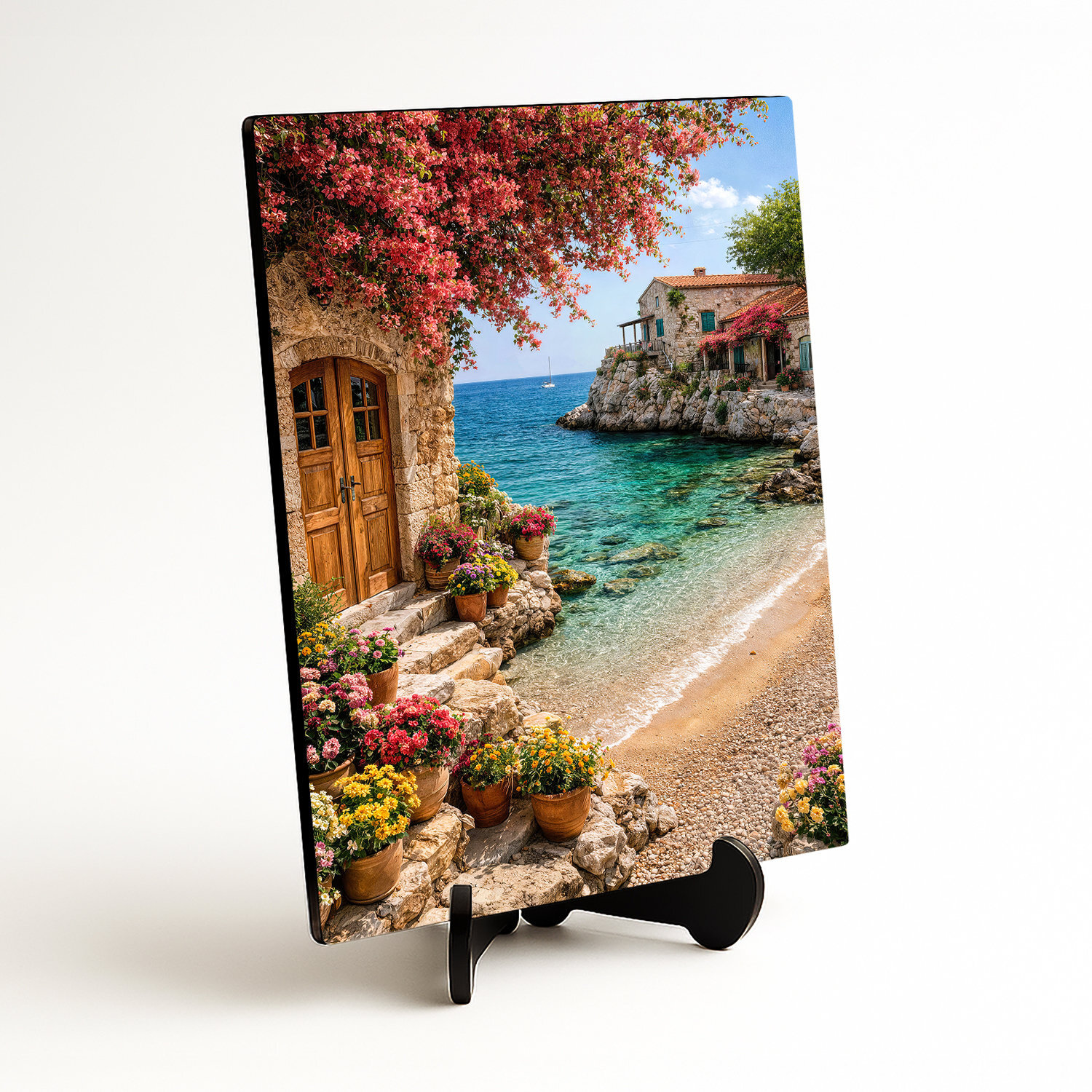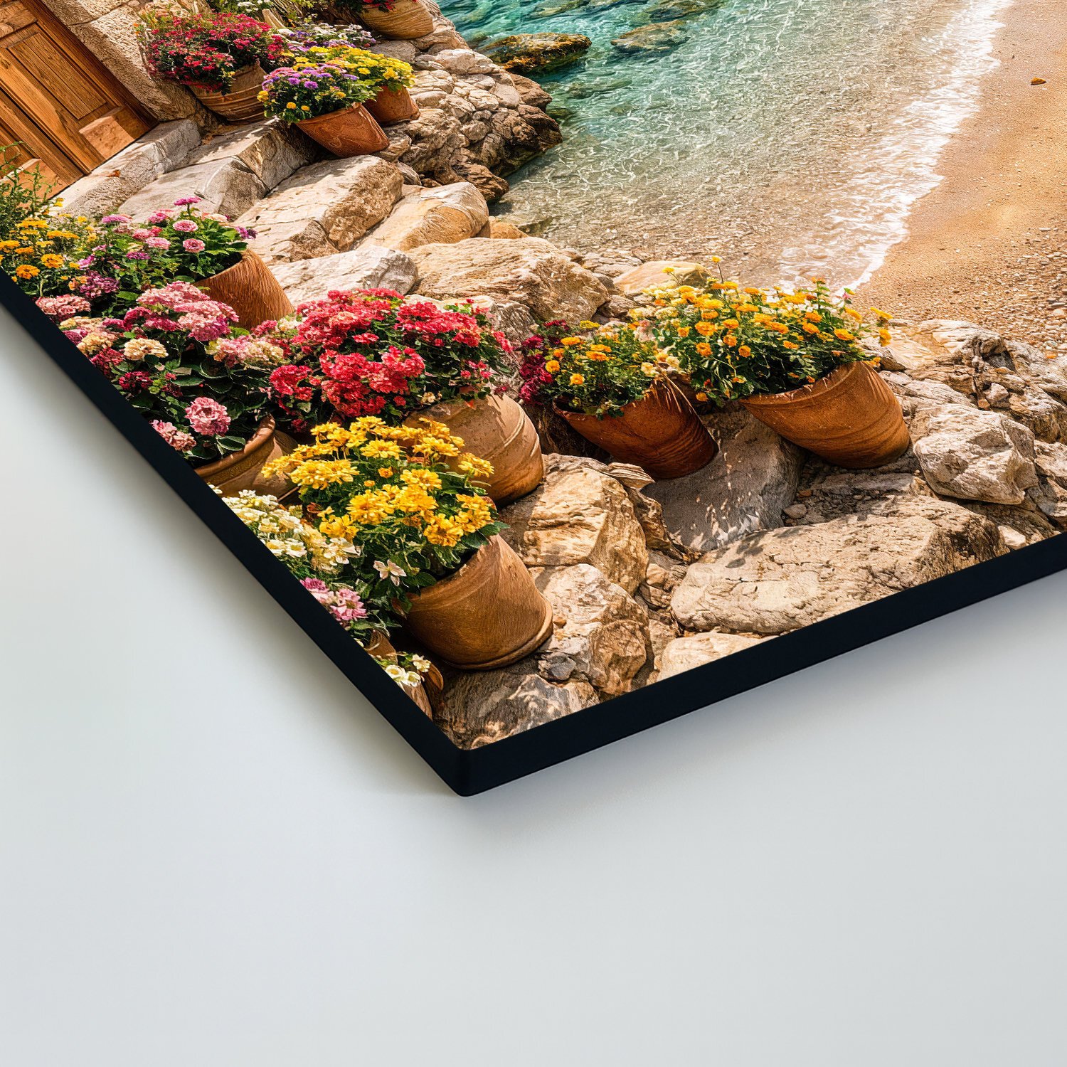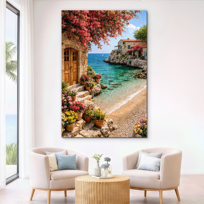 Preneste si kúsok slnečného pobrežia priamo k sebe domov. Drevený obraz zachytáva romantickú scenériu s kamenným domčekom, rozkvitnutými kvetmi a azúrovým morom. Pohľad na tichú pláž a nekonečný horizont vnáša do miestnosti okamžitý pocit pokoja a letnej pohody. Vďaka precíznej UV tlači na dreve sú farby jasné a sýte, pričom v modernom interiéri pôsobí veľmi útulne.