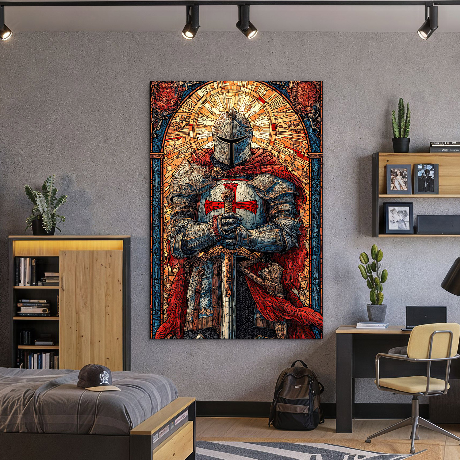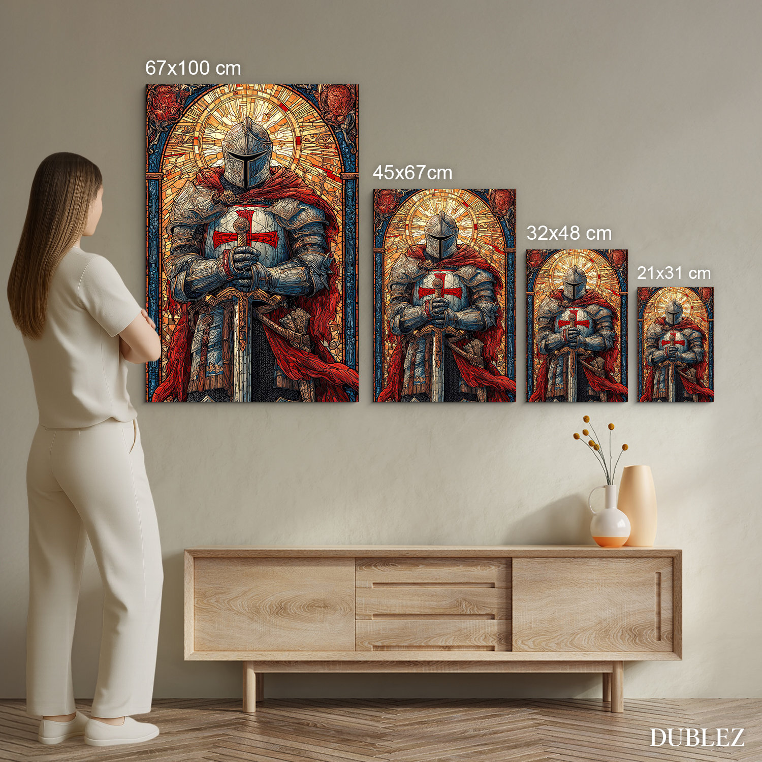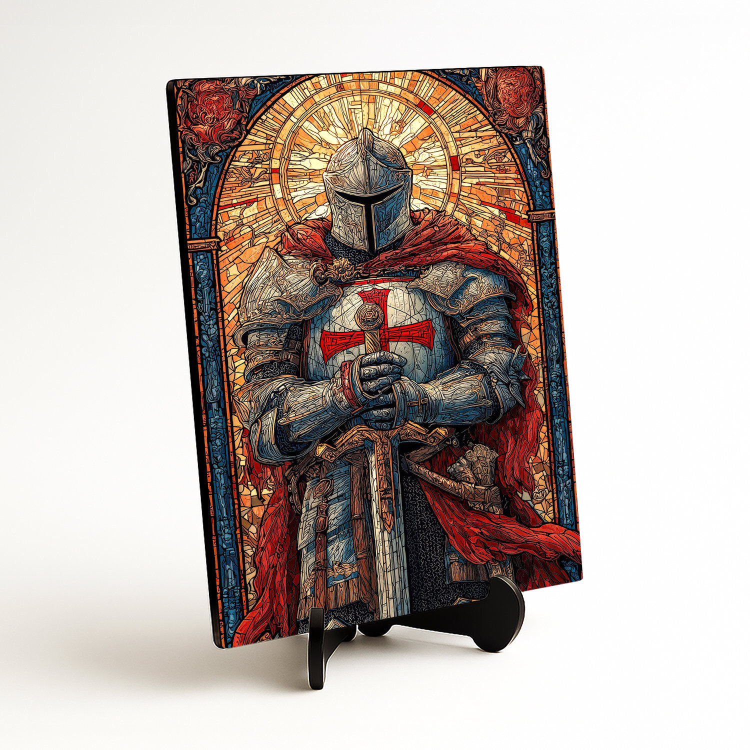 Drevený obraz rytiera v plnej zbroji s červeným krížom je spracovaný v štýle vitráže. Precízna UV tlač pôsobí ako mozaika sklenených črepov a v kombinácii so žiarivým slnečným pozadím vytvára efekt svetla presvitajúceho cez katedrálne okná. Obraz rytiera je perfektným darčekom pre mužov, ktorí oceňujú históriu a silnú symboliku.