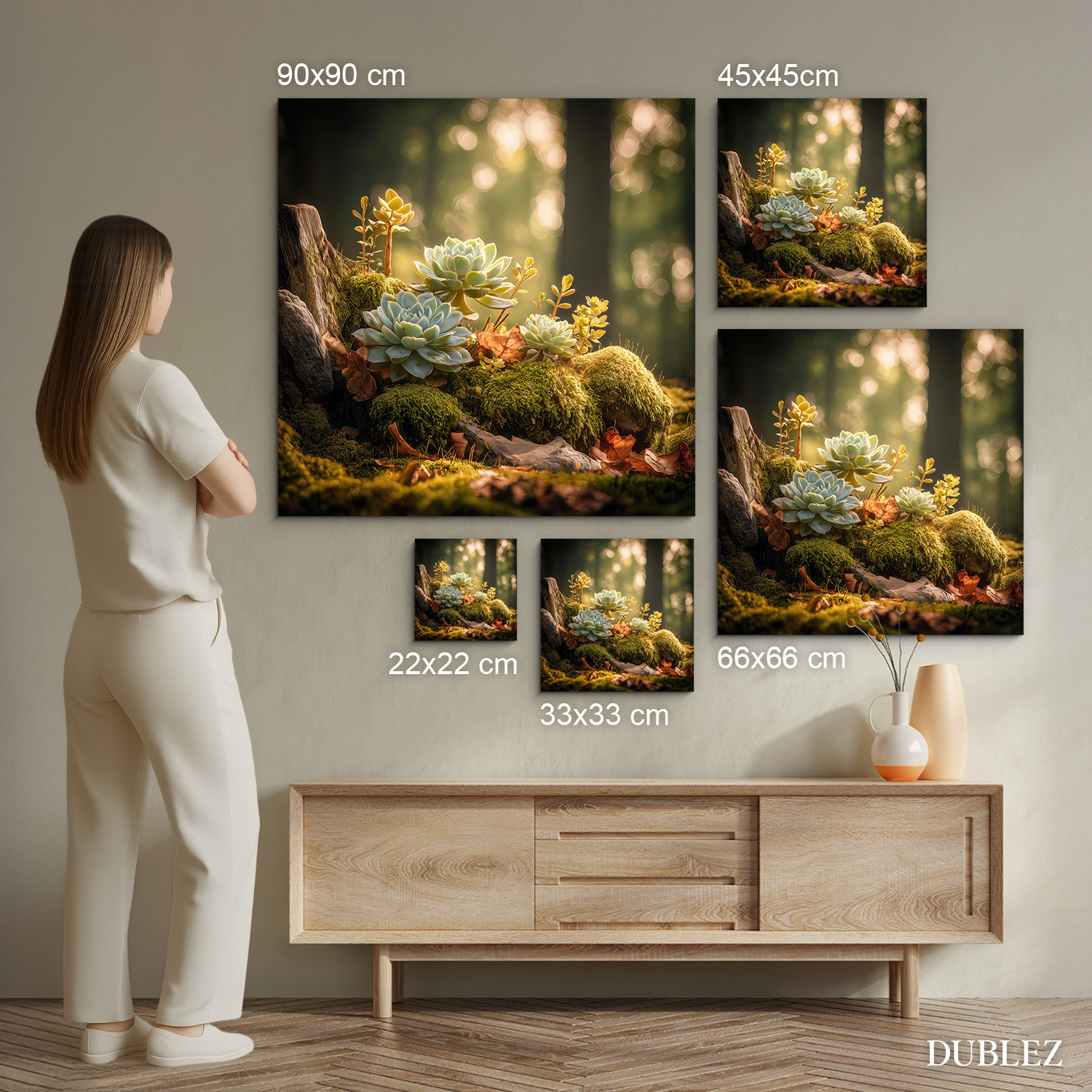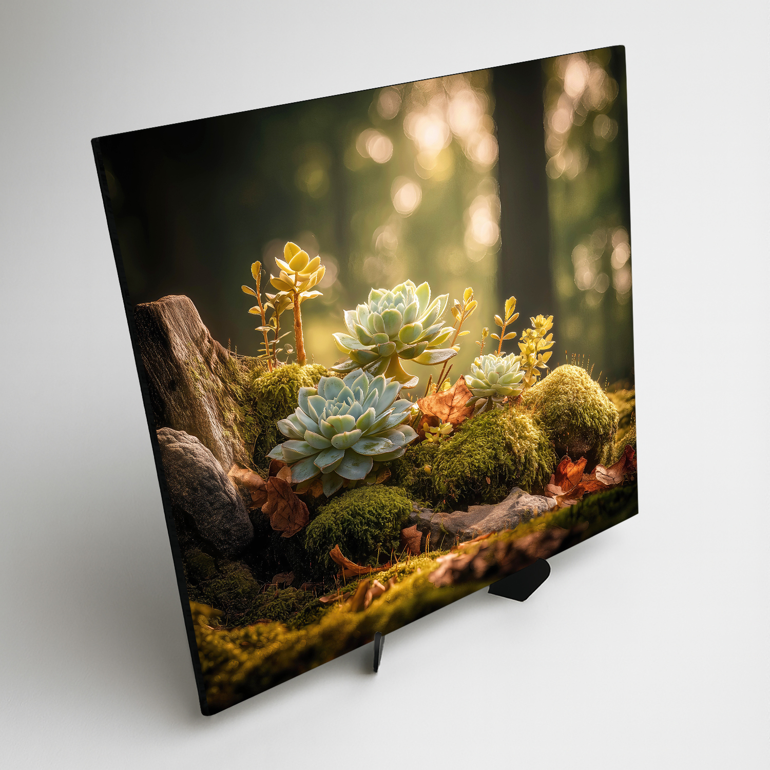 Farebný obraz so sukulentmi a machom prináša do interiéru sviežosť prírody bez toho, aby ste sa museli starať o reálne rastliny. Jemné lúče svetla prenikajúce lesom, realisticky spracované skalničky a mäkký mach vytvárajú atmosféru pokoja. Drevený obraz je riešením pre každého, kto túži po dotyku prírody v byte. V obývačke, spálni či kancelárii navodí harmóniu a pocit spojenia s lesom.