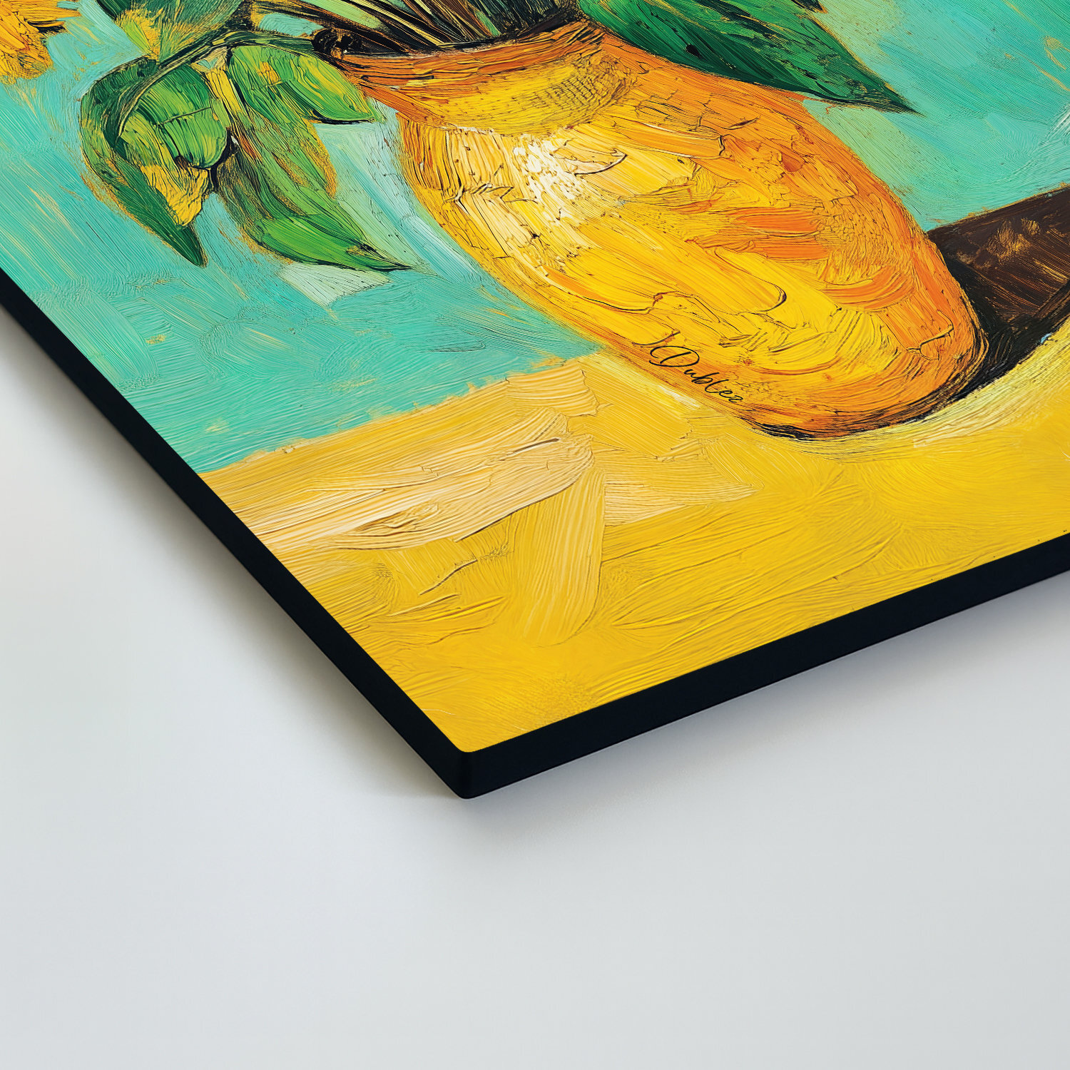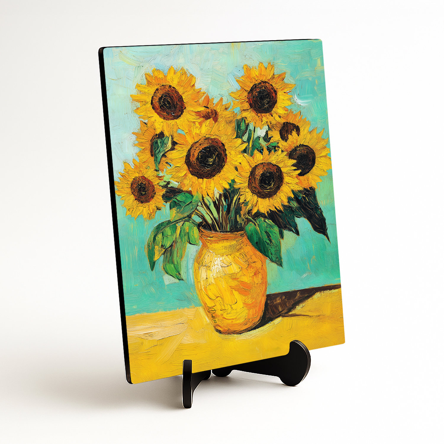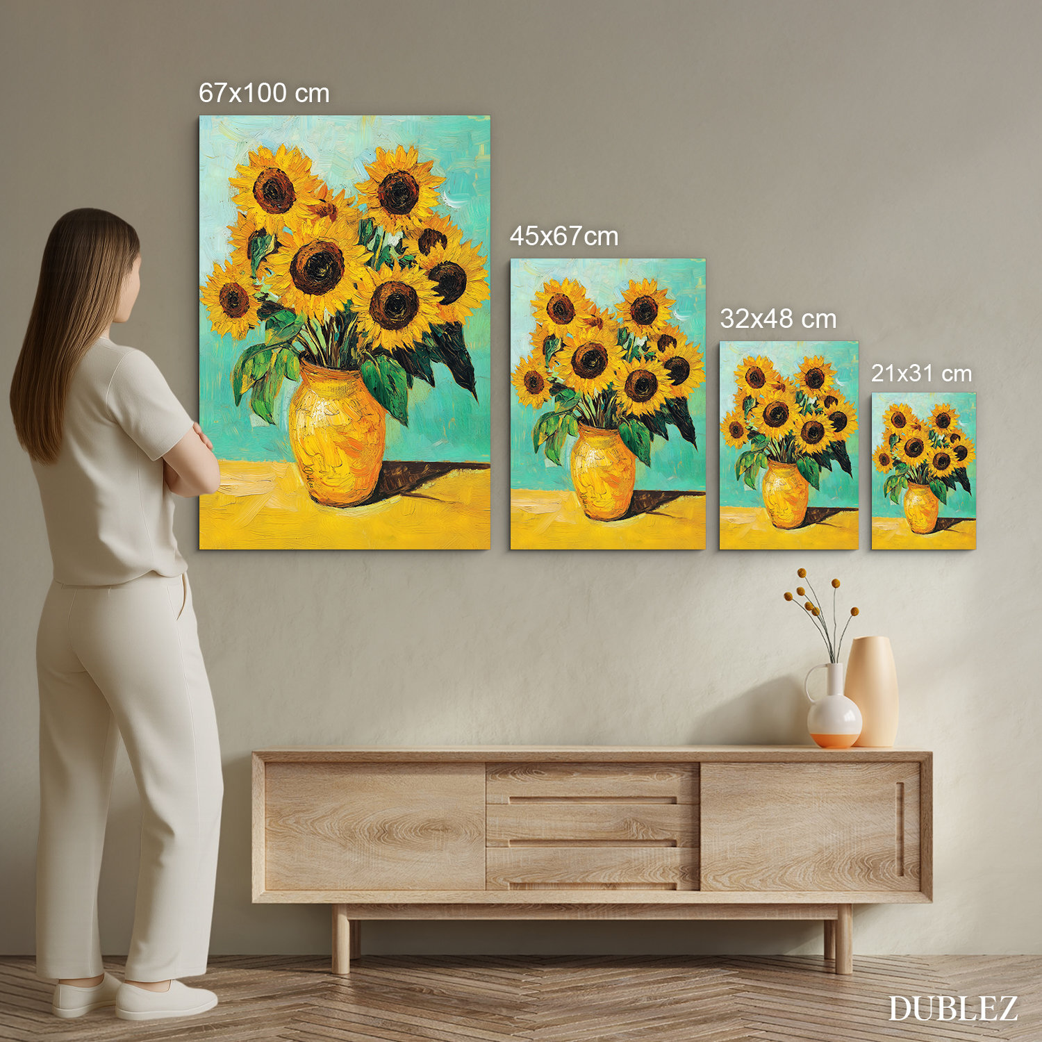 Nádherný drevený obraz slnečníc je skvelým bytovým doplnkom, ktorý vnesie do vášho domova nielen krásne farby, ale aj pozitívnu energiu. Žiarivo žlté kvety slnečníc sú v kontraste so svetlým tyrkysovým pozadím, takže obraz okamžite oživí každý interiér. Obraz slnečnice odporúčame umiestniť do kuchyne, jedálne alebo na miesta, kde trávite čas s rodinou.
