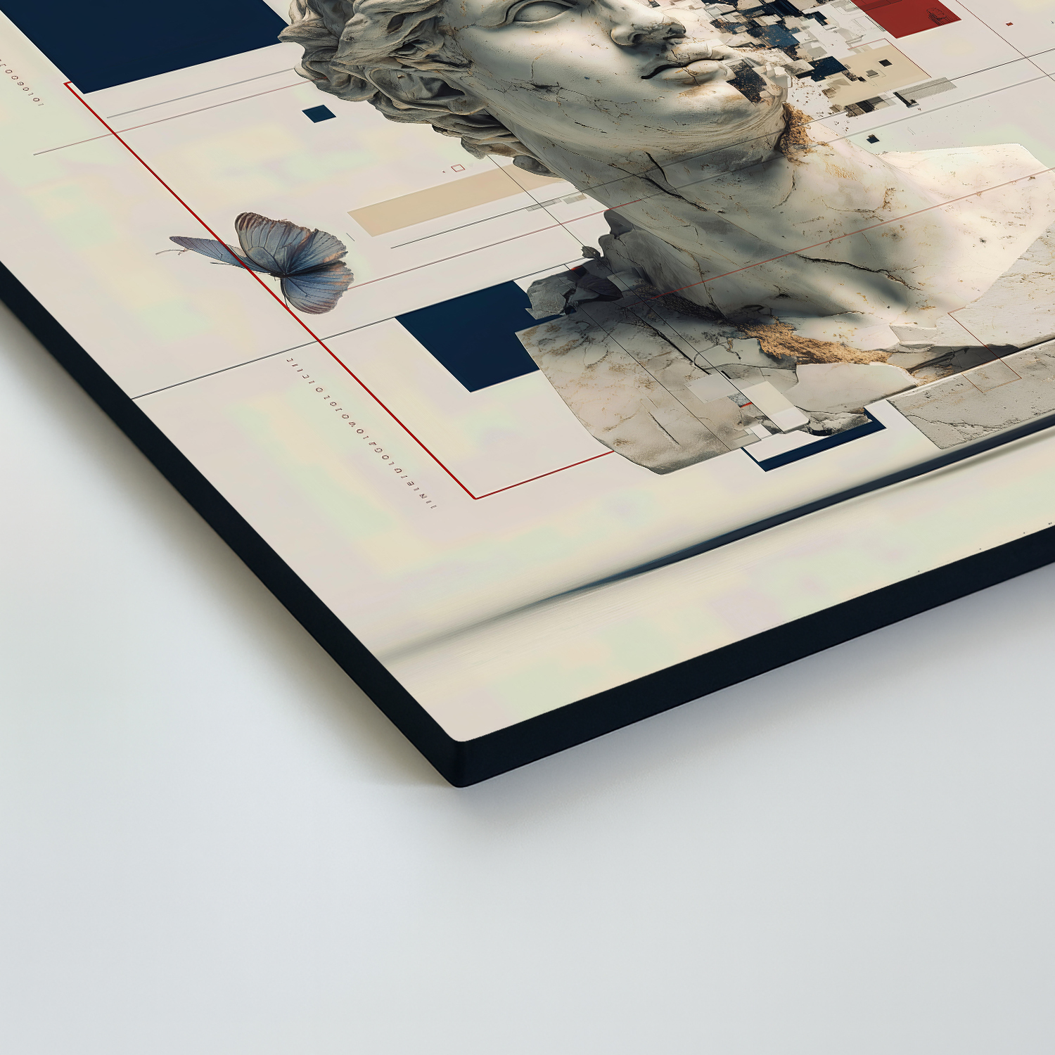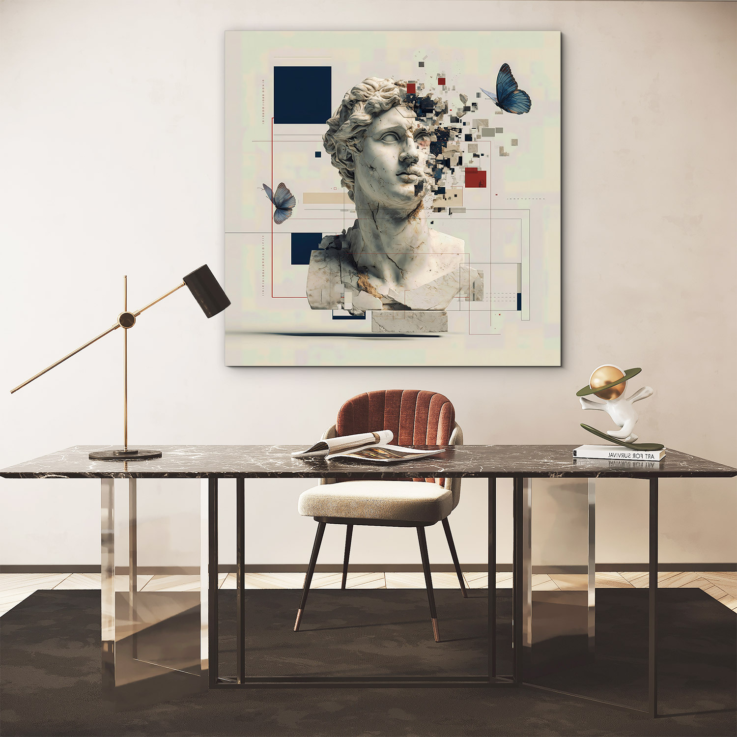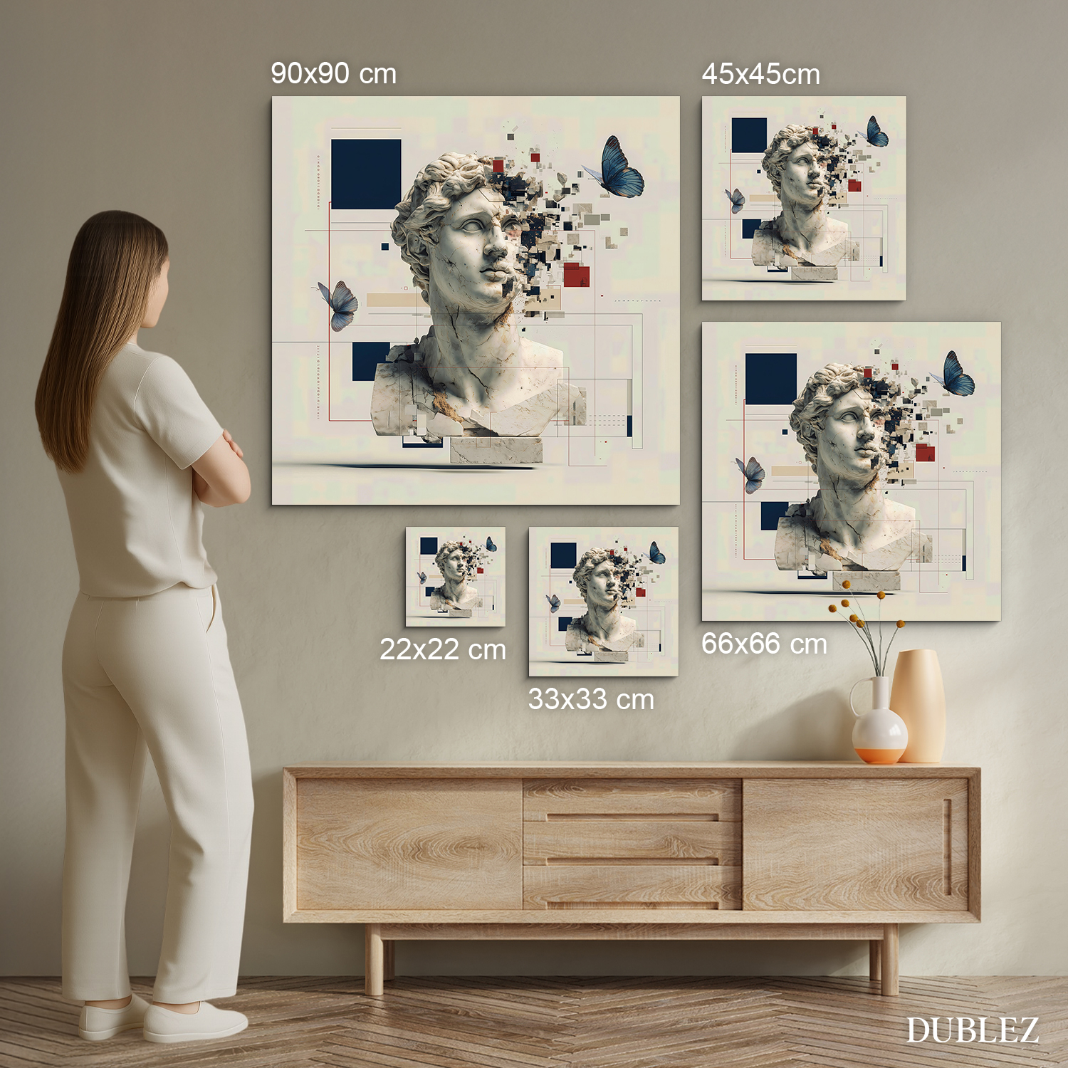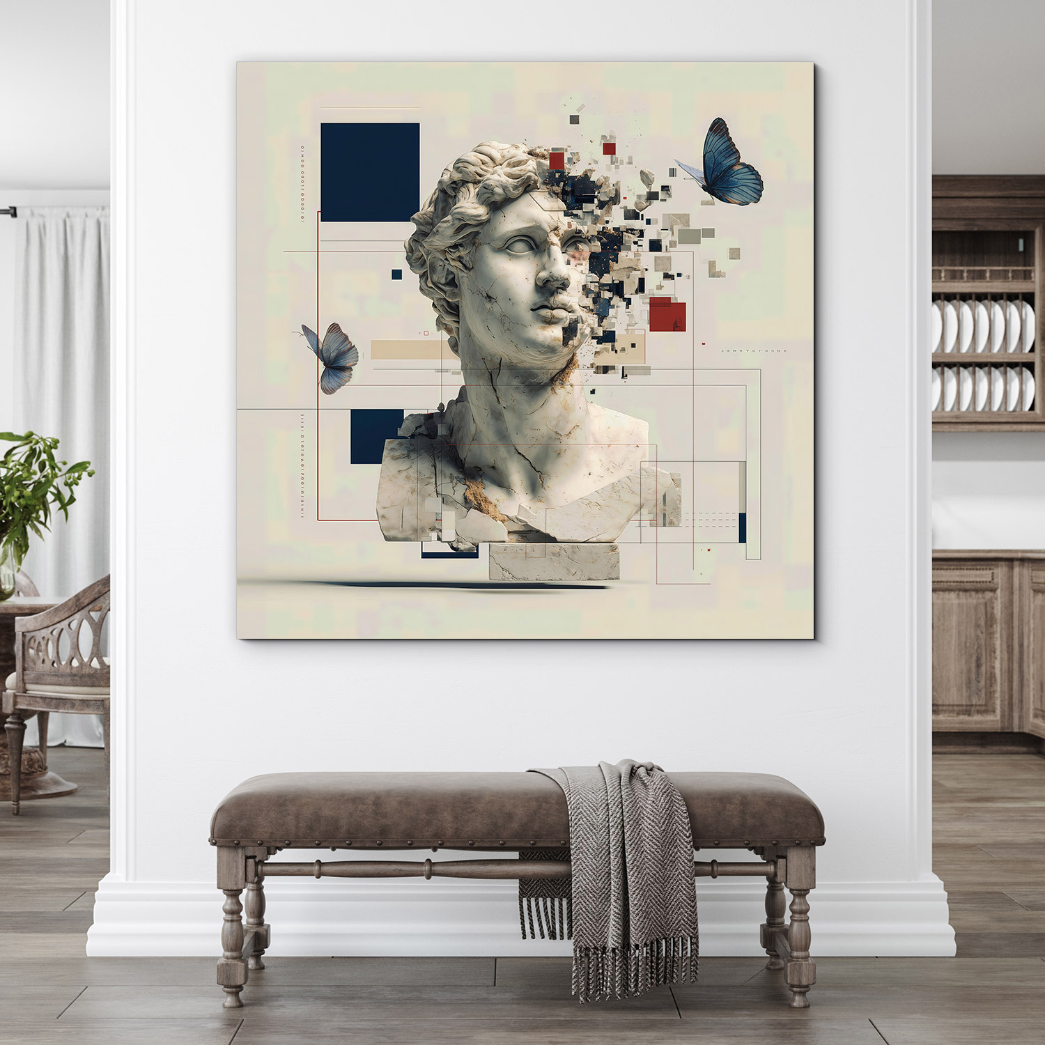 Význam obrazu: Antická busta predstavuje nadčasovú krásu a múdrosť starovekého umenia. Rozpad na pixely symbolizuje prechod do digitálneho sveta, zatiaľ čo motýle nesú posolstvo slobody, transformácie a nových začiatkov.