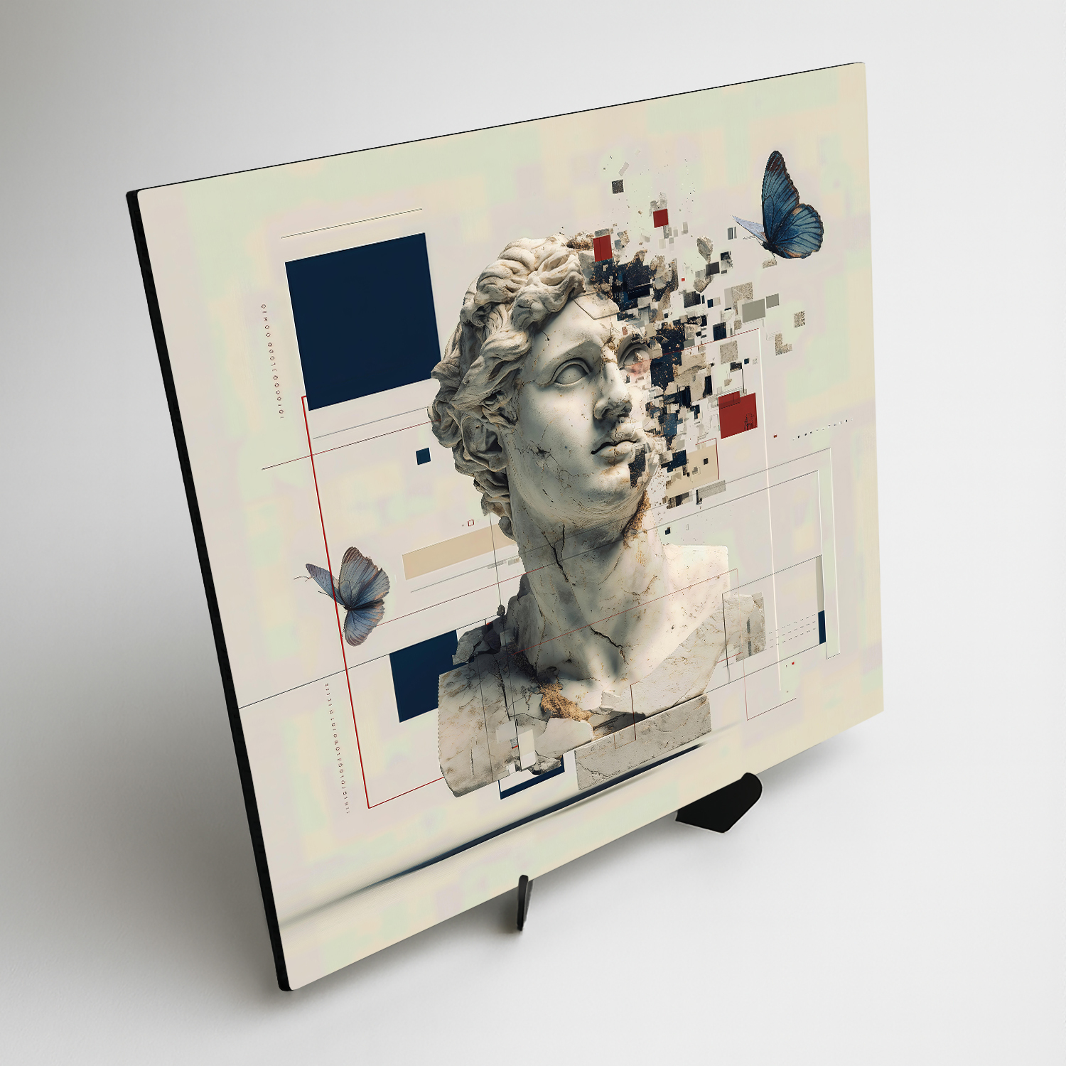 Moderný obraz antickej busty s digitálnym efektom je unikátna dekorácia, ktorá spája históriu so súčasnosťou. Realistické zobrazenie klasickej sochy rozpadajúcej sa na drobné pixely. Jemné motýle vytvárajú toto originálne umelecké dielo, ktoré okamžite upúta pozornosť. Drevený obraz je ideálnym riešením pre tých, ktorí chcú svoj domov či kanceláriu obohatiť o netradičný doplnok. Vynikne v obývačke, kancelárii alebo modernom štúdiu, kde podčiarkne kreativitu a zmysel pre detail.