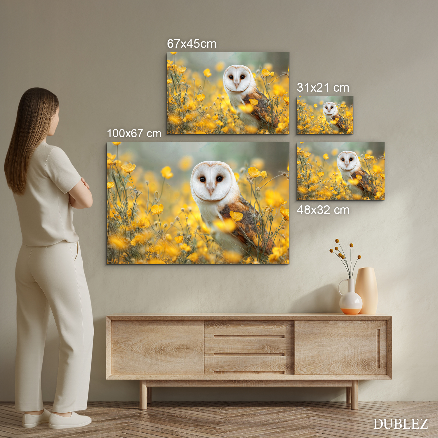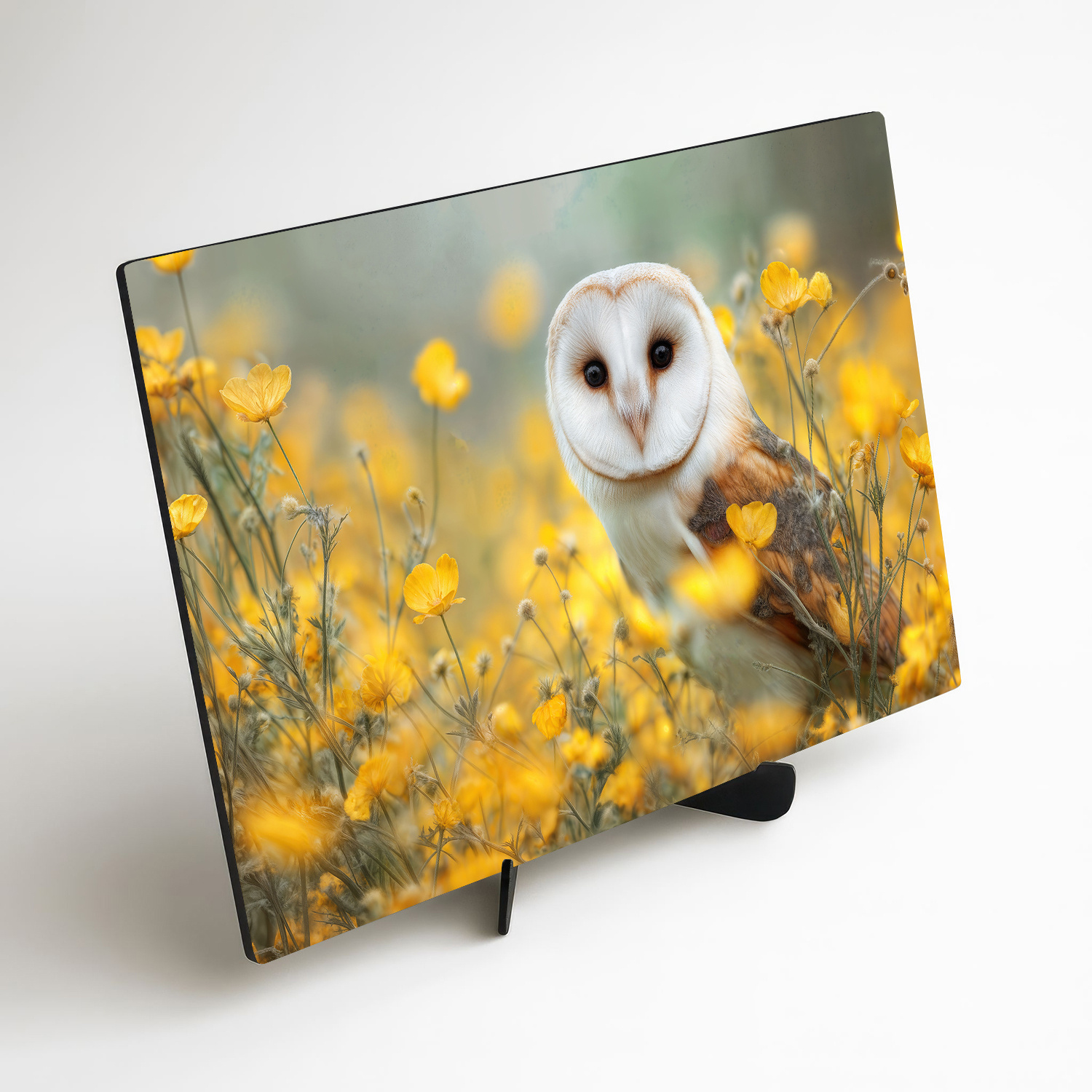 Drevený obraz – Sova v lúke plnej zlatistých kvetov spája to najkrajšie z prírody – tajomnú eleganciu sovy plamienky a rozkvitnuté pole žltých kvetov zaliate svetlom. Obraz pôsobí teplo, harmonicky a okamžite rozžiari spálňu, obývačku alebo chodbu. Skvelo zapadne do vidieckeho, prírodne ladeného či rustikálneho interiéru, kde prinesie pocit pokoja, svetla a tichej krásy.
