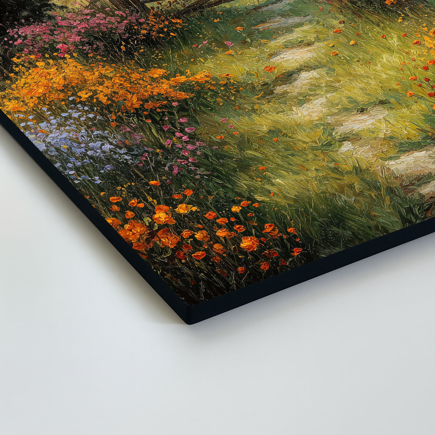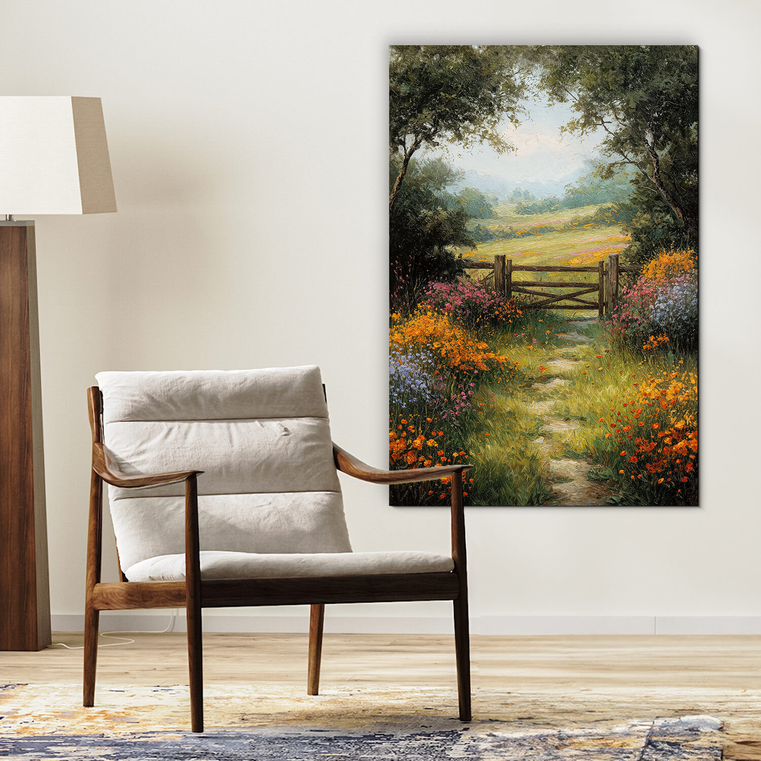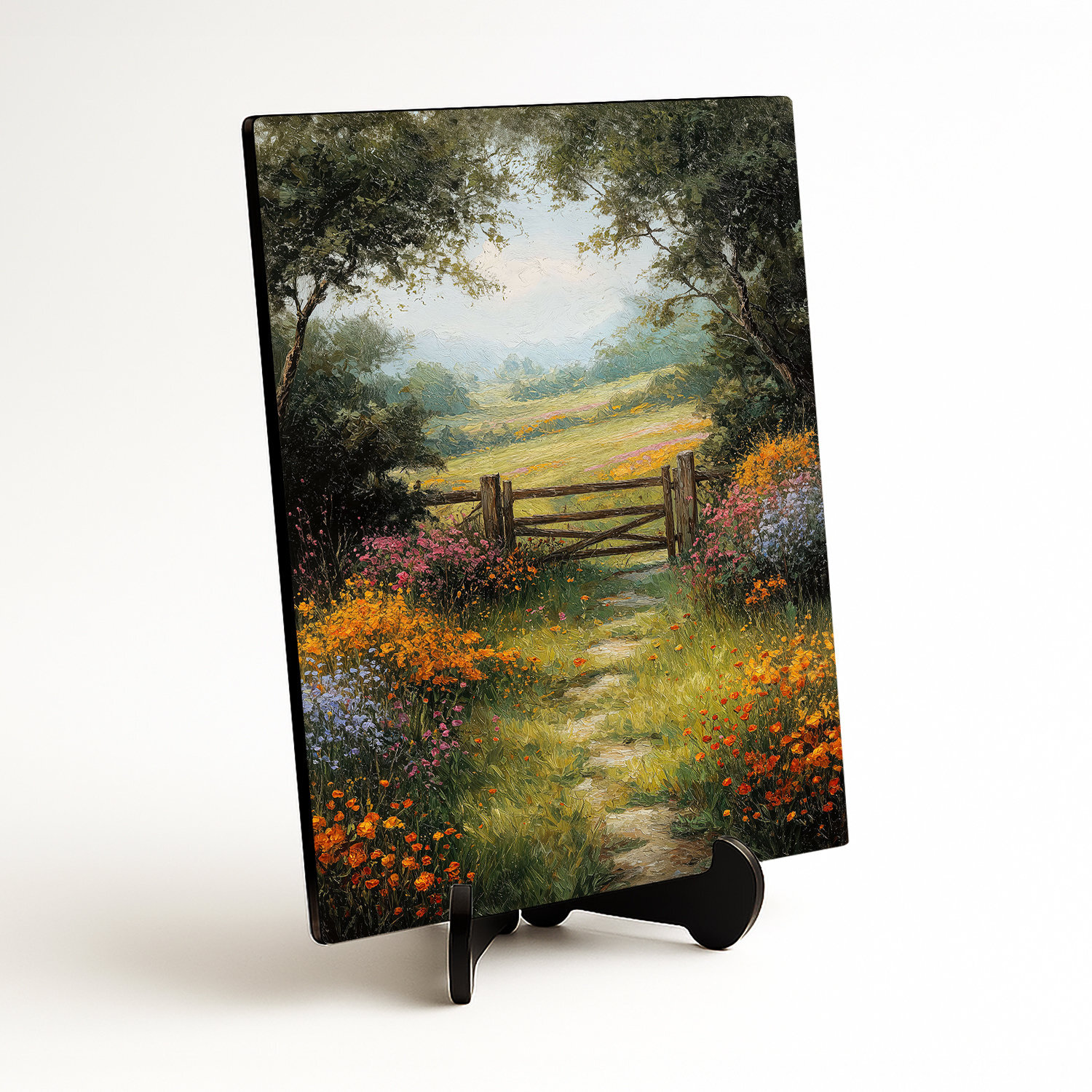 Romantický obraz Lúčna cesta je spojením tradičného vidieckeho štýlu, nekonečnej krásy prírody a olejomaľby. Pohľad na rozkvitnutú lúku, ktorá sa tiahne k starej drevenej bránke, vyniká upokojujúcou kombináciou farieb. Drevený obraz je ideálny doplnok do kuchýň v štýle Provence, útulných spální alebo obývačiek, kde hľadáte únik z mestského zhonu