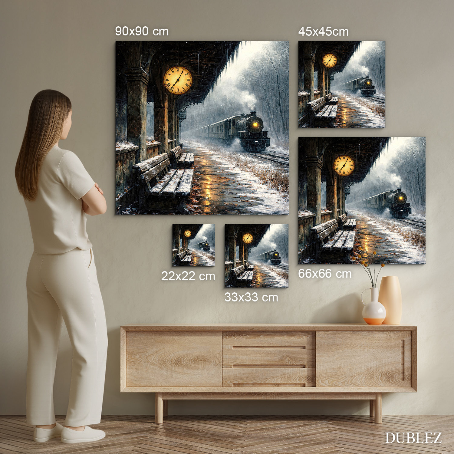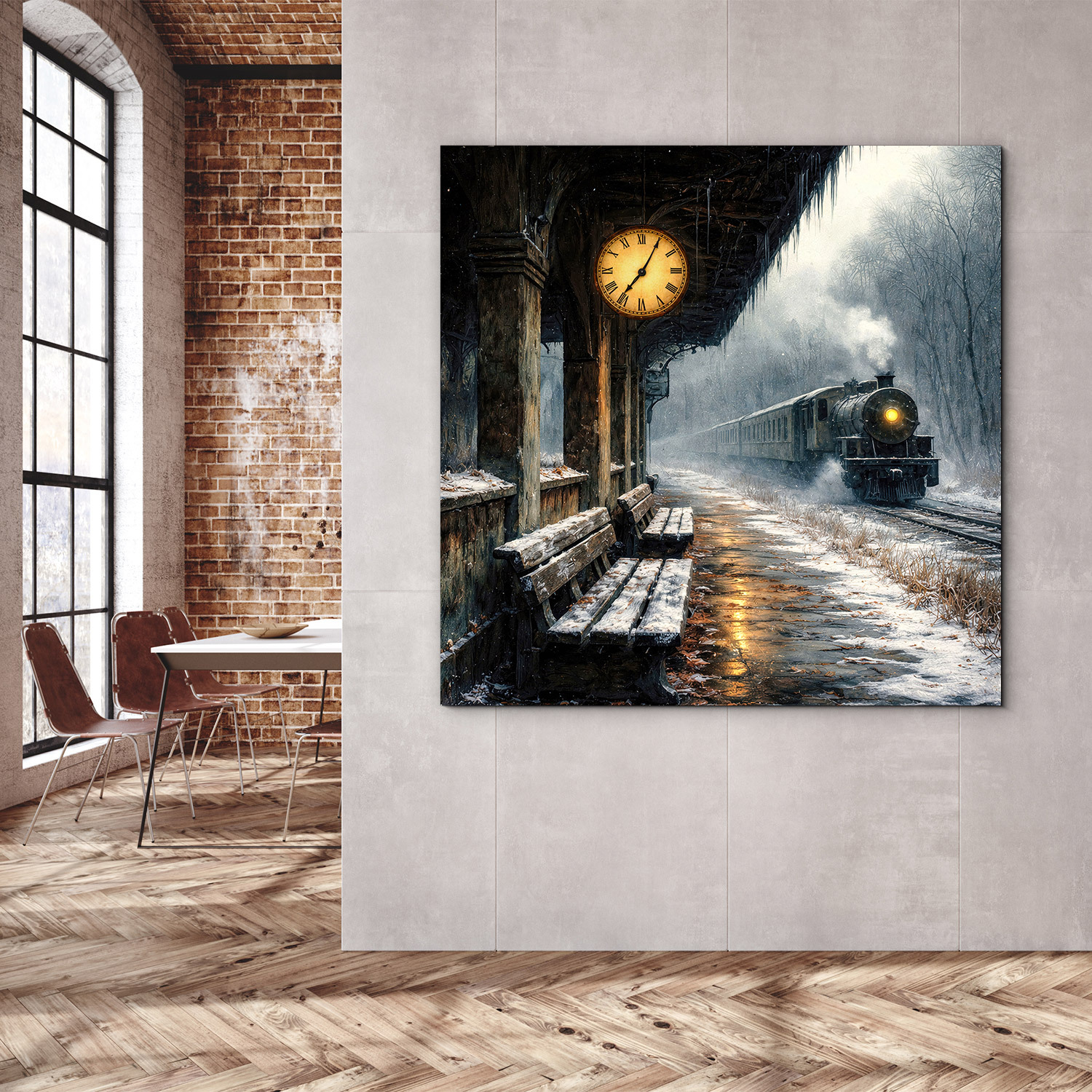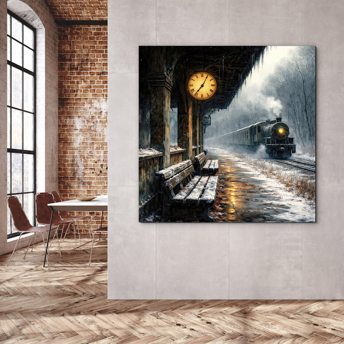 Význam obrazu: Motív zimnej stanice s prichádzajúcim vlakom symbolizuje cestu, očakávanie a plynutie času. Hodiny nad prázdnym perónom pripomínajú chvíle rozhodnutí, návratov aj nových začiatkov, zatiaľ čo vlak v diaľke nesie atmosféru tajomstva, pohybu a spomienok.