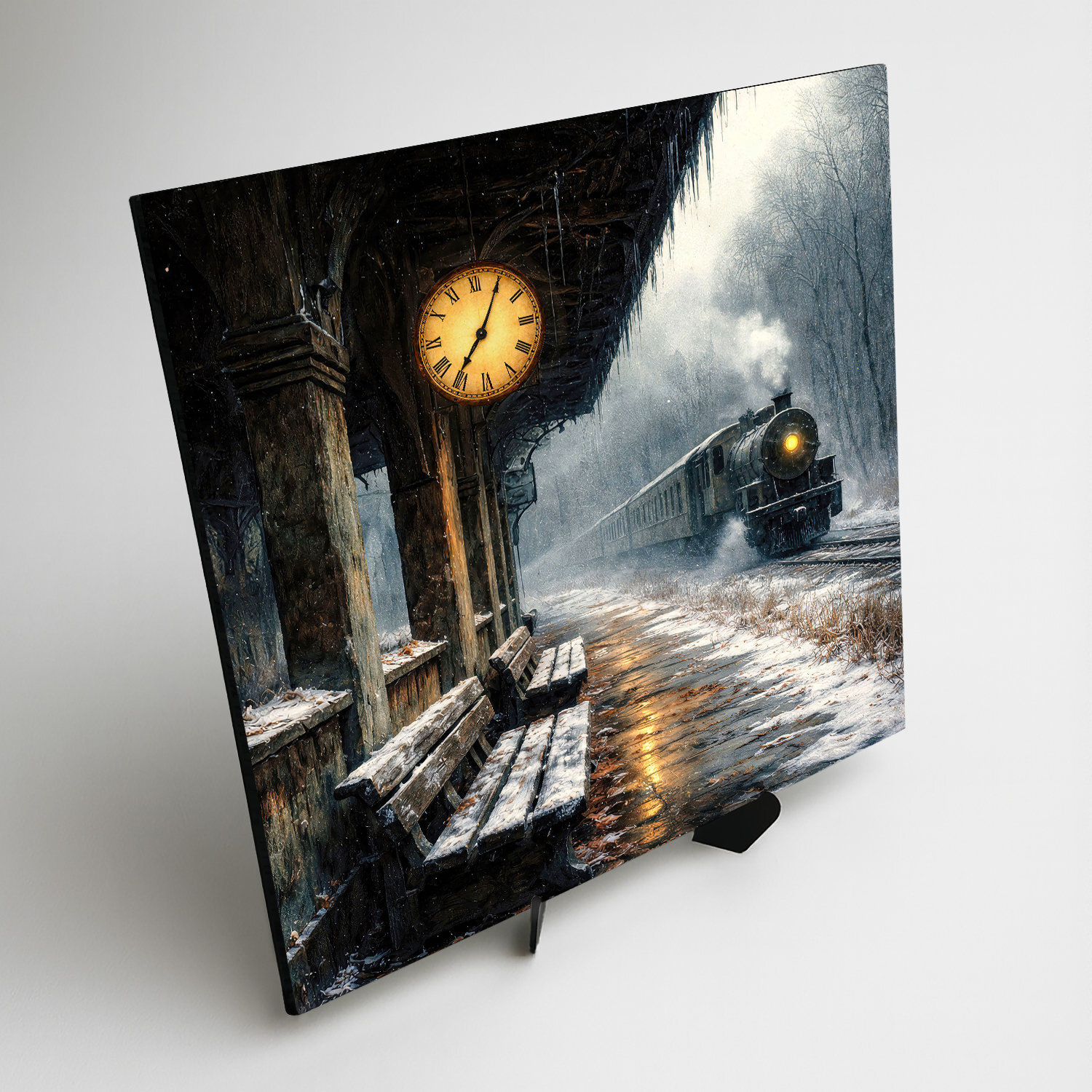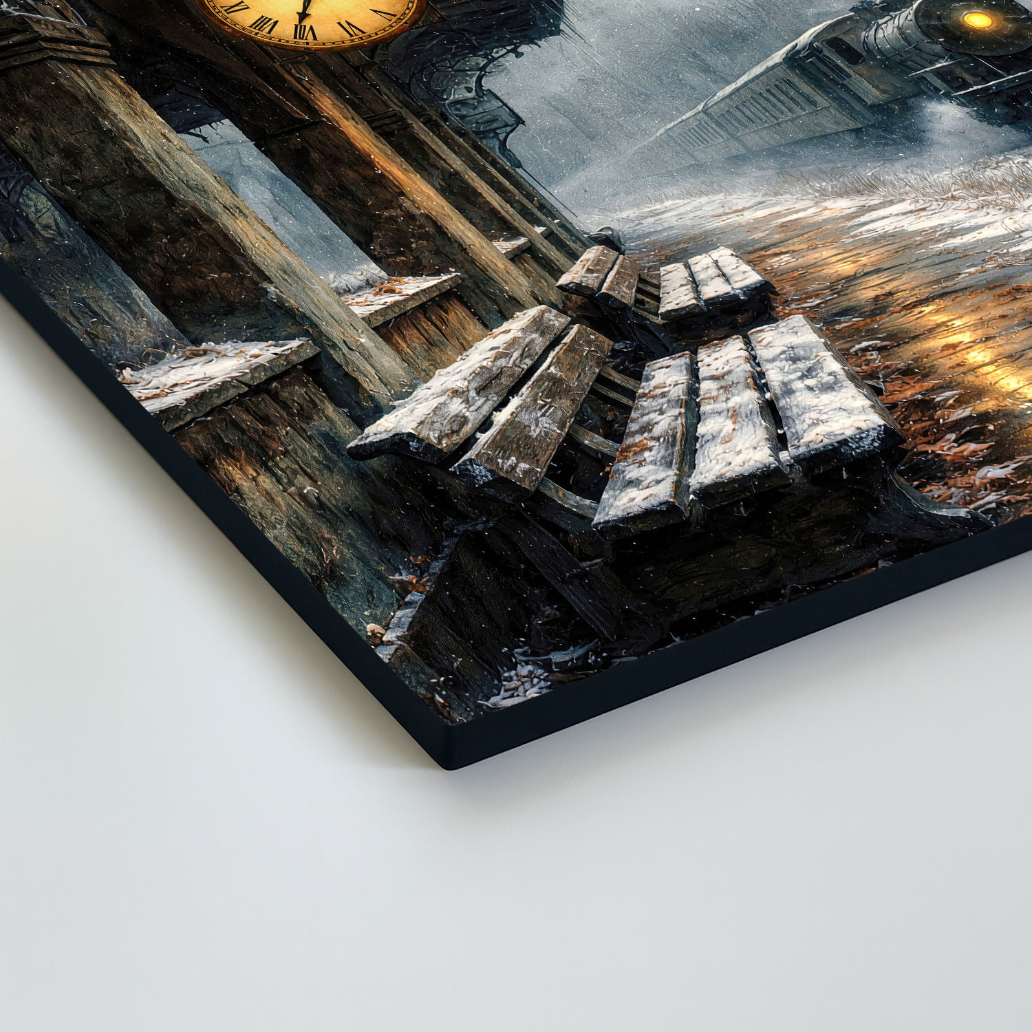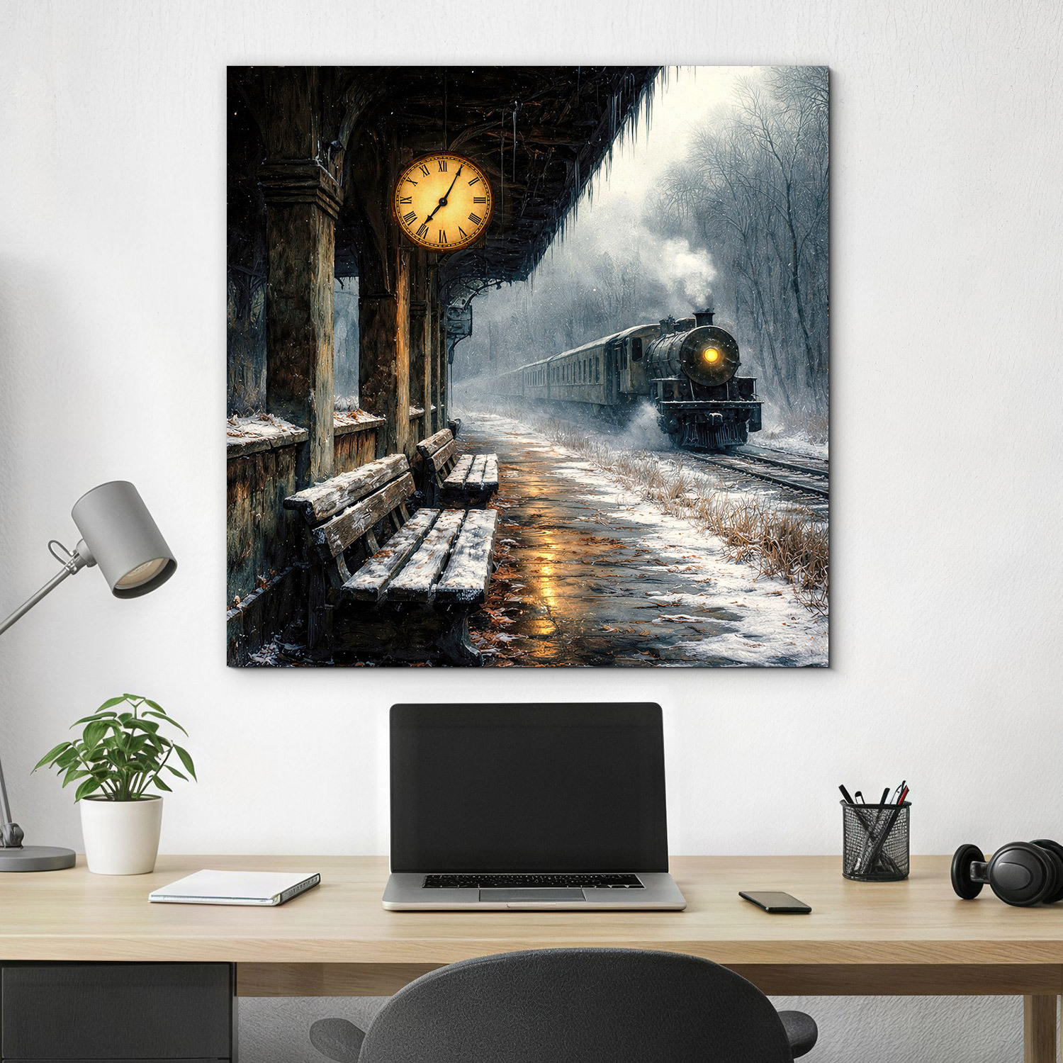 Význam obrazu: Motív zimnej stanice s prichádzajúcim vlakom symbolizuje cestu, očakávanie a plynutie času. Hodiny nad prázdnym perónom pripomínajú chvíle rozhodnutí, návratov aj nových začiatkov, zatiaľ čo vlak v diaľke nesie atmosféru tajomstva, pohybu a spomienok.