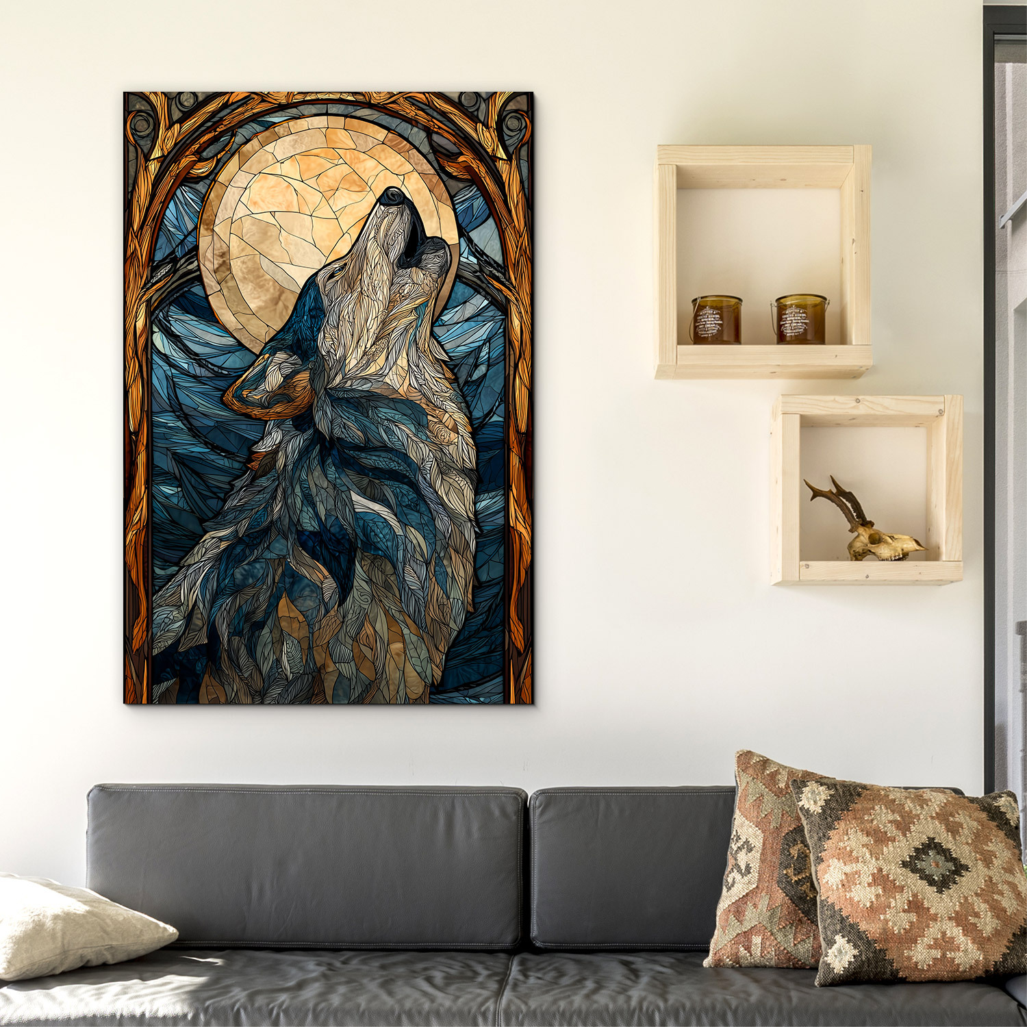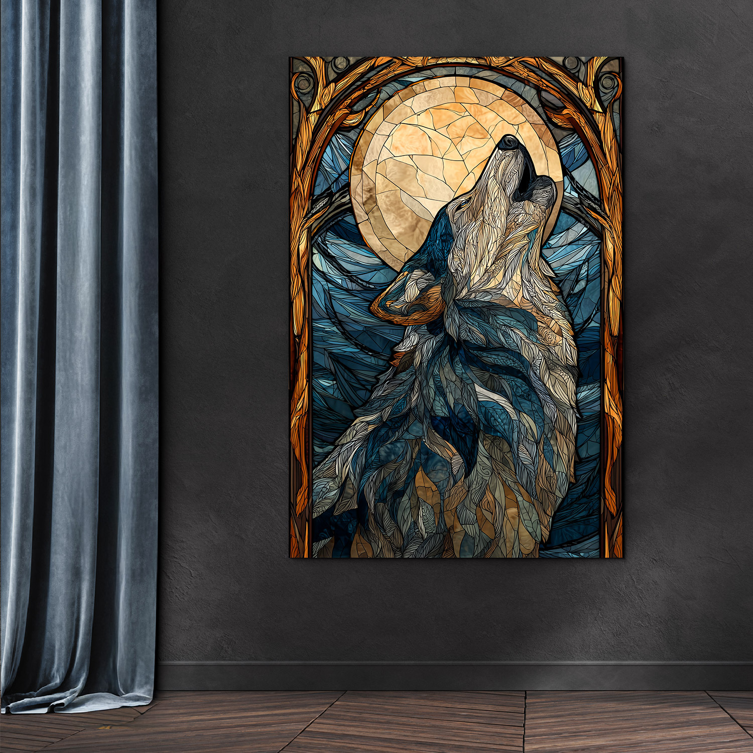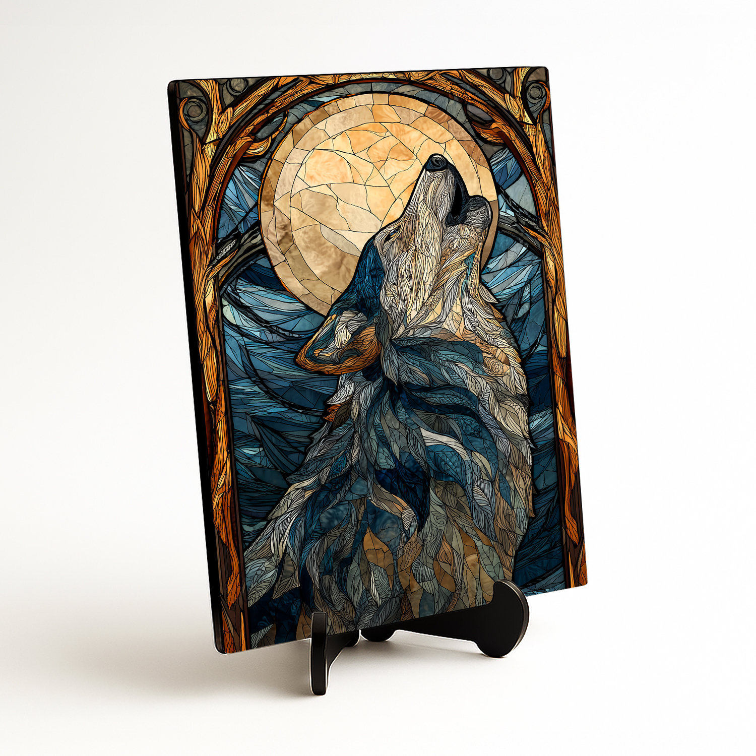 Farebný obraz vlka v originálnom vitrážovom štýle v sebe spája silu divočiny, tajomnú krásu noci a výrazný umelecký dizajn. Tento drevený obraz vyjúceho vlka pod mesiacom je doplnený o modré, zlaté a sivé farby, ktoré vyniknú v obývačke, kancelárii, spálni aj na štýlovej chalupe. Skvele sa hodí do rustikálneho, moderného, prírodne ladeného aj mystického interiéru a zároveň poteší ako originálny darček pre milovníkov vlkov, divokej prírody a lesa.