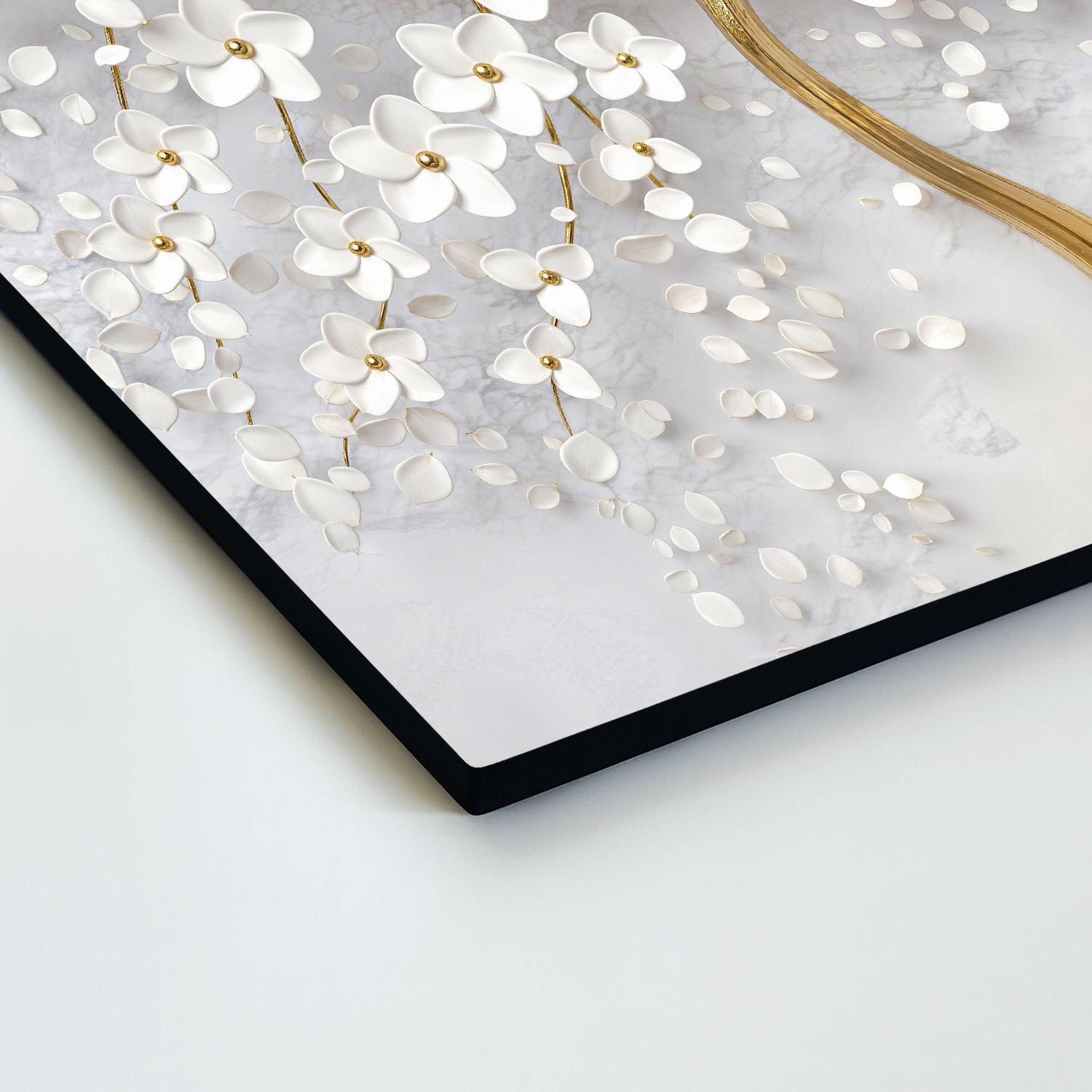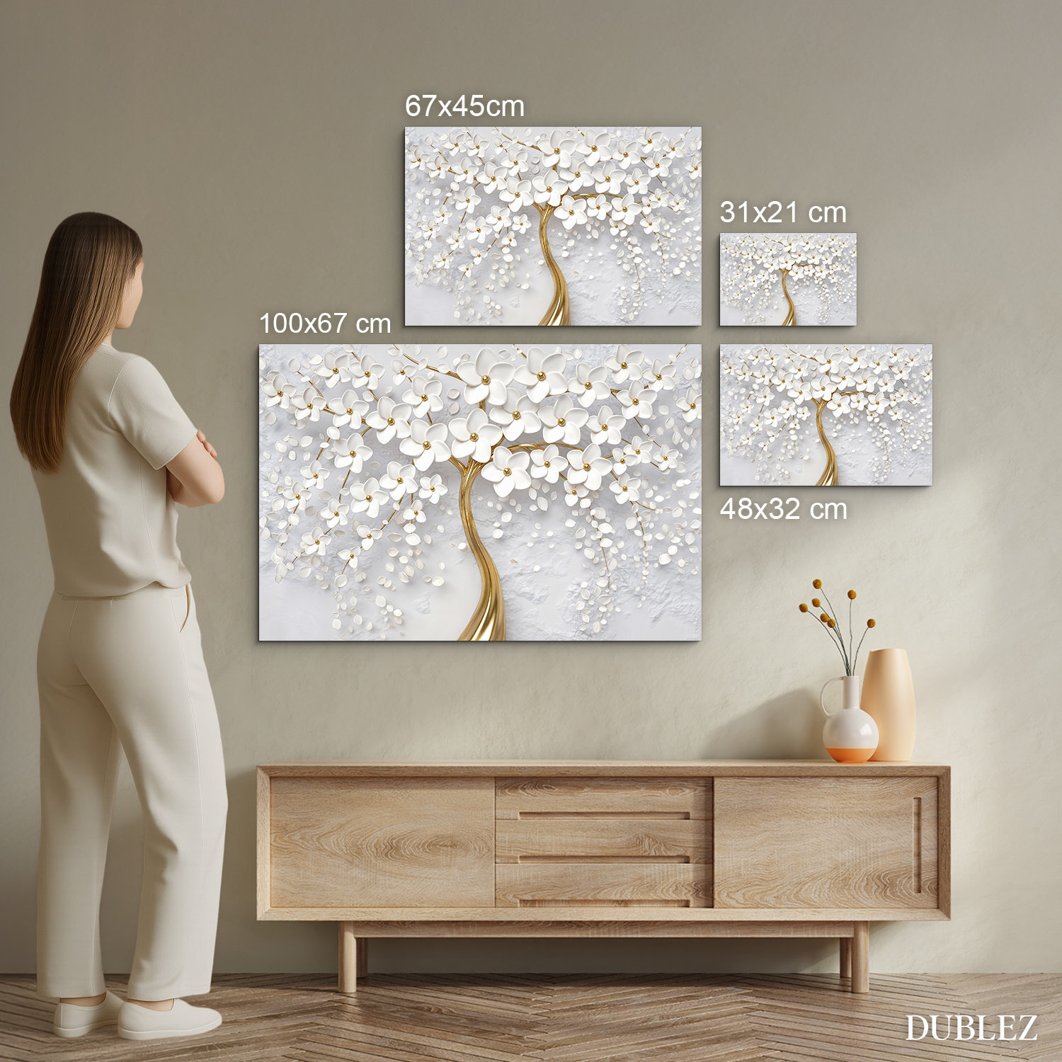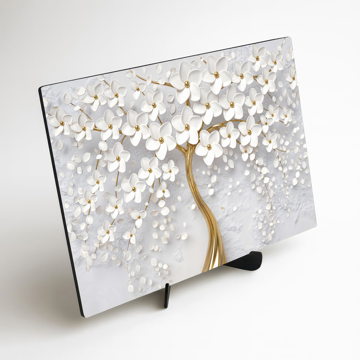 Zlatý strom so zaobleným kmeňom a bohatou korunou posiatou bielymi kvetmi vyniká svojím detailným spracovaním a 3D efektom, ktorý vytvára hĺbku a jemný lesk. Každý lístok a kvet na tomto obraze pôsobí ľahko, akoby sa vznášal. Ideálny obraz do svetlých, vzdušných interiérov, kde má každá dekorácia svoj význam – do obývačky, spálne, predsiene alebo kuchyne. Vďaka kombinácii jemnej bielej a elegantnej zlatej vnáša do miestnosti ľahkosť, sviežosť a dotyk luxusu.​