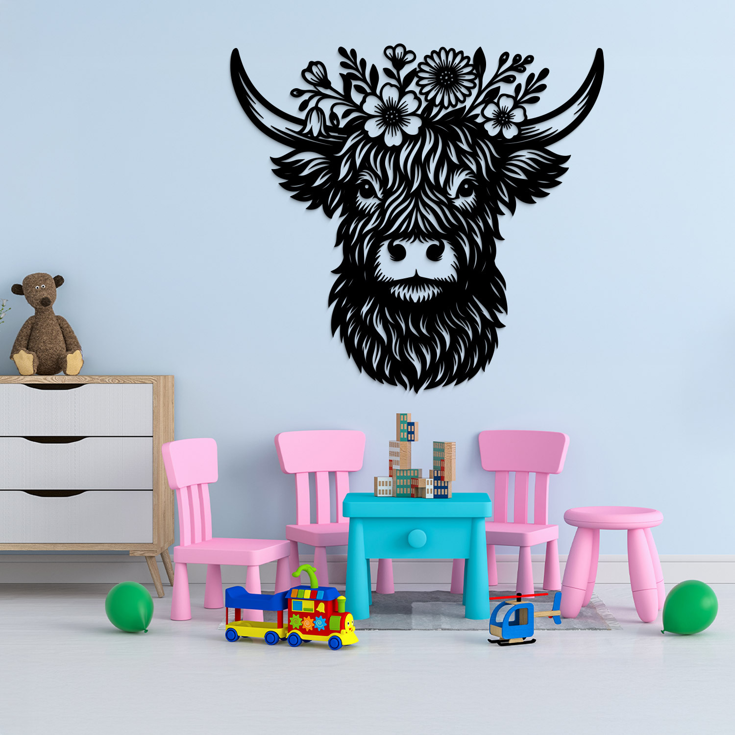 Roztomilá drevená kravička s čelenkou z kvetov je veselá dekorácia, ktorá okamžite rozžiari detskú izbu. Skvelý doplnok do herničky či jasličiek, ktorý prinesie úsmev na tvár každému dieťaťu. Výborne sa hodí aj ako darček pre deti a rodičov alebo ako originálna dekorácia do domácnosti vo farmárskom či vidieckom štýle.