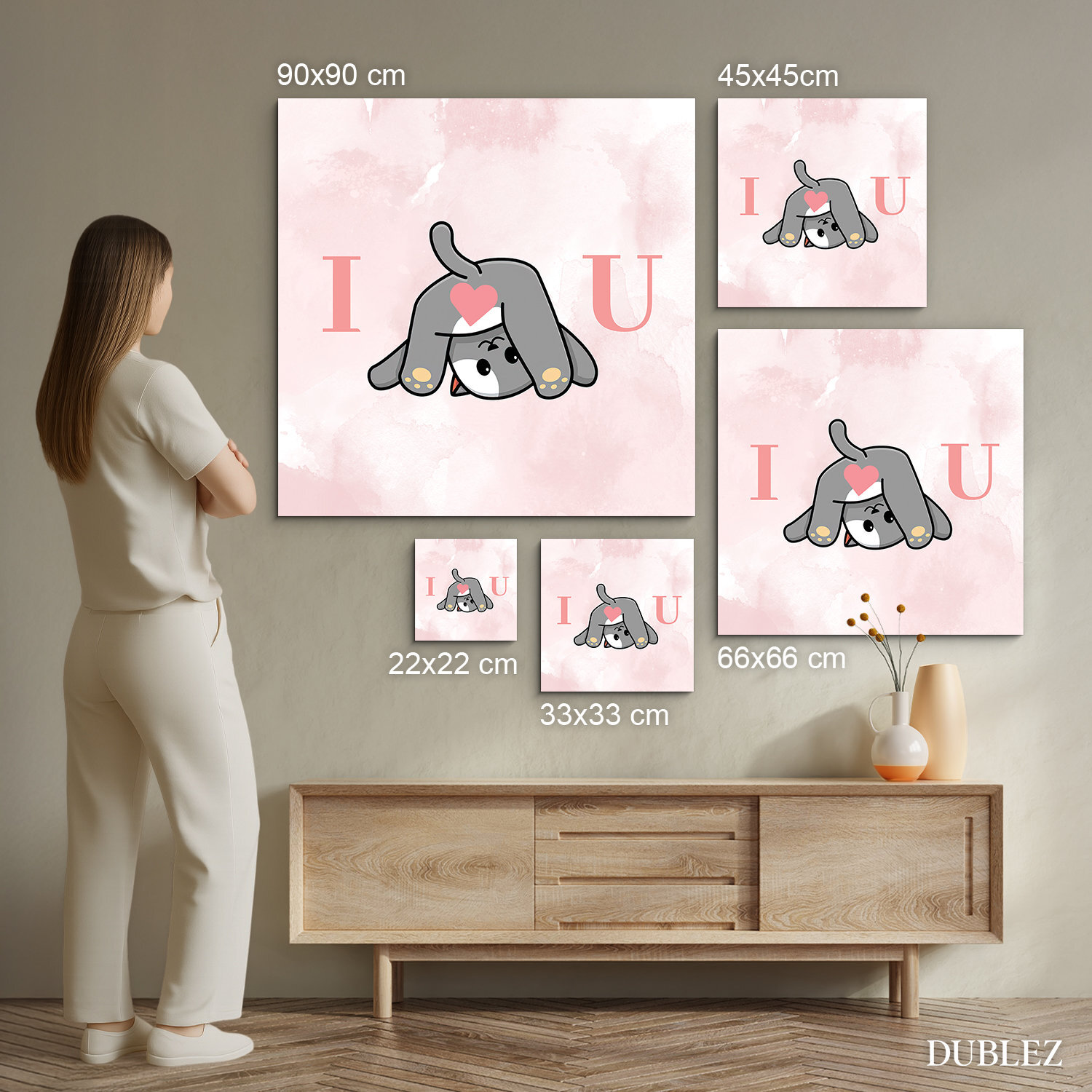 Veselý drevený obraz s mačičkou, ktorý vyjadruje „I ♥ U“, je ideálnym spôsobom, ako dodať interiéru hravosť a lásku. Jemné pastelové pozadie a milý dizajn obrazu z neho robia pekný doplnok na akúkoľvek stenu. Drevený obraz je originálnym darčekom na Valentína, výročie alebo inú romantickú príležitosť. Rovnako poteší aj najlepšiu kamarátku či sestru k narodeninám.