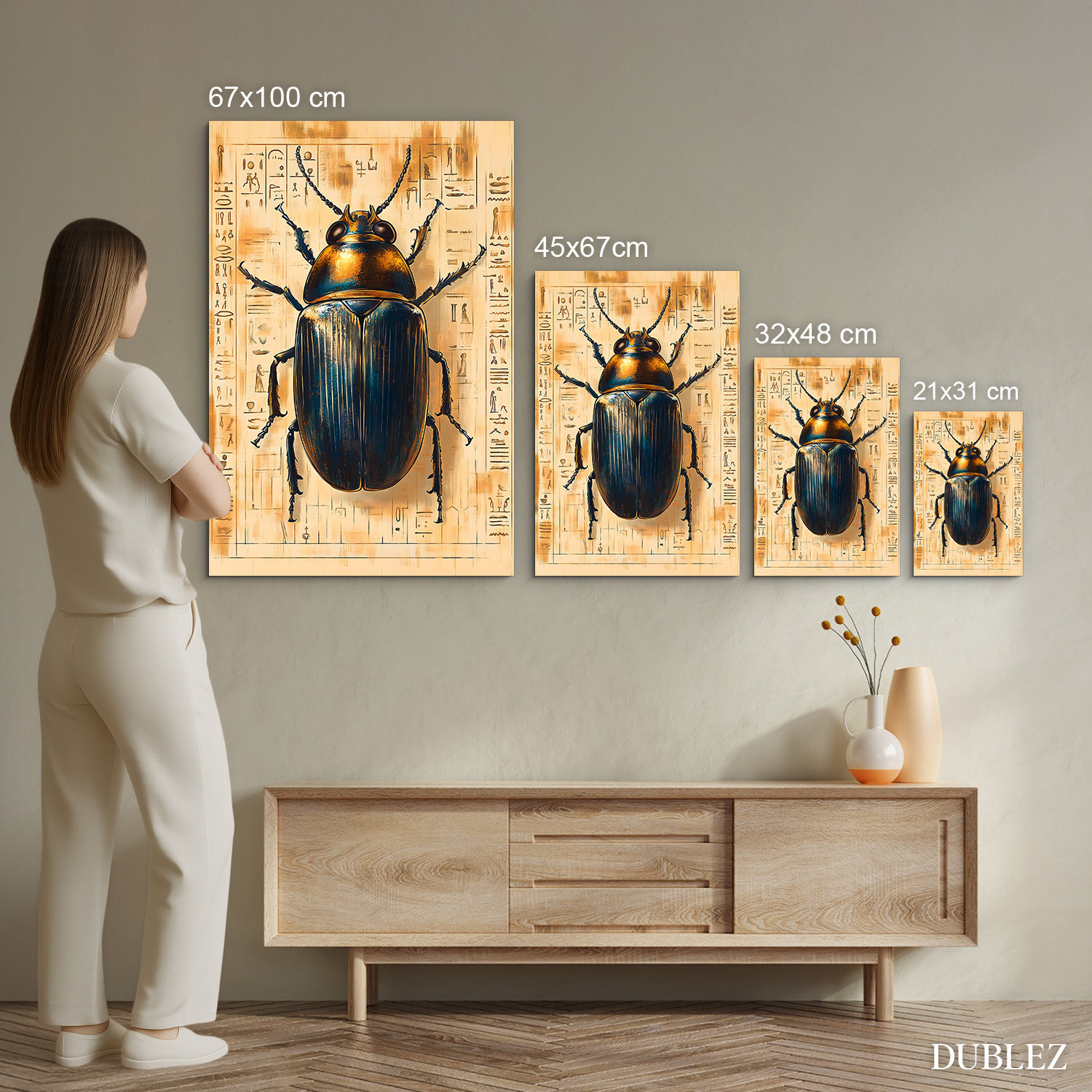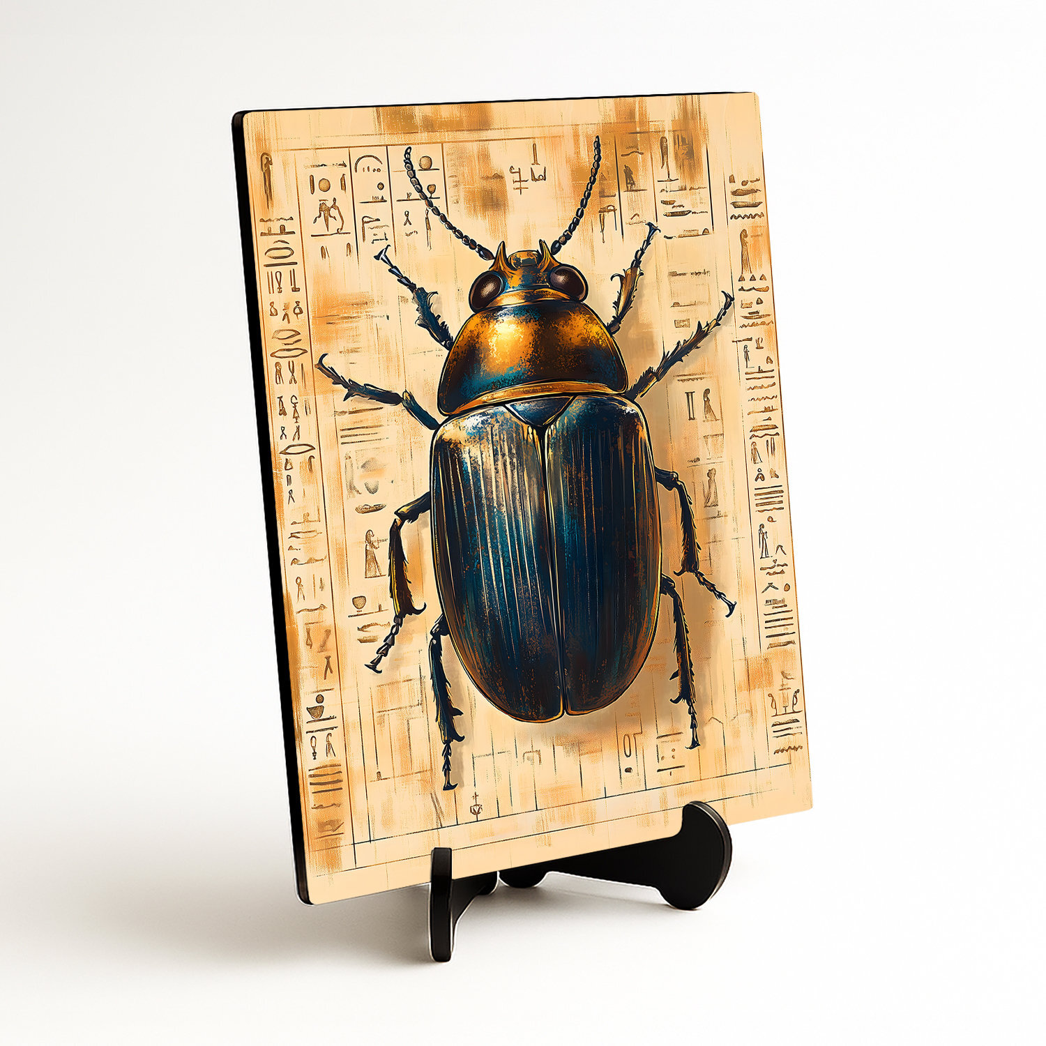 Objavte drevený obraz egyptského skarabea na pozadí pripomínajúcom staroveký papyrus. Metalické tóny kobaltovo modrého a bronzového lesku vynikajú na krovkách a hrudi skarabea. Celý obraz rámujú hieroglyfy, ktoré vytvárajú dojem starožitného obrazu. Vďaka spojeniu realizmu a historického nádychu je tento obraz ideálnou dekoráciou do pracovne, knižnice alebo galérie. Perfektné pre milovníkov egyptskej kultúry a dizajnu. Pridajte do svojho domova kúsok, ktorý rozpráva príbeh.