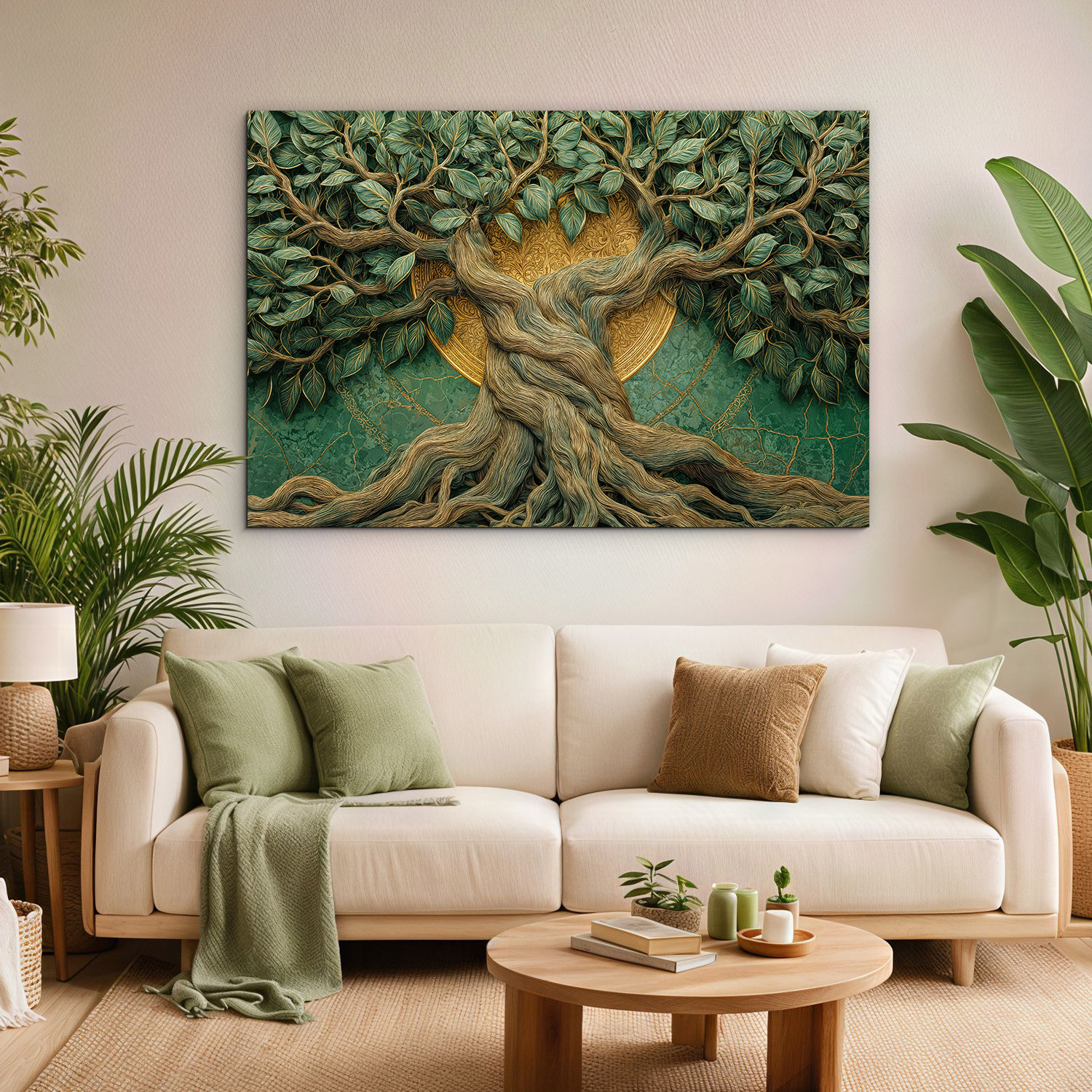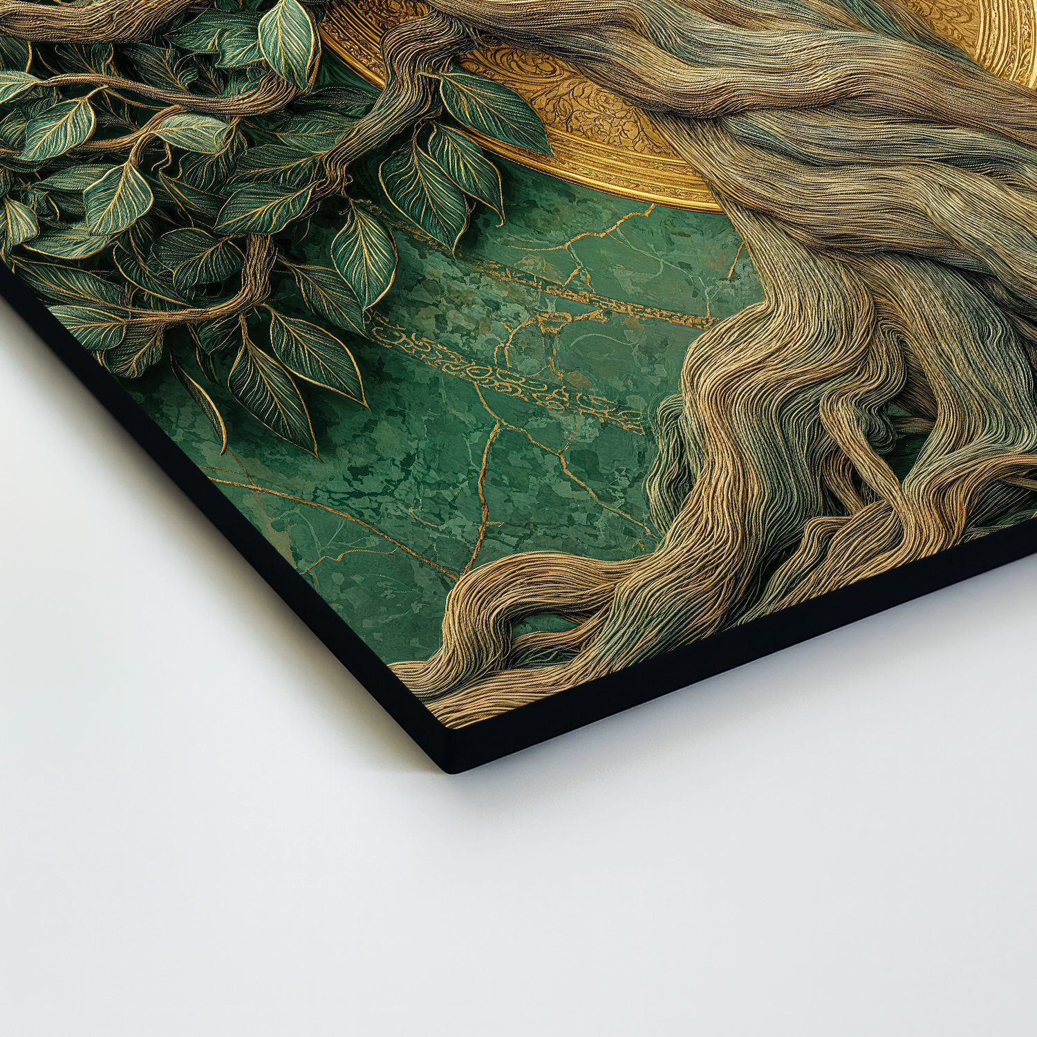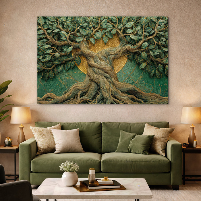 Luxusný drevený obraz s motívom prastarého stromu života spája prírodnú silu s moderným dizajnom. Farebný obraz stromu s mohutným kmeňom a bohato rozvetvenou korunou pôsobí ako umelecké dielo plné symboliky. Prepletené korene a vetvy v odtieňoch zelenej a zlatej vytvárajú harmonický celok, ktorý okamžite upúta pozornosť. Zlatý kruh v pozadí zvýrazňuje silu a motívu, vďaka čomu sa obraz stane krásnym doplnok v obývačke, spálni či kancelárii.