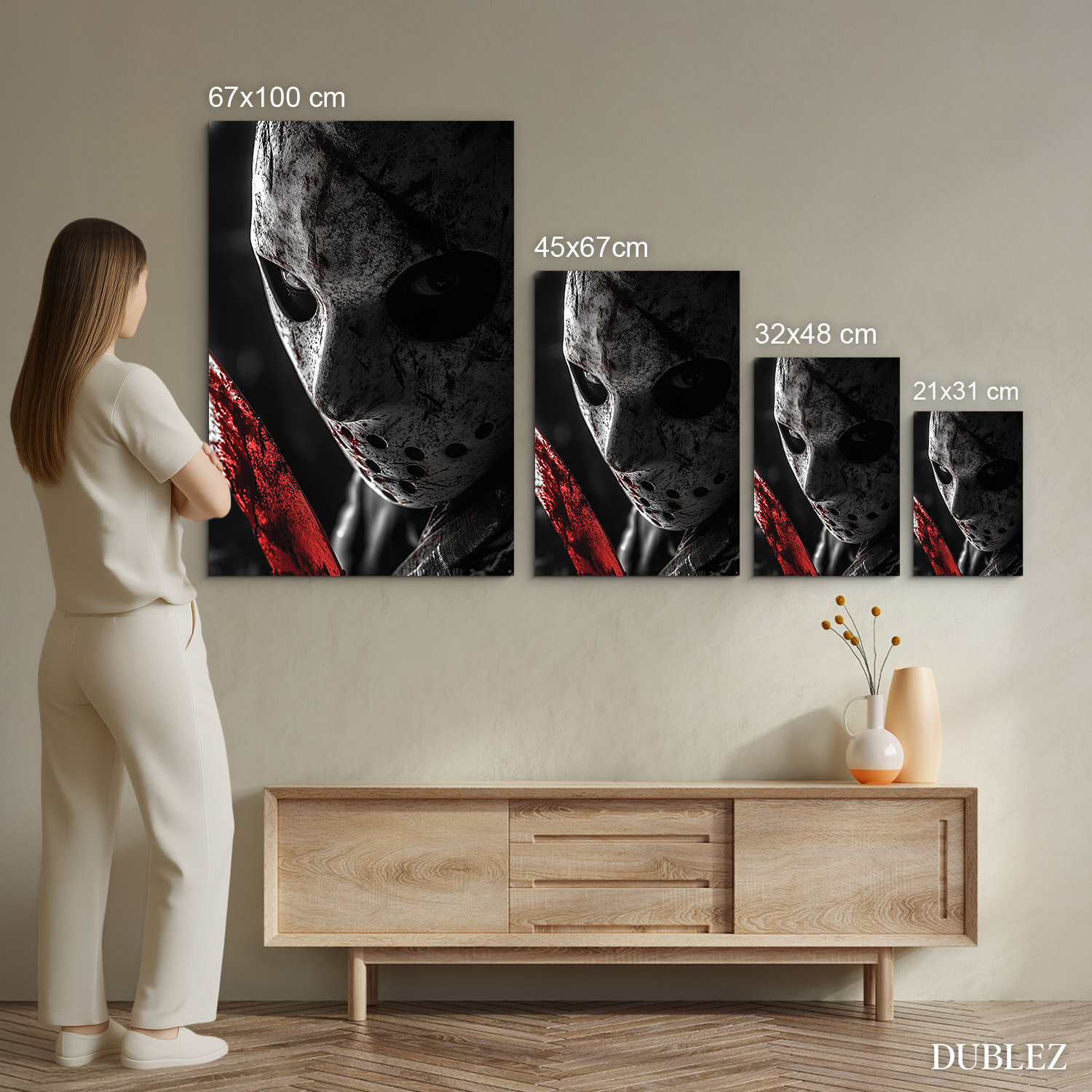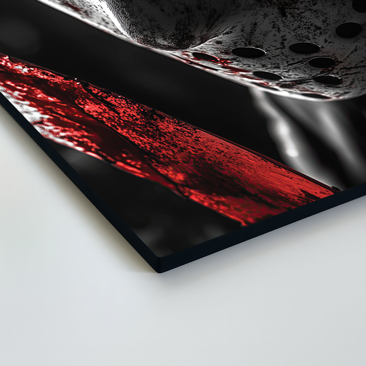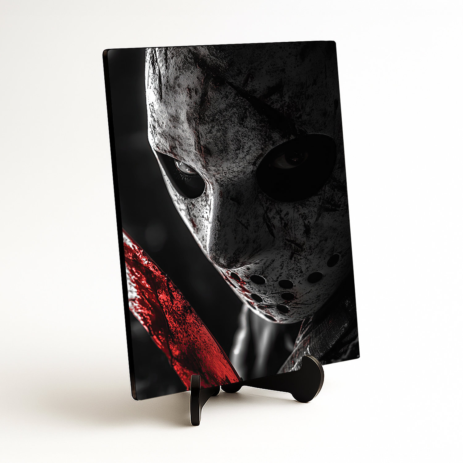 Drevený obraz zachytáva postavu s hokejovou maskou, ktorú okamžite spozná každý milovník hororových filmov. Maska je špinavá, posiata škrabancami a krvavými stopami. Z obrazu vystupujú hrozivé oči, ktoré sledujú diváka s chladným, znepokojivým pohľadom. Obraz je dokonalým bytovým doplnkom pre milovníkov hororu a fanúšikov ikonických postáv z klasických slasher filmov.